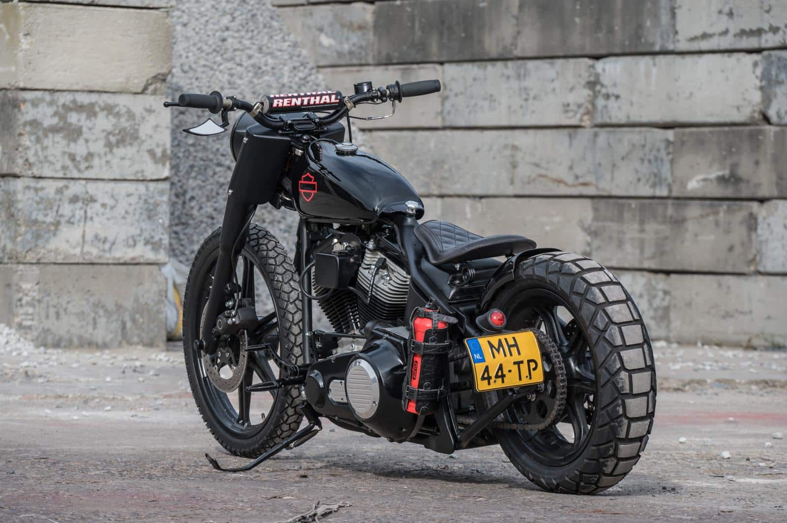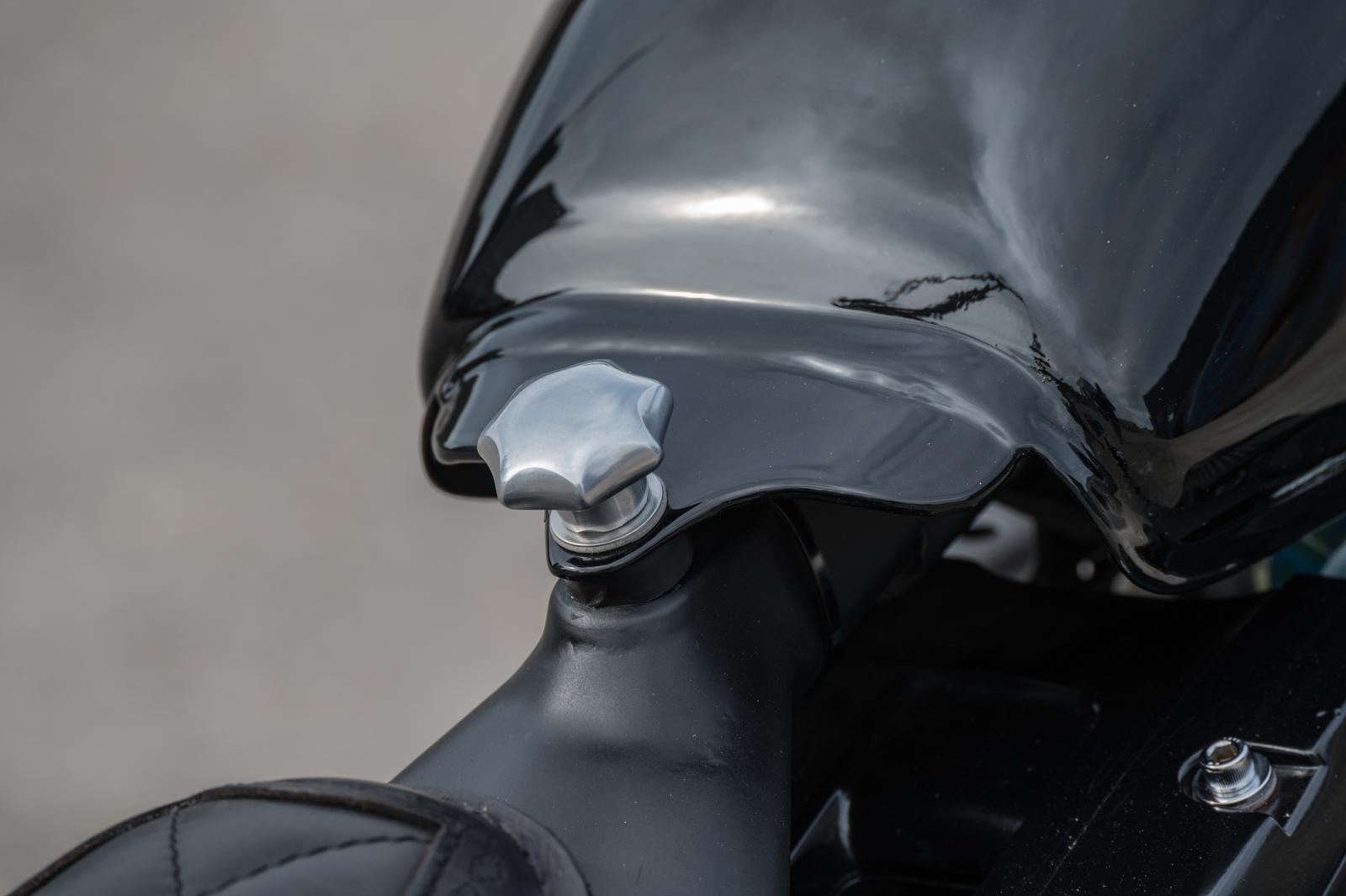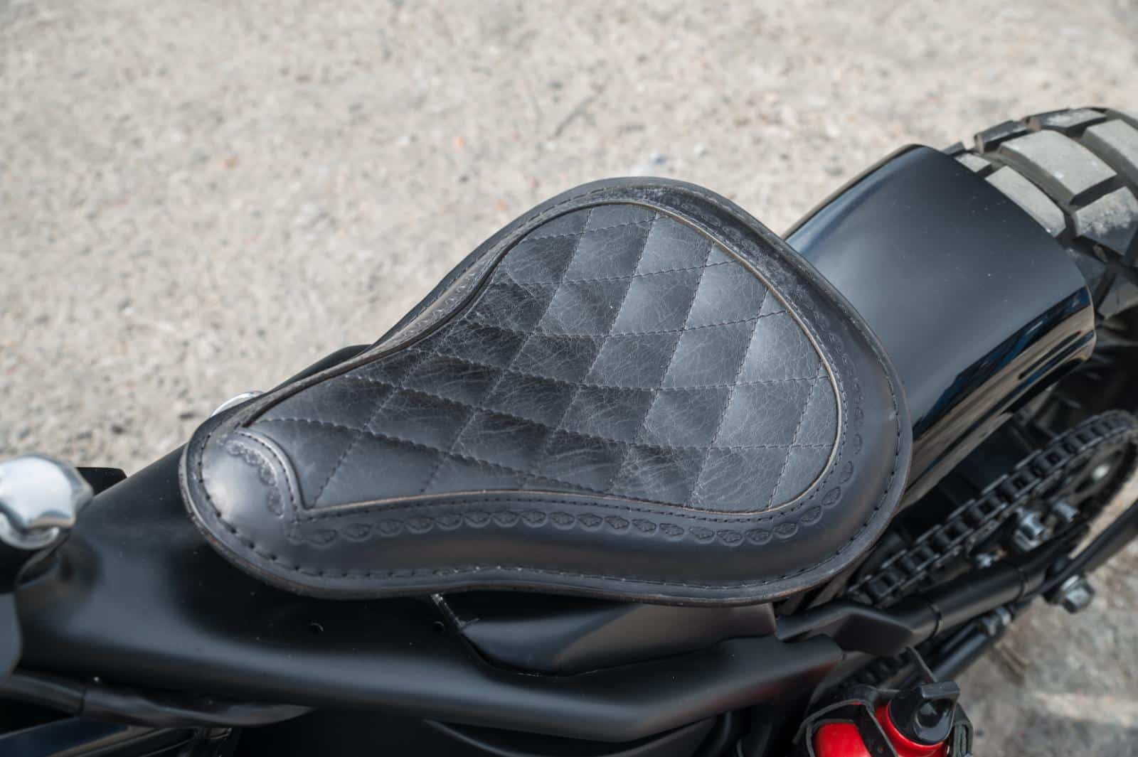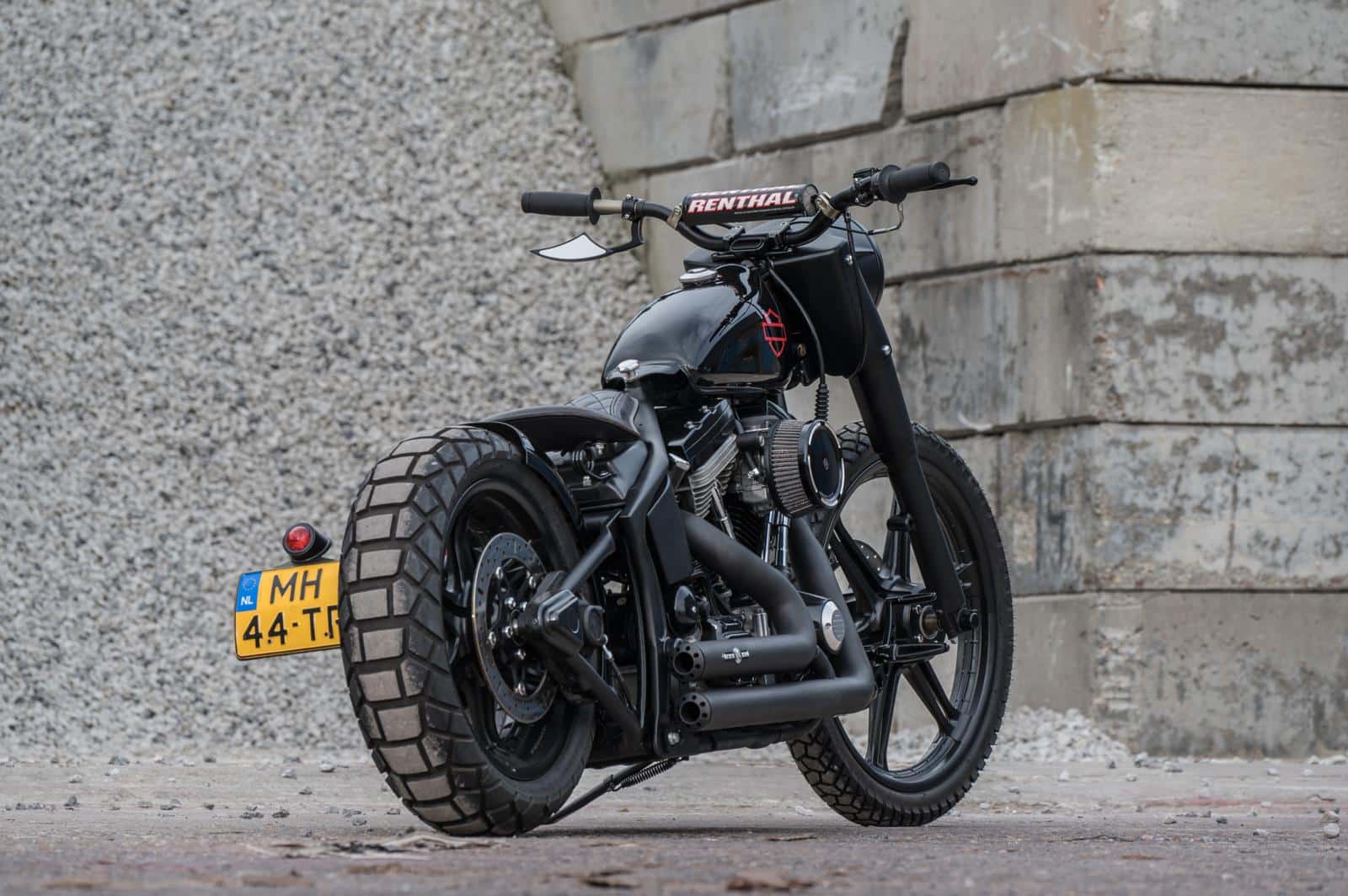 Door eerdere projecten had Egon al veel ervaring opgedaan. “Al doende leert men,” zegt hij nuchter. Bovendien kon hij altijd terugvallen op mensen die weten waar ze het over hebben, zoals de bevriende motorbouwer Rik Terhurne. “Als ik onderdelen nodig had, wist Glenn van King Motorcycles altijd precies wat ik moest hebben.” Op Marktplaats vond hij een set 16- en 19-inch wielen van een Dyna. Het korte achterspatbord laat veel van de ruige crossband zien, terwijl het compacte tankje, afkomstig van een oude Yamaha-crosser, hoger op het frame werd geplaatst dankzij een dichtgelaste tunnel.