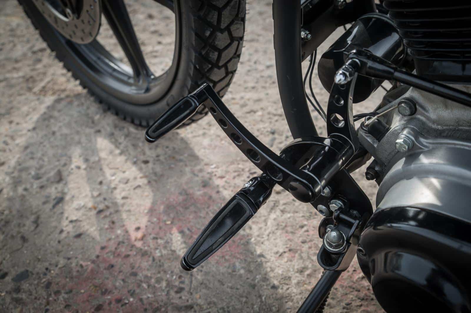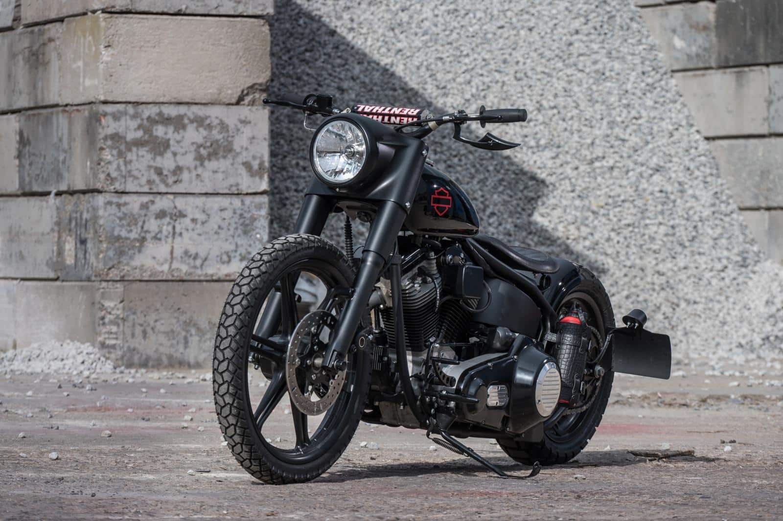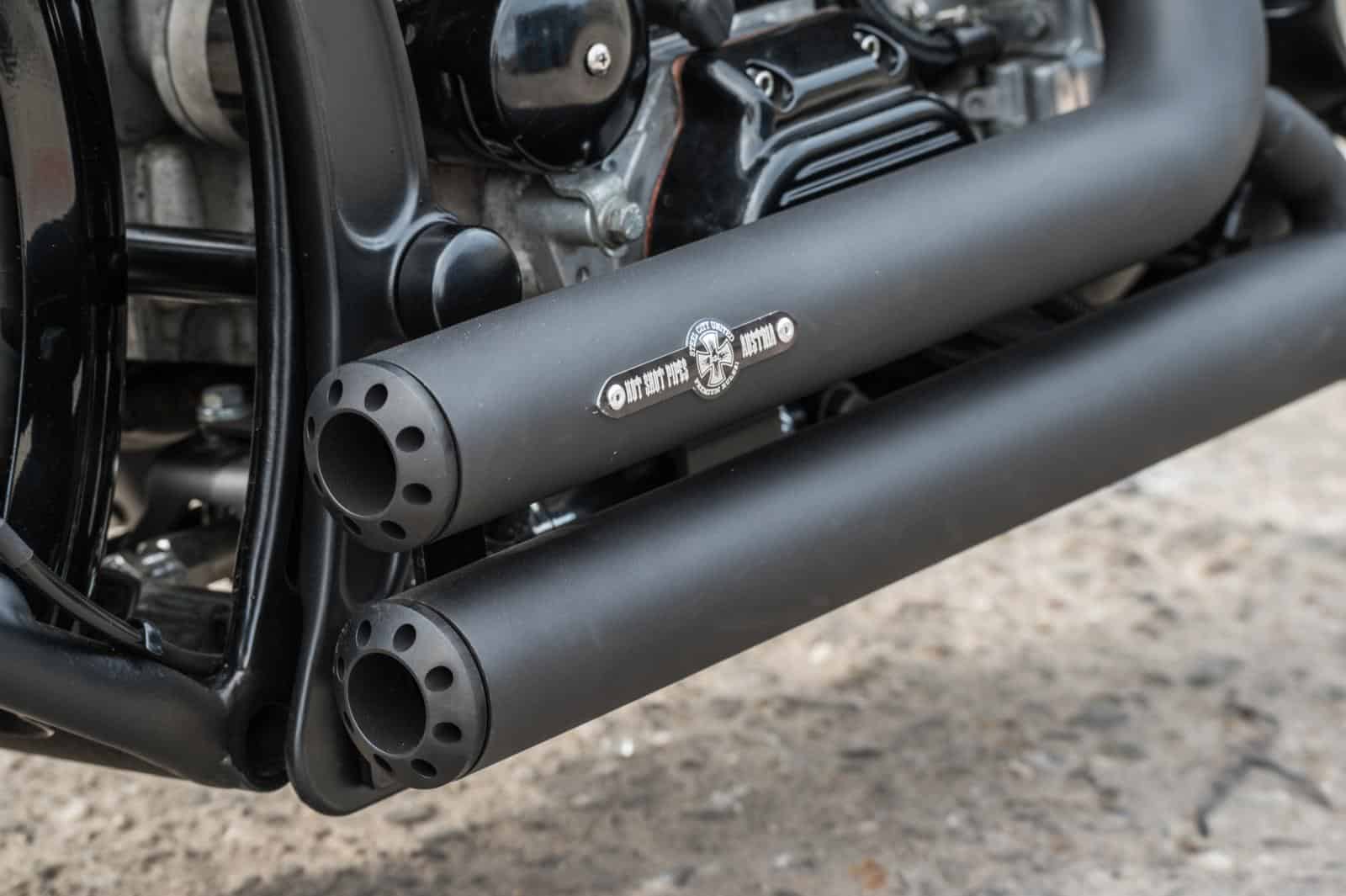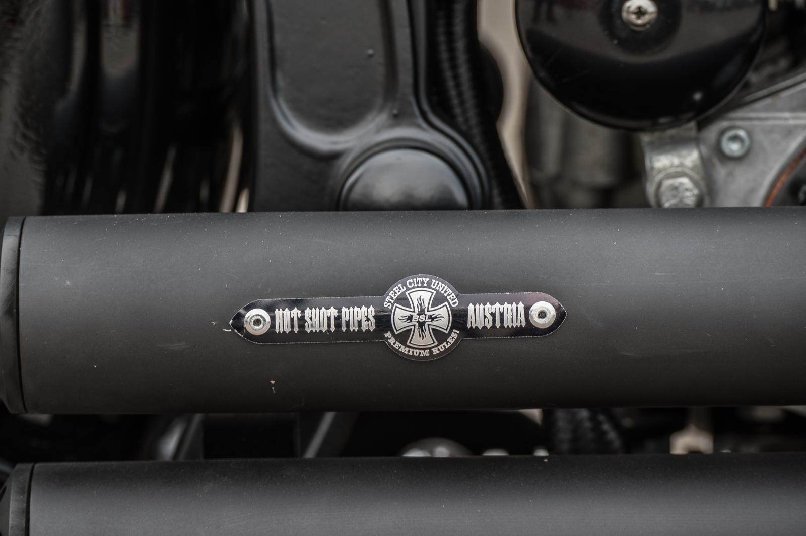 Voor de stoere en gespierde uitstraling van de motor vond Egon inspiratie in de houding van de Norwich terriër, een hond die Egon ook zelf bezit. Breed van voren, slank vanachter. Glenn vond een passende Shovel voorvork met ossenkop die verlaagd werd om de juiste lijn te creëren. Een eigenwijs Renthal motorcross-stuur maakt het plaatje af. De zoektocht naar de juiste onderdelen ging verder: een luchtfilter van Arlen Ness geeft de motor een sportieve uitstraling. Op de Custombike-beurs in Bad Salzuflen vond Egon een set uitlaten van BSL. “Strakke shotguns, zonder poeha; precies wat ik zocht.” Het lassen, slijpen en strak zetten van het frame kostte vele uren, maar dat deerde hem niet. “Het is gewoon leuk werk. Daardoor hoefde er nauwelijks plamuur op. De kleinste details, zoals het monteren van de K-tech forward controls op exact hetzelfde punt als de zijstandaard, kostten soms een hele dag. Maar het meeste werk zat in het zoeken naar de juiste onderdelen.”