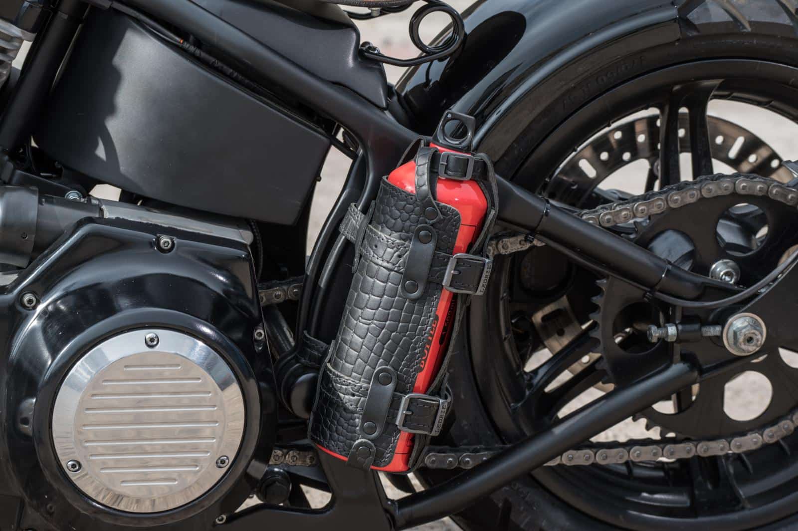 De basis werd gevormd door een Evo Softail uit 1988, gekocht bij een Harley-zaak in Friesland. “Het was een soort chopper met vlammen erop. Niet echt mijn smaak en de voorvork had schade. Maar er stond maar 14.000 kilometer op de teller en dat was voor mij doorslaggevend.” Egon pakte het project grondig aan, in samenwerking met King Motorcycles. “Ik heb de motor in grote lijnen zelf opgebouwd en samengesteld. Ook het laswerk heb ik zelf gedaan. Het fijnere werk, zoals de elektronica, leidingen en afstelling, heeft Glenn van King Motorcycles gedaan. En het spuitwerk, een schitterende combinatie van hoogglans- en matzwart, is gedaan door Bram van het Rood. Kijk naar dat logo, dat zit gewoon echt in de lak!”