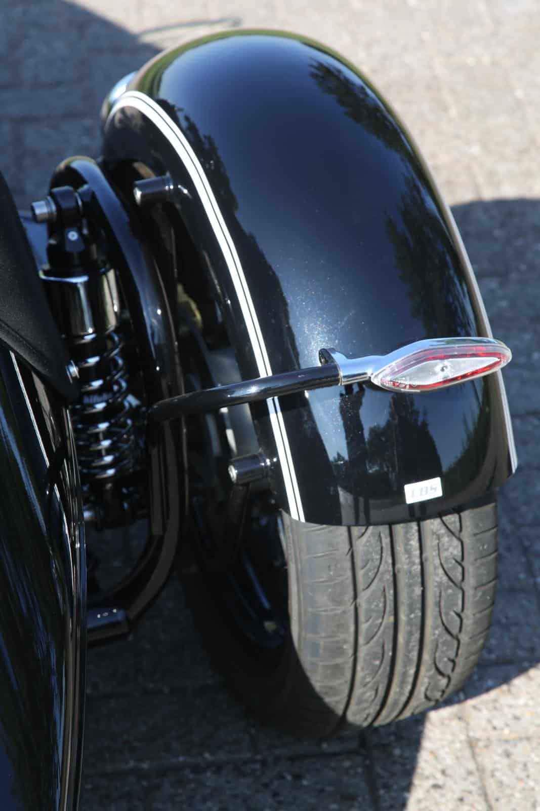 En over rijden gesproken… Voor ik het weet rijd ik de combinatie de straat uit met Ad in mijn kielzog. Op het achterwiel zit een autoband voor lange levensduur en extra stabiliteit. De schommelarm voorvork is perfect afgesteld en de Bitubo achterschokbreker doet goed zijn werk! De zijspancombinatie rijdt heerlijk! Het is zelfs even schrikken hoe makkelijk en licht hij zich laat sturen. Is het met mijn eigen zijspan nog best wel werken om ‘m de bochten door te krijgen, met deze BMW gaat het dusdanig licht en direct dat je ‘m letterlijk met een pink kunt sturen, iets wat voor een zijspan toch echt wel bijzonder is! Er zit een goede balans in de combinatie en mede door de Bitubo’s worden oneffenheden netjes gladgestreken. Ik blijf me verbazen over het stuurgedrag; zó wendbaar, zó licht sturend en zó ongelooflijk makkelijk te corrigeren! Ad ziet mijn vette smile en haalt vervolgens zelf ook nog even wat capriolen uit met ‘de Beemer’, zoals hij ‘m liefkozend noemt. We stoppen weer na nog een half uurtje rijden en lopen een rondje om het span, waarbij Ad nog wat uitleg geeft. “De verlichting aan de voorkant op het zijspan is een LED, met daarin hetzelfde binnenwerk als de koplamp van de motor. Het zijspanspatbord is van MCS en geheel aangepast met ingelaste draadbussen en mooi gebogen spatbordsteunen voor de bevestiging. Het achterlicht is eenzelfde als op de motor, met daarin verlichting, richtingaanwijzer en remlicht.” Dat achterlicht is gemonteerd op een aparte, holle, gebogen steun, waar ook de bedrading door is gevoerd, wat extra mooi en clean oogt. Omdat het doel mede was om de motor weer simpel naar solo terug te kunnen bouwen, is besloten om de rechter richtingaanwijzer wel te behouden, maar via digitale wonderkunsten is deze nu uitgeschakeld.