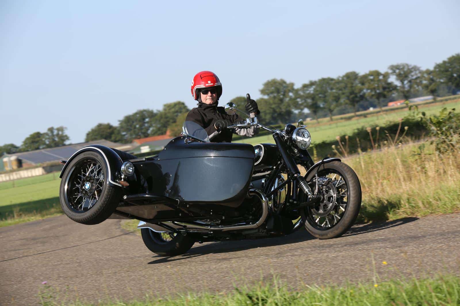 Het ruitje is, natuurlijk, van Brooklands voor de juiste klassieke uitstraling. “Het kuipzitje past perfect bij het geheel en is met een scharnier naar voren te bewegen om in de bagageruimte te komen”, zegt Ad. “Het afdekzeiltje is van cabrio stof, in Duitsland heet dat heel luxe, ‘Porscheverdeck’ en heeft Tenax sluitingen. Rondom zijn er RVS bouten en moeren gebruikt voor de montage van alle onderdelen.” De voorvork, een LBS schommelarm-vork, is dusdanig gemaakt dat de bussen van de voorvork in de standaard lengte van de voorvork passen om de ‘looks’ van een origineel uitziende BMW te behouden. In de schommelarm-voorvork zijn Bitubo schokdempers gebruikt, is het originele BMW R18 wiel met remmerij gebruikt en is een door LBS gemodificeerd MCS spatbord gemonteerd. De voorkant van de combinatie ziet er prachtig klassiek uit, met de ‘verdekte’ schommelarm-voorvork en de slanke zijspanbak. Van achteren bezien ziet de Beemer er stoer uit, met de twee brede banden en zijn typerende BMW uitlaatdempers. We stappen gauw weer op en rijden over provinciale wegen, door dorpjes en over verlaten boerenweggetjes, langs weilanden, door bossen en genieten van elk moment. Na een mooie rit door het Brabantse Land waarbij we zo nu en dan even van motor wisselen, komen we weer in het pittoreske Gemert terug. Wil ik ‘m hebben? Ja. Graag zelfs. Heb ik geld? Nee. Heb ik ruimte? Ook niet. Dus is het aan iemand anders om hier heel veel rijplezier mee te gaan beleven en daar zullen dan ongetwijfeld veel mensen best wel jaloers op worden!