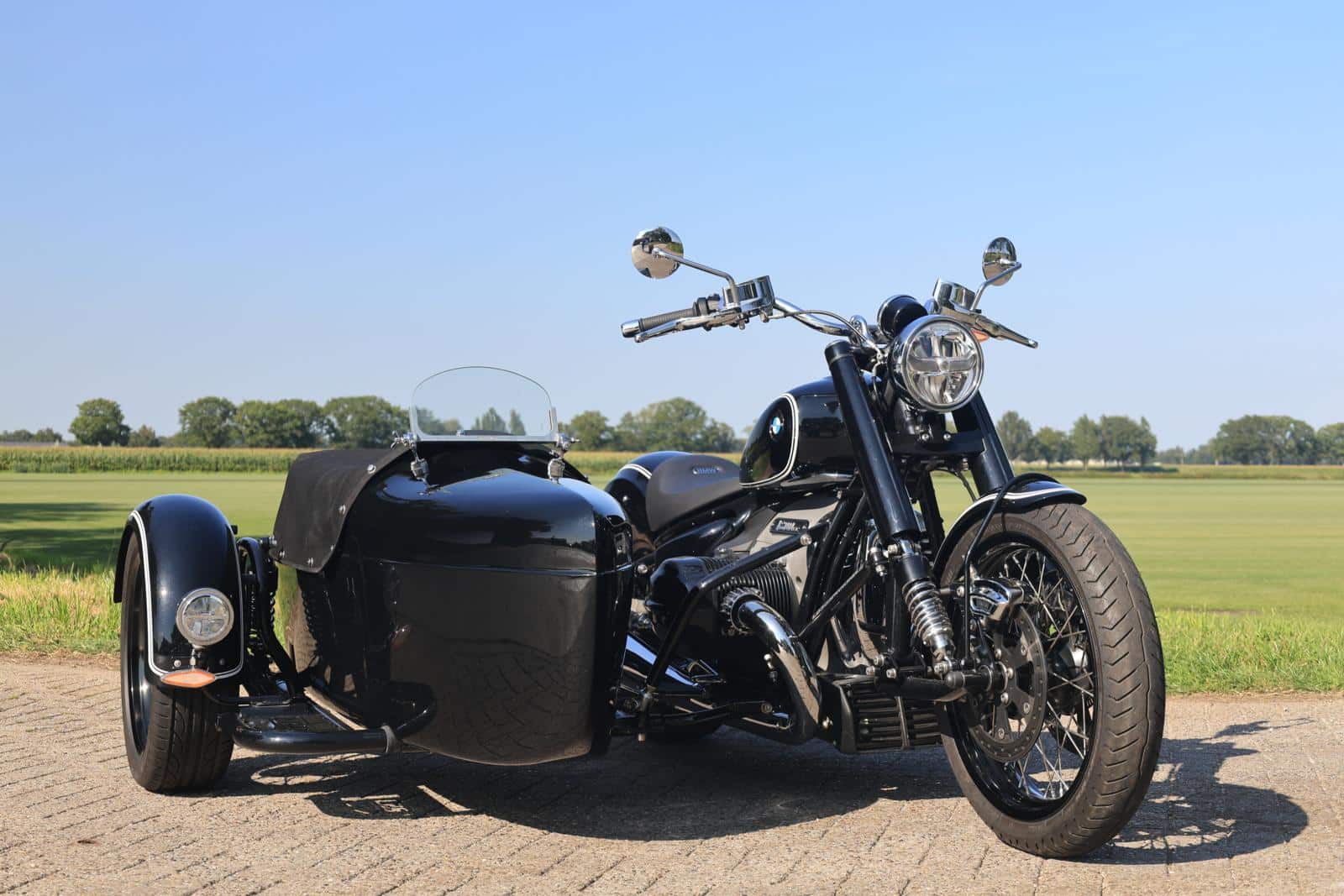 Er is juist de laatste hand gelegd aan een BMW R18 in de klassieke uitvoering met een prachtig daarbij passend Faro zijspan. De combinatie staat in zon te glimmen, terwijl het dikke boxerblok zachtjes tikkend afkoelt na de laatste proefrit.