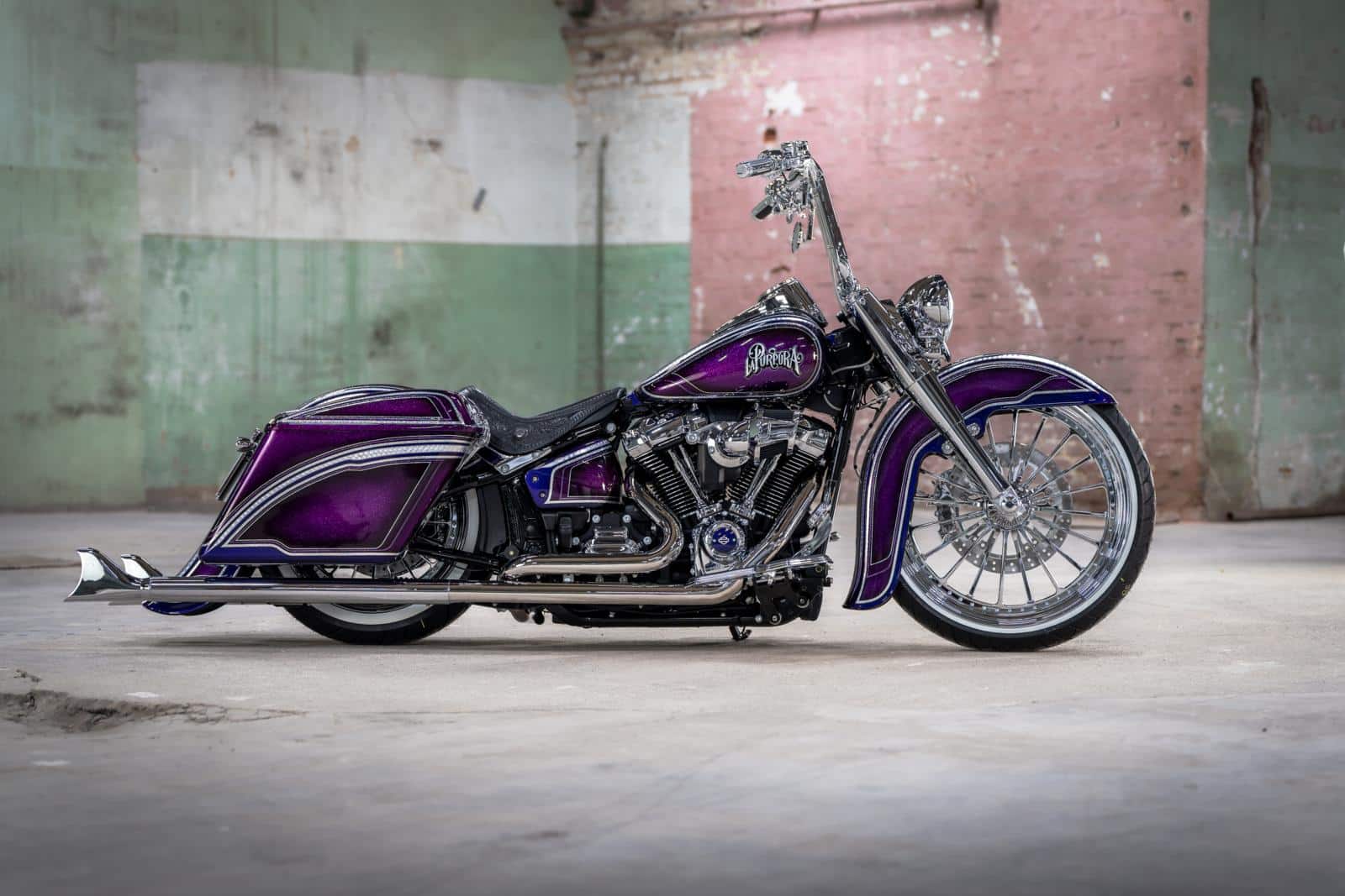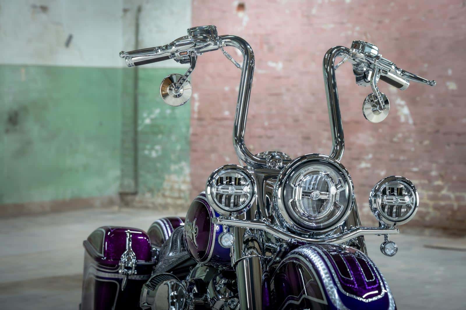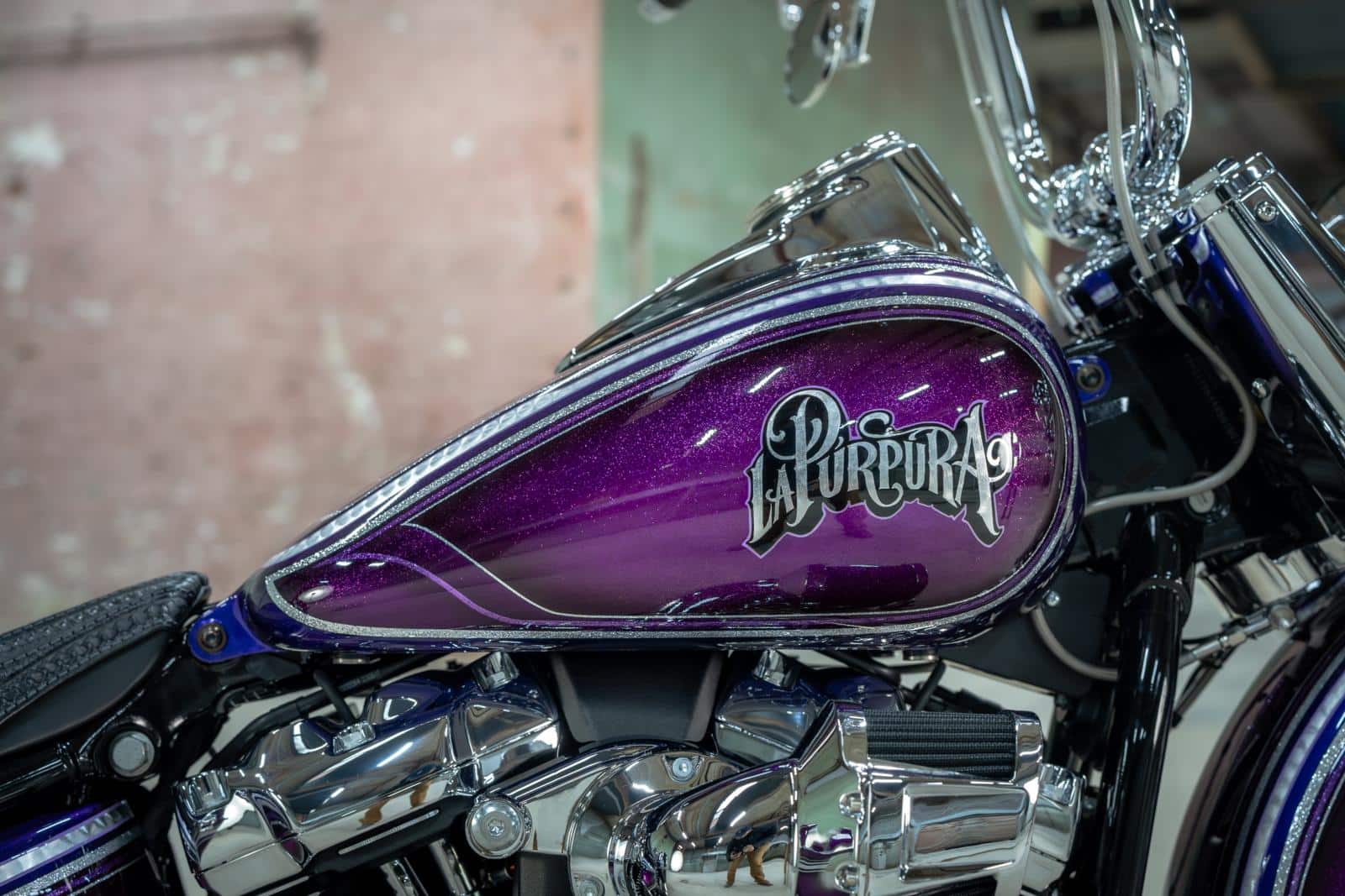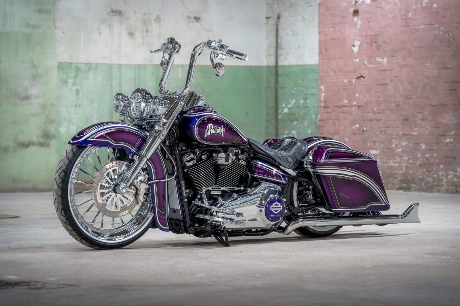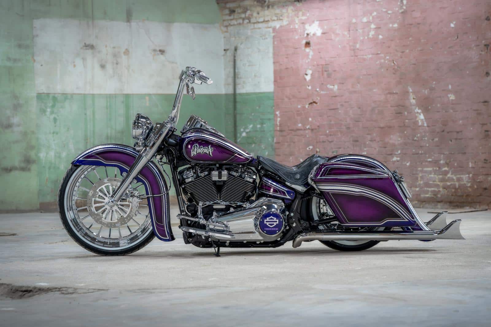 De custombouwers van het Duitse Thunderbike genieten inmiddels een ijzersterke reputatie als het gaat om Chicano’s. Toch leggen ze elke keer de lat voor zichzelf een stukje hoger en dat betekent ook voor deze nieuwe creatie een Chicano zoals ze nog nooit eerder gebouwd hebben; met chromen wielen, extra koplampen, koffers en een ongebruikelijke kleur waarnaar de naam van de bike verwijst: La Purpura!