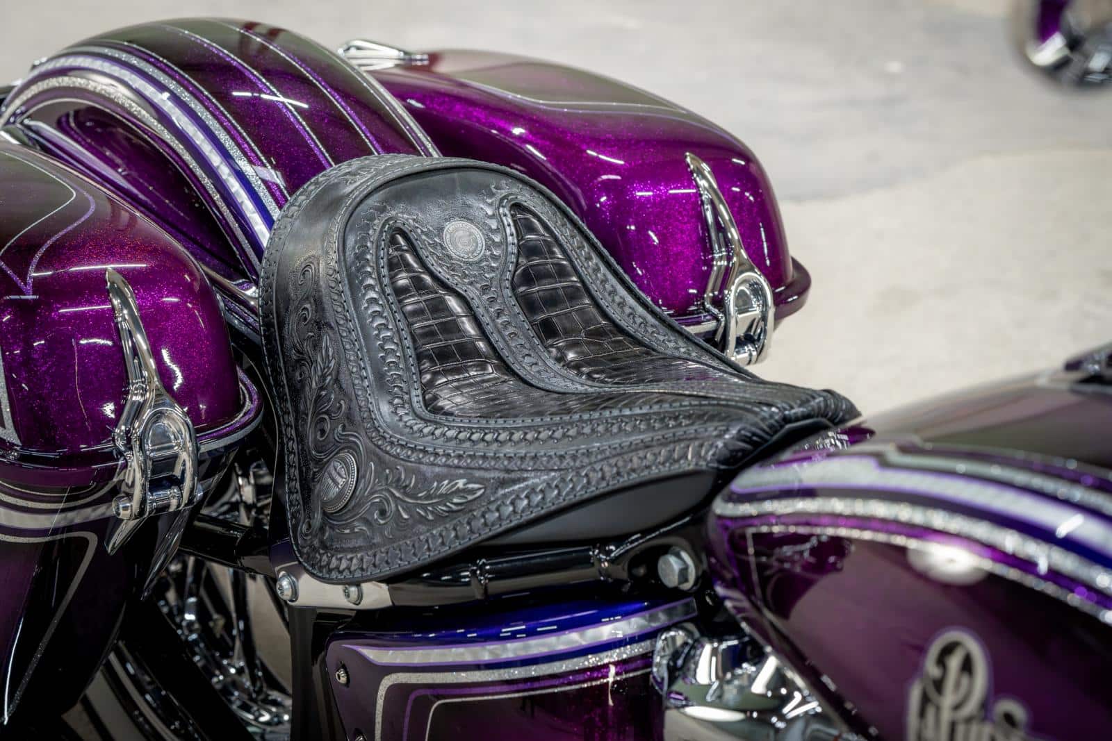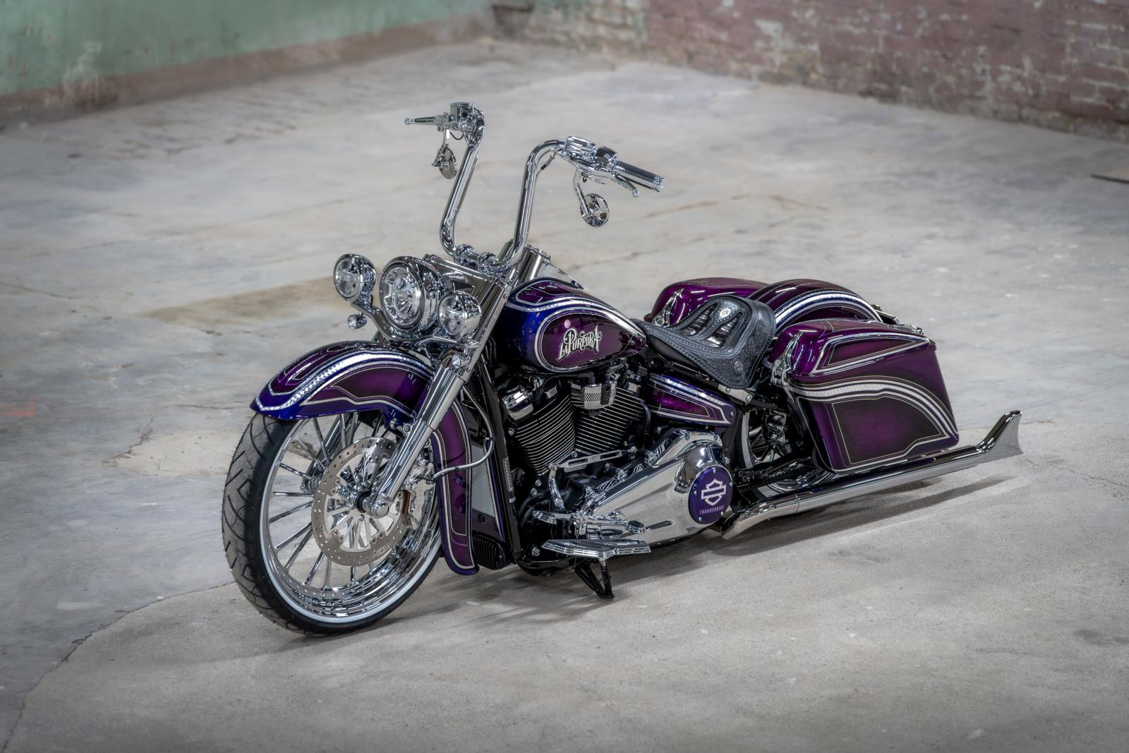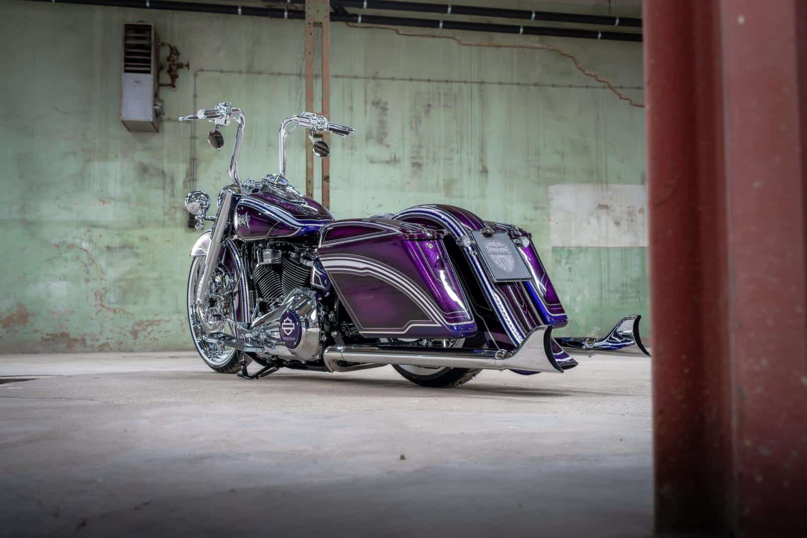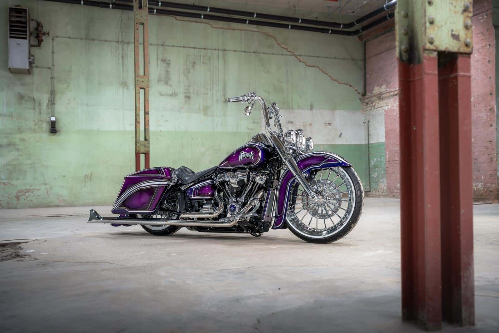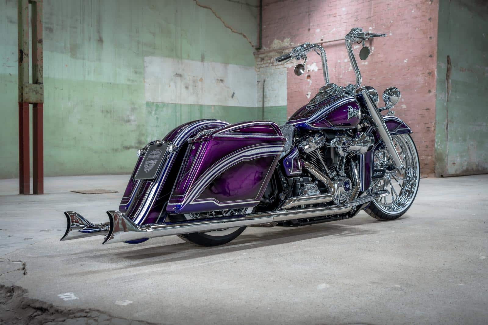 De custombouwers van het Duitse Thunderbike genieten inmiddels een ijzersterke reputatie als het gaat om Chicano’s. Toch leggen ze elke keer de lat voor zichzelf een stukje hoger en dat betekent ook voor deze nieuwe creatie een Chicano zoals ze nog nooit eerder gebouwd hebben; met chromen wielen, extra koplampen, koffers en een ongebruikelijke kleur waarnaar de naam van de bike verwijst: La Purpura!