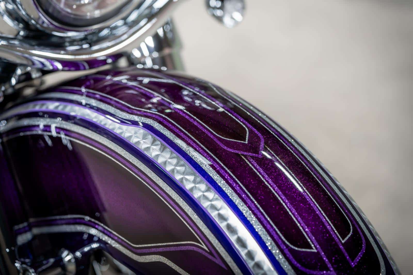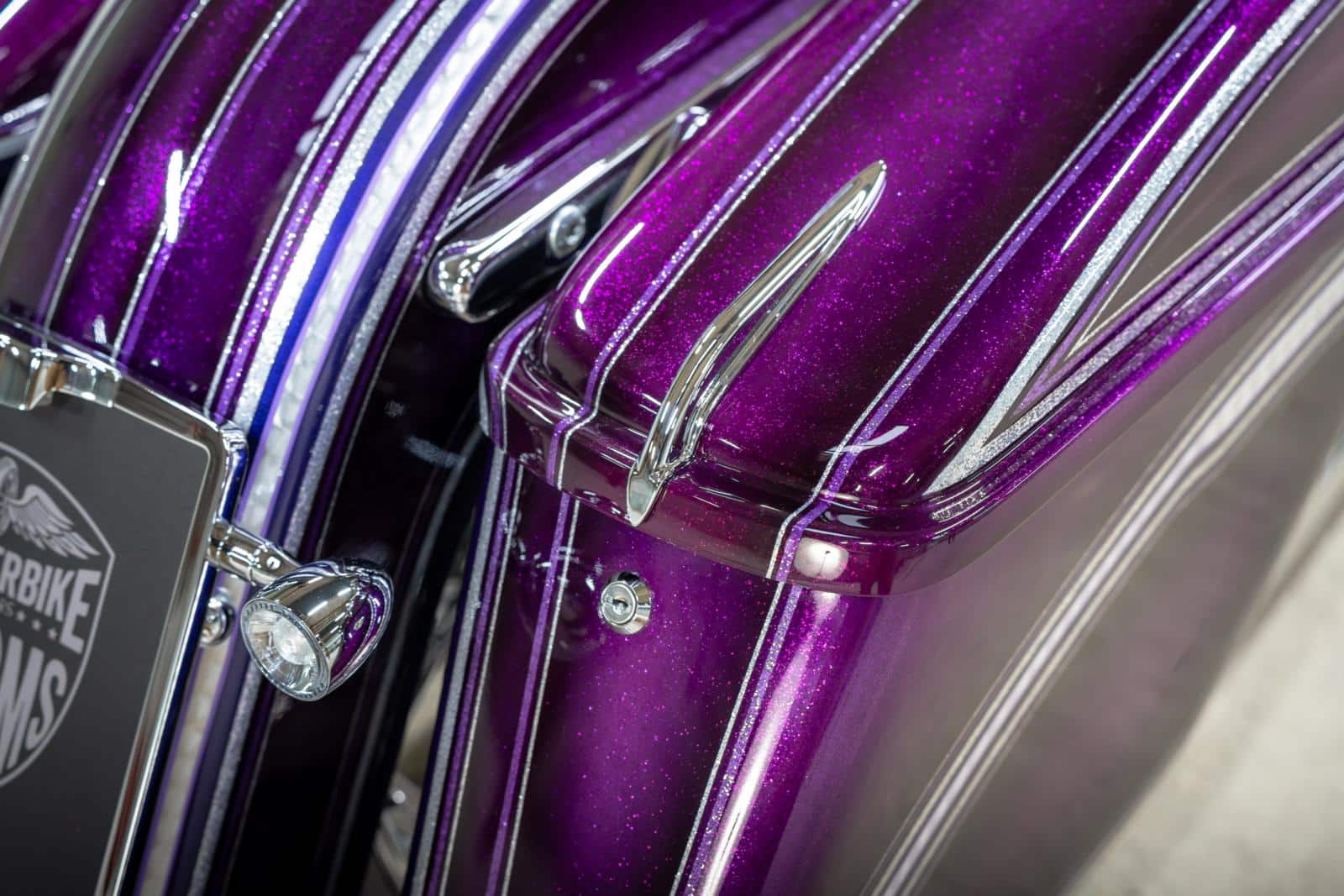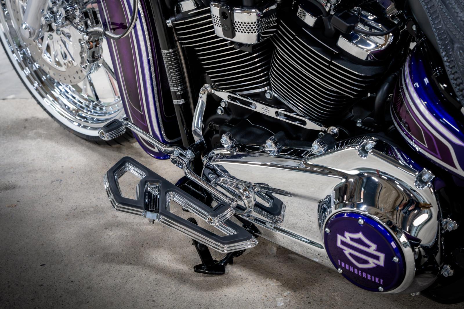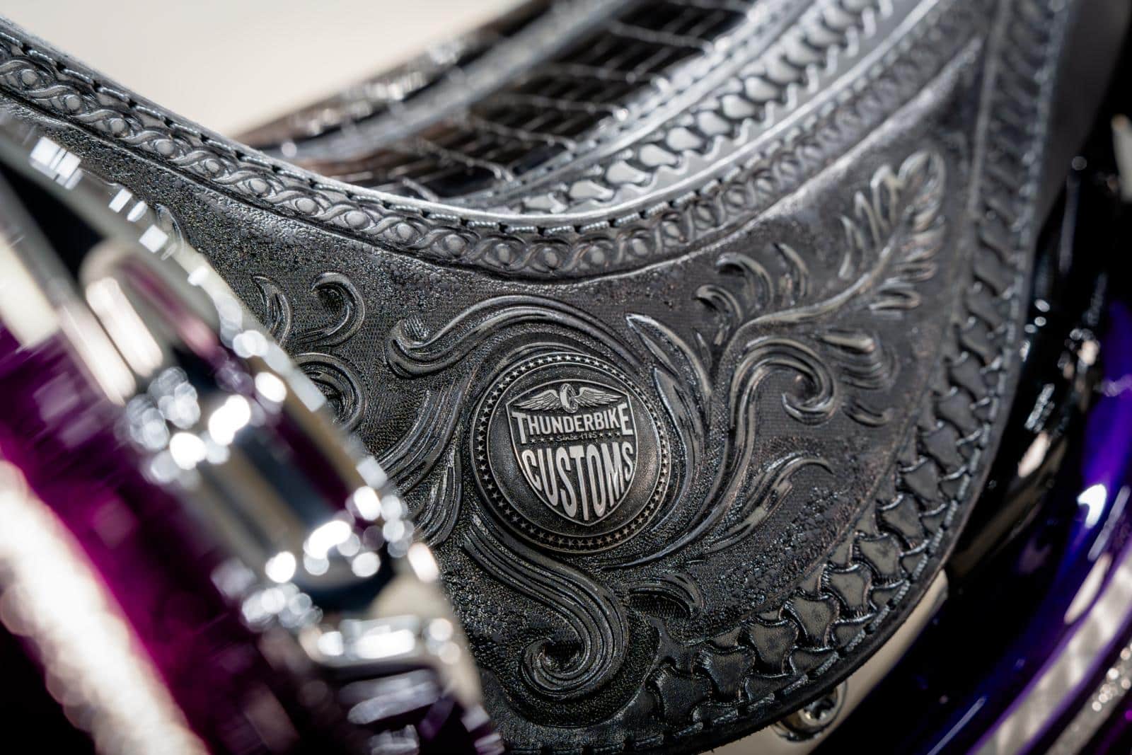 Om de typische lage Chicano-look te bereiken, werd ook de originele achterbrug aangepast. Nieuwe gefreesde eindstukken werden erop gelast, waardoor de as hoger kwam te liggen en het wiel dieper in het spatbord zakte. Het achterspatbord is aan de zijkanten laag doorgetrokken en erg lang gemaakt. Het langgerekte silhouet wordt geaccentueerd door de lange uitlaat met fishtails. Een Airride achter zorgt voor het typische lowrider-effect. De ‘finishing touch’ komt in de vorm van het spuitwerk verzorgd door Chiko’s Pinstriping. De look is opvallend, maar niet schreeuwerig. De paarse tint is stijlvol gecombineerd met zilverfolie en in lijn met het chroomthema dat overal in het design terugkomt. Het zal niemand verbazen: Een passende naam voor hun nieuwe creatie bedenken was voor de mannen van Thunderbike nog nooit zò makkelijk!
