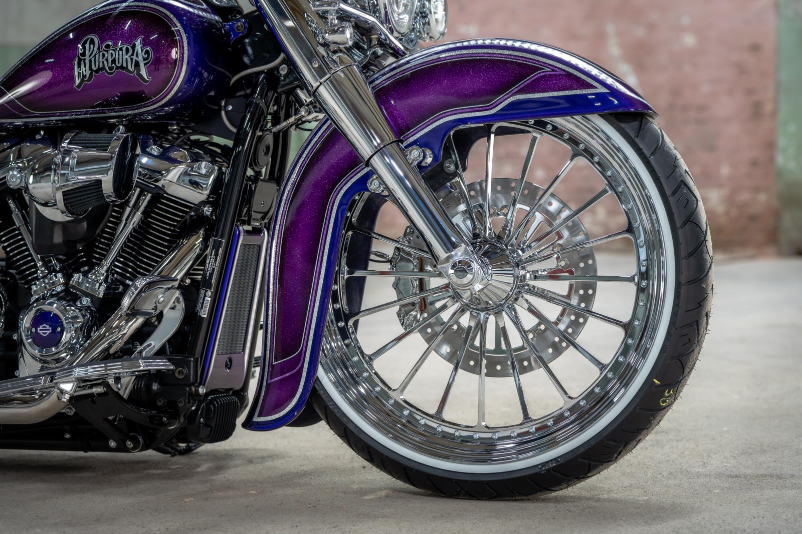 Dat voorwiel is Thunderbike’s eigen driedelige ‘Digger’ wiel. Het werd gecombineerd met een 340 mm remschijf en een smalle, verchroomde PM remklauw. Het voorspatbord is aan de zijkanten diep ingesneden, vloeiend en lang. Daardoor komt het wiel nog verder in het spatbord te liggen, wat extra visuele diepte creëert. Om de Chicano bij stilstand het juiste superlage profiel te geven is aan de voorzijde een Airride systeem gemonteerd waarmee de koplamp tot dicht op het spatbord kan zakken. La Purpura is de eerste Chicano van Thunderbike die uitgerust werd met een set extra koplampen. Ze benadrukken de klassieke stijl en geven balans bij de brede achterkant met de koffers. De verchoomde lamphuizen herbergen moderne LED techniek, terwijl de montagebeugels weer helemaal klassiek zijn.