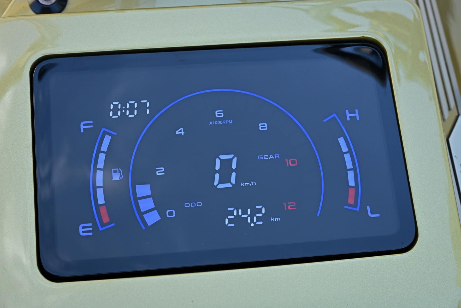 Buiten het vervangen van een aantal dichtingen en keerringen werd de krachtbron niet gereviseerd. Vooral omdat het nooit de bedoeling was om met de showmotor te gaan rijden. Alles werkt naar behoren en de machine is rijvaardig. “Dat is voldoende”, zegt Ruben. “Naast de cilinderkoppen zitten ruime spaties, zodat de motor geen thermische problemen kan krijgen. Het blok is voorzien van Denicol koelvloeistof die de bedrijfstemperatuur met ongeveer 10 graden vermindert ten opzichte van andere producten en vaak gebruikt wordt in competitie crossmotoren. De uitlaten zijn tot aan de fishtale dempers selfmade en staan voldoende ver van de beplating af om schade aan het lakwerk te vermijden. Recht op recht vond ik ze ontzettend saai. Midden de motor was er nog wat open ruimte vrij, waar ik de buizen met een artistieke kronkeling kon inplooien. De flow bleef oké en het resultaat is een speciaal, kletterend geluid. De KTM Supermotard koplamp, die van origine veel hoekjes en kantjes heeft, was de perfecte basis om de rest van de voorkant op aan te sluiten. Een laag stuur hoorde daar absoluut niet bij. Om het Chicano effect wat te vergroten heb ik toch maar voor een apehanger gekozen. Het opmerkelijke digitale display op de tank is een Chinese aftermarket speedometer die eigenlijk voor een wreed lelijk brommerke bestemd is, de Honda EX5. Oorspronkelijk was het als test bedoeld, maar voor zijn low budget prijs functioneert het schermpje uitstekend en het past verbluffend goed bij het concept. De manometertjes op de middenconsole zijn voor de luchtvering.”
