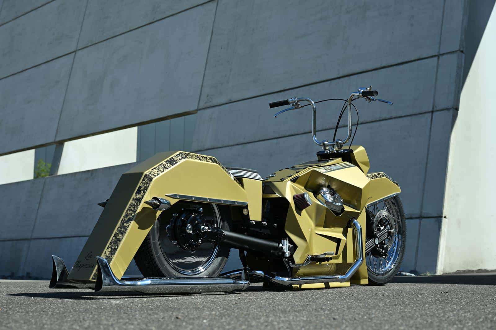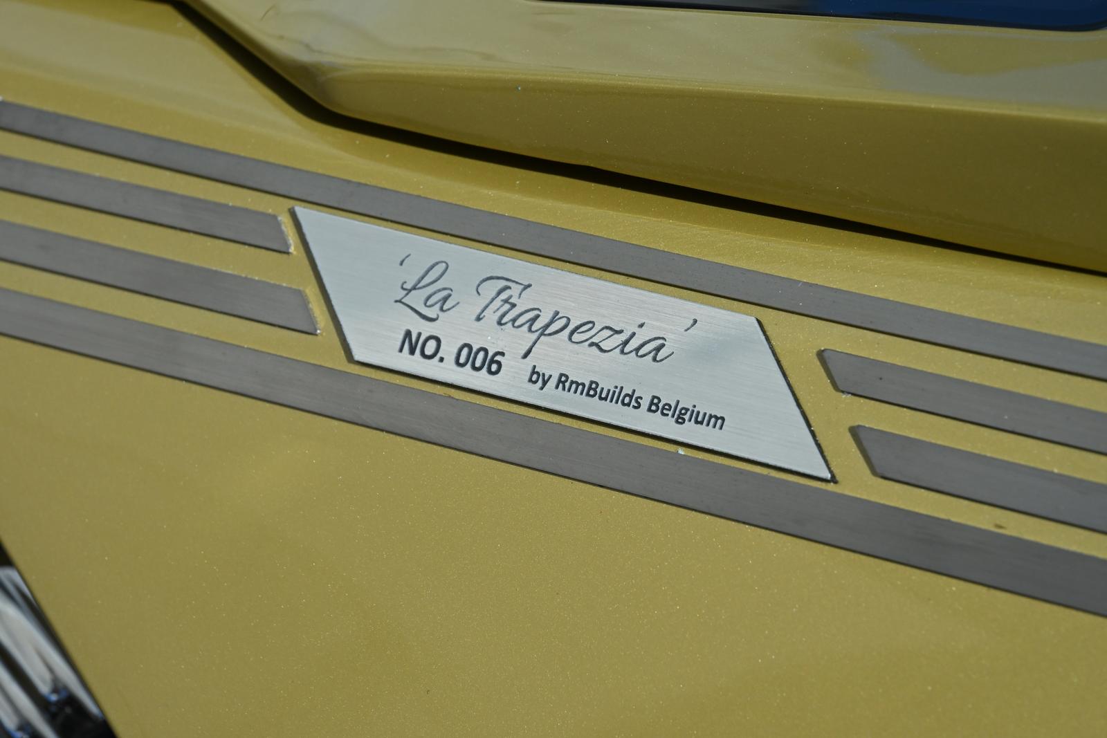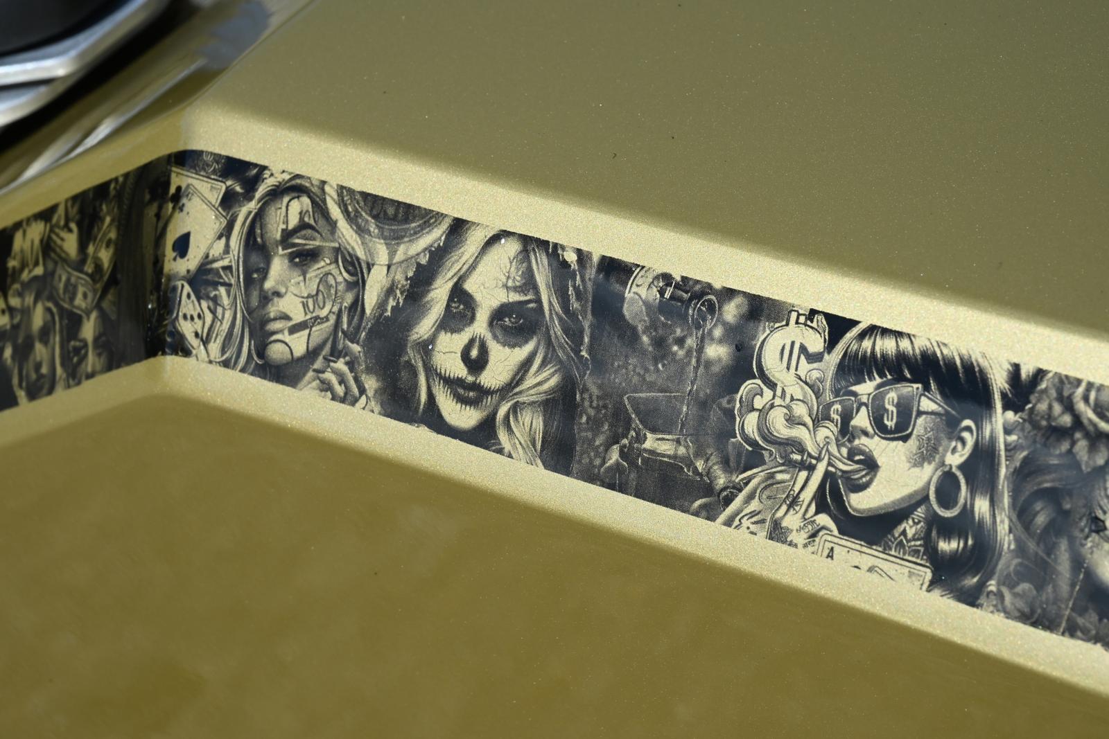 Ruben vertelt verder: “In 2023 zag ik de champagne kleurstelling voor het eerst op de Lamborghini van een influencer en ik besloot meteen die ooit zelf eens te gaan gebruiken. De afbeeldingen op de spatborden zijn één voor één van het net gedownload. Ze werden op een vier meter lang lint samengevoegd en uitgeprint, waarna ze door de spuiter verwerkt konden worden. Door de gebruikte trapeziumachtige vormen en het raadplegen van Google translate kwam ik bij de Spaans klinkende naam ‘La Trapezia’ terecht. Ik hou ontzettend van Spanje en vind de benaming bijgevolg uitstekend passen voor de Chicano bike. Ik voel, ruik, hoor en zie graag motoren. Het zijn kunstwerken waar ik gepassioneerd met hart en ziel aan werk. Om niet gestoord te worden doe ik de opbouw meestal ’s nachts, vergezeld door een gezellig muziekske. Soms zie ik bij het slapengaan visioenen die ik ‘s anderendaags al wil uitproberen en tijdens het ontwaken krijg ik ingevingen die onmiddellijk worden opgeschreven, om zeker niks te vergeten. Ik kan eindeloos genieten van een sporadisch motorritje, maar toch heb ik bij het thuiskomen telkens ontzettend veel spijt van de gemiste uren sleutelplezier.”