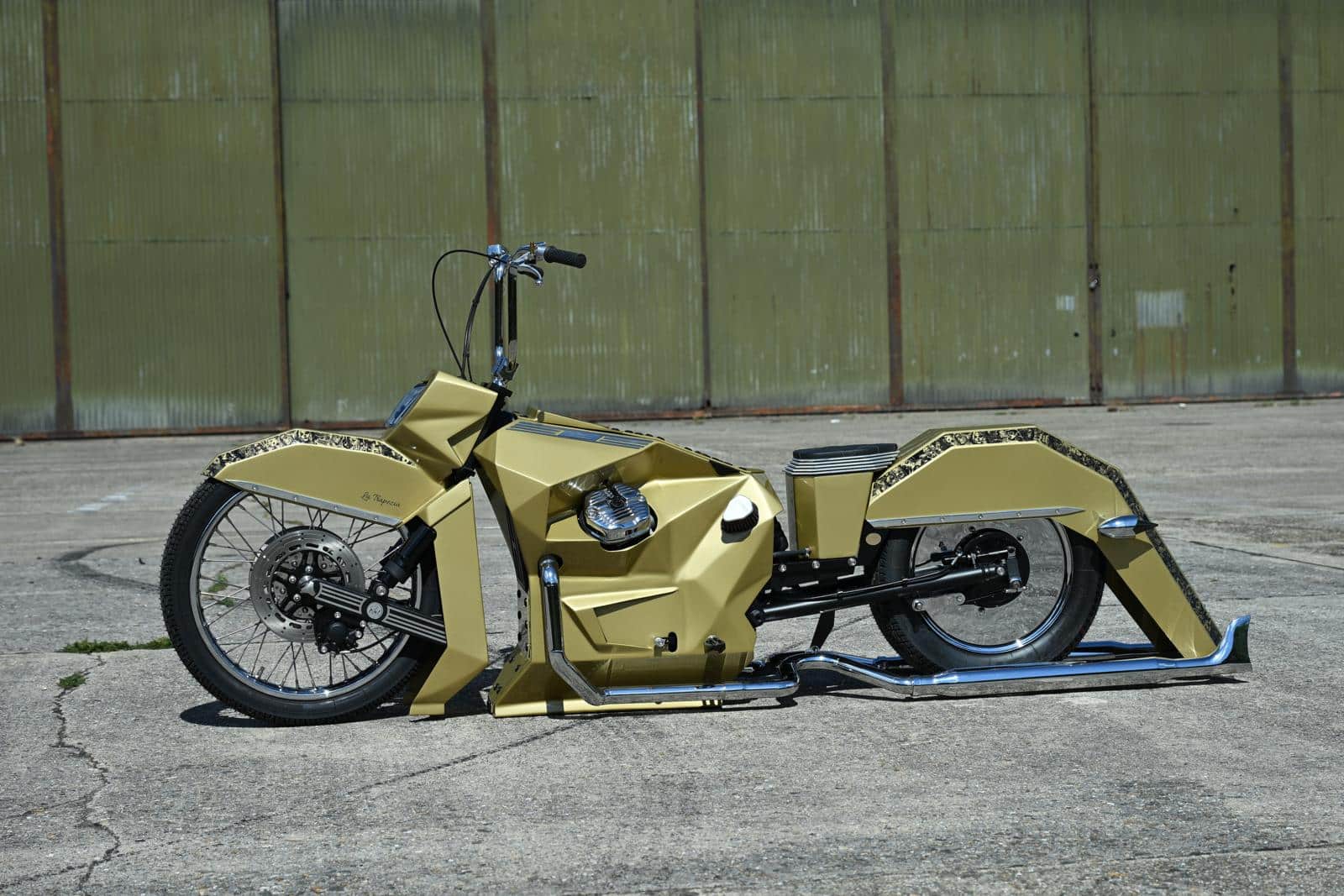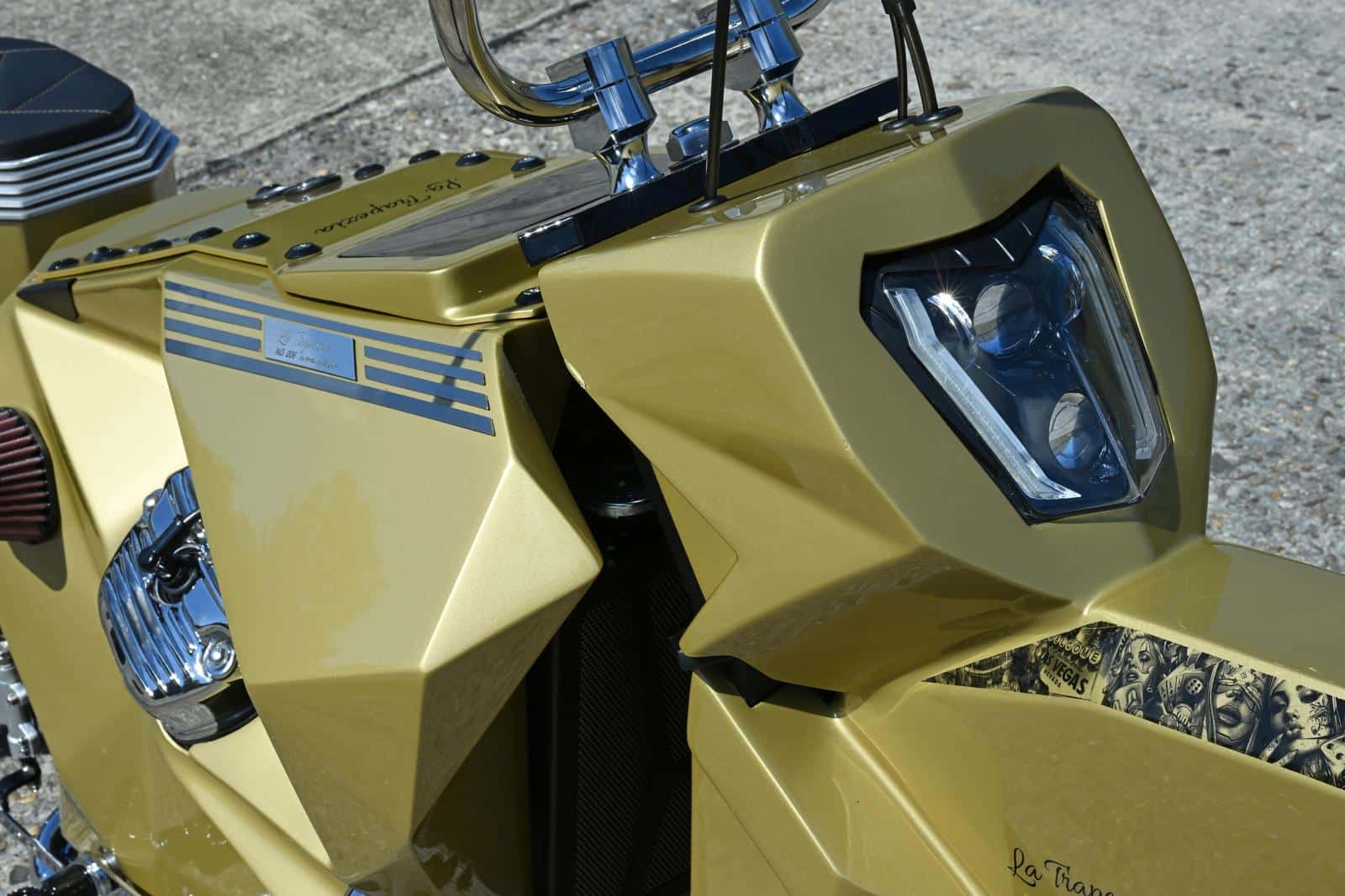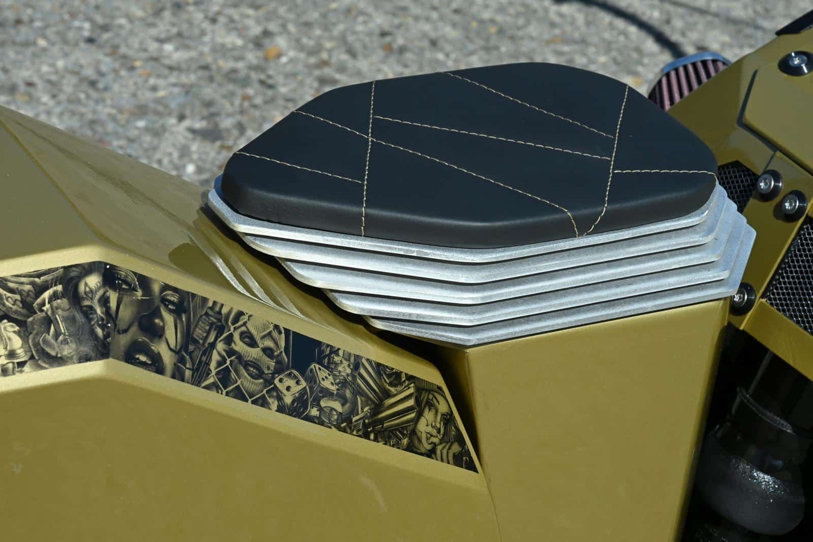 Ruben vertelt verder: “In 2023 zag ik de champagne kleurstelling voor het eerst op de Lamborghini van een influencer en ik besloot meteen die ooit zelf eens te gaan gebruiken. De afbeeldingen op de spatborden zijn één voor één van het net gedownload. Ze werden op een vier meter lang lint samengevoegd en uitgeprint, waarna ze door de spuiter verwerkt konden worden. Door de gebruikte trapeziumachtige vormen en het raadplegen van Google translate kwam ik bij de Spaans klinkende naam ‘La Trapezia’ terecht. Ik hou ontzettend van Spanje en vind de benaming bijgevolg uitstekend passen voor de Chicano bike. Ik voel, ruik, hoor en zie graag motoren. Het zijn kunstwerken waar ik gepassioneerd met hart en ziel aan werk. Om niet gestoord te worden doe ik de opbouw meestal ’s nachts, vergezeld door een gezellig muziekske. Soms zie ik bij het slapengaan visioenen die ik ‘s anderendaags al wil uitproberen en tijdens het ontwaken krijg ik ingevingen die onmiddellijk worden opgeschreven, om zeker niks te vergeten. Ik kan eindeloos genieten van een sporadisch motorritje, maar toch heb ik bij het thuiskomen telkens ontzettend veel spijt van de gemiste uren sleutelplezier.”