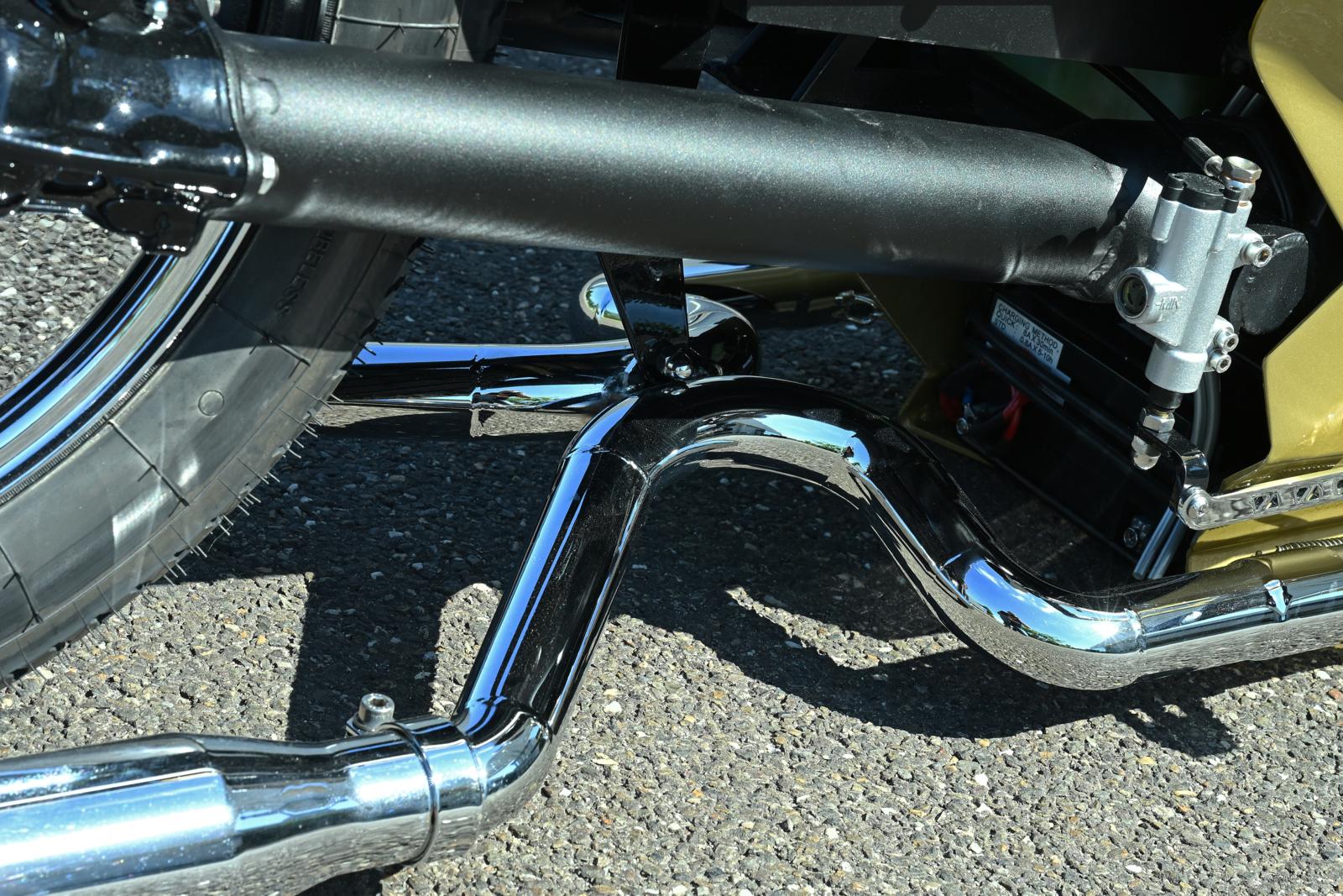 Over de afmetingen van de machine zegt Ruben: “Die zijn afgestemd op mijn vrij grote gestalte. Het is derhalve een redelijk imposante motor geworden. Daarbij wou ik in zowat alles schromelijk overdrijven, zowel in materiaalkeuze, als in dimensies en stijl. Dat is ook de reden waarom de spatborden zo laag doorlopen. De motor heeft trouwens geen middenbok. Voor het parkeren of wegrijden dient de motor telkens via het air-ride systeem gezakt, dan wel omhoog gezet te worden.” De achterbrug werd met gedraaide bussen 15 cm verlengd en verstevigd. De cardan werd daar na het doorslijpen op aangepast. Aanvankelijk werd de machine afgeveerd door één enkele, op ongeveer 70 graden geplaatste schokdemper. Op de werktafel en zonder belasting werkte dat systeem perfect, maar na de montage van de kuip zakte de motor ernstig door. Het hefboomeffect bleek zelfs na de plaatsing van een tweede Monroe demper en 13 bar druk nog te groot. Door een plaat tussen de veerelementen te lassen werd het probleem opgelost, maar daarmee werd de machine wel gelijk gemodificeerd naar hardtail. Dezelfde veerelementen functioneren overigens uitstekend op de voorvork. De standaard remschijven vielen vooraan wat magertjes uit en zijn vervangen door grotere Honda Bol D’or schijven, die verder naar buiten geplaatst konden worden. De mechanische trommelrem achteraan werd omgebouwd naar hydraulisch bediening.