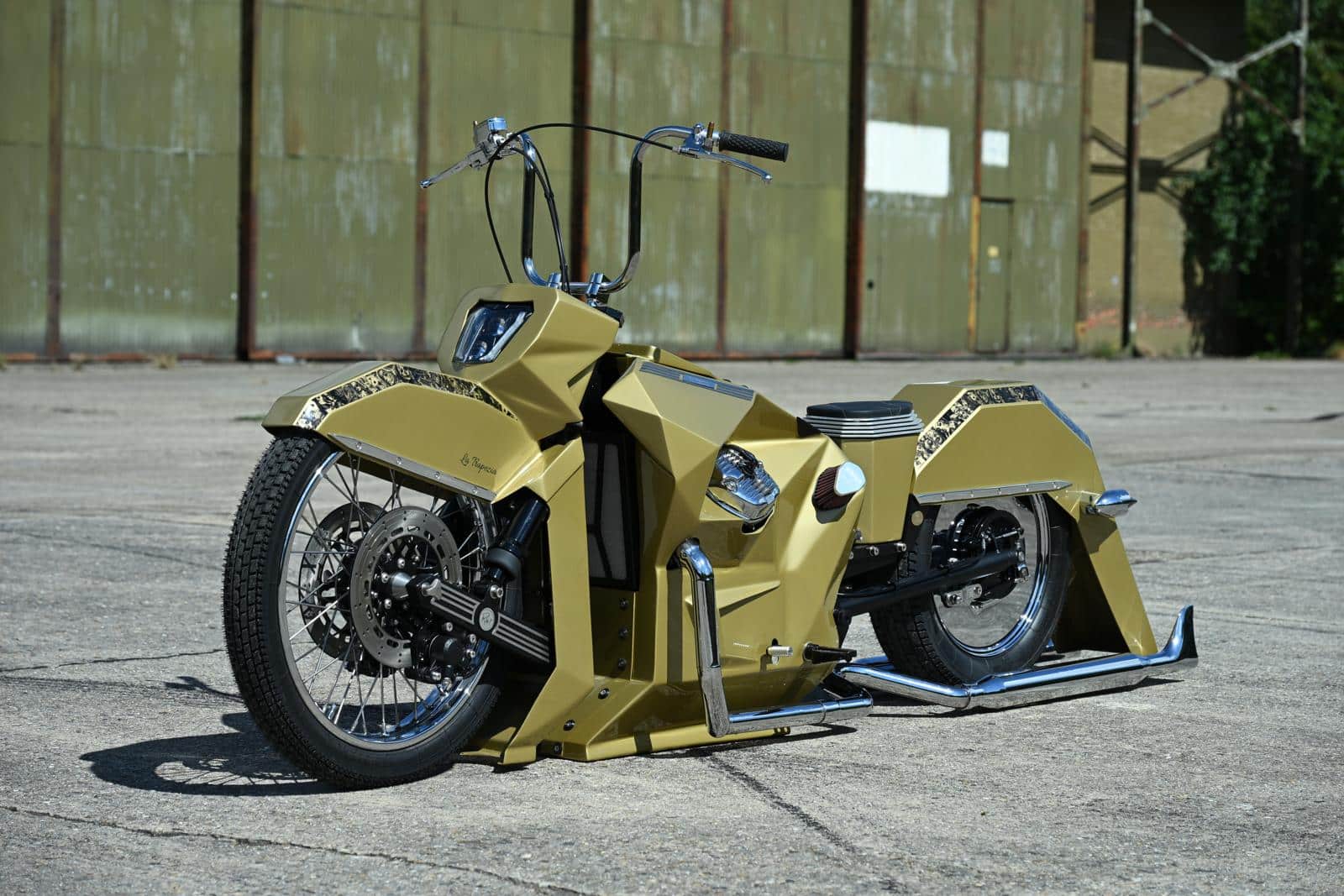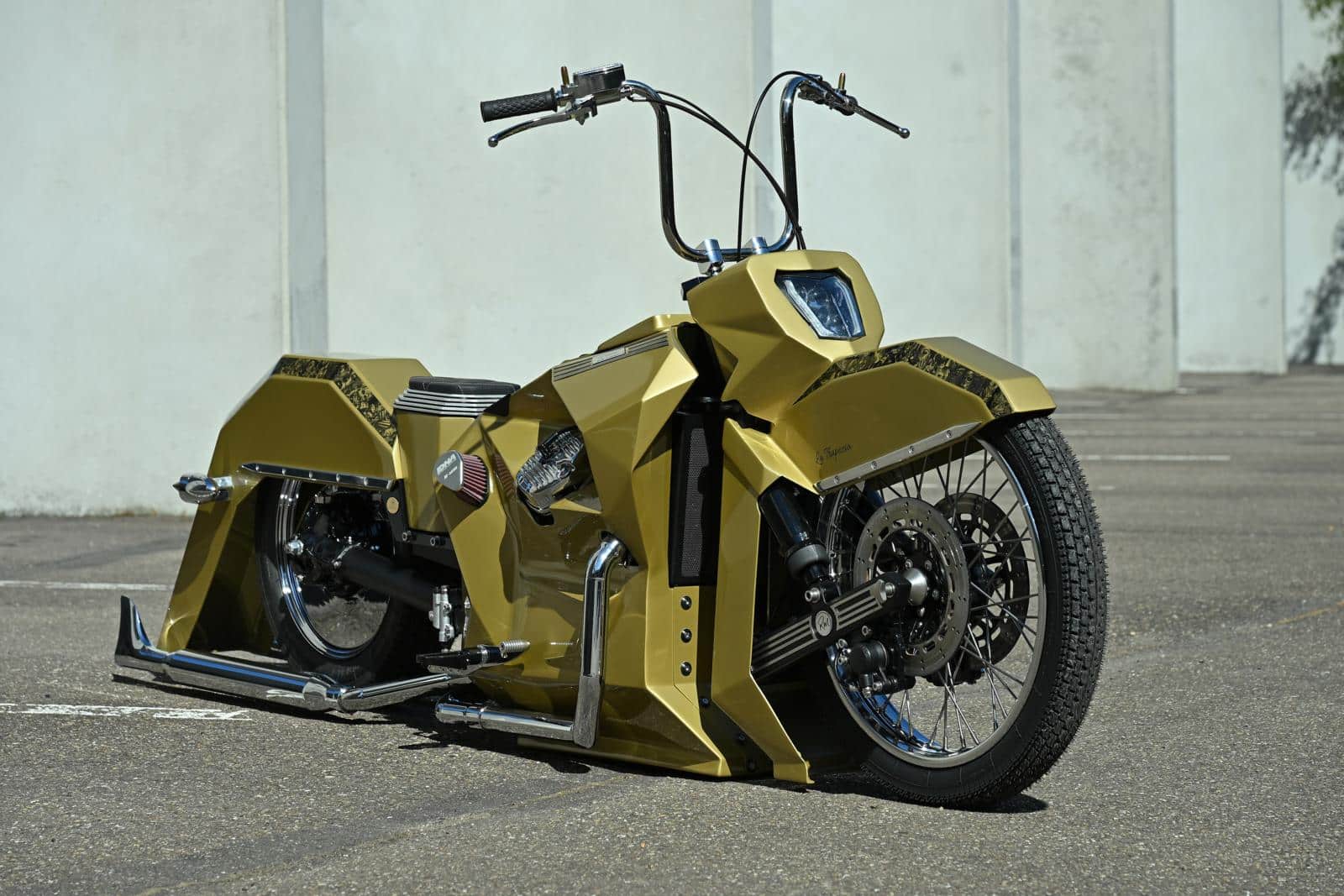 Ruben vervolgt: “Ik ben een fervent liefhebber van de Chicano-style. Laag tegen de grond gebouwd en met verlengde spatborden. Door een drom lege cornflakes dozen in elkaar te knutselen kreeg ik ideeën waarop verder gewerkt kon worden. Vervolgens werd er nog een aanvullende ruwe schets op schaal uitgetekend. Hoewel de Tesla Cybertruck absoluut geen inspiratiebron is, heeft het ontwerp er best wel iets van weg. Vooral door het veelvuldige gebruik van driehoeken en trapeziums. Een goede kameraad van mij moest lachen en zei dat het hoekige ontwerp veel weg had van een 2500 liter grote, stalen rolcontainer voor bedrijfsafval. Ach, die rare reacties ben ik inmiddels gewend en ik ben tijdens het customizen wel eens meer voor gek verklaard. Het lof en respect achteraf doet dan ook enorm veel deugd. Alvorens definitief aan de slag te gaan, heb ik het kuipwerk provisoir in kartonnen mallen uitgewerkt. Deze werden rond de motor gezet om de juiste verhoudingen te bepalen. Uit vorige projecten had ik geleerd dat staal nogal zwaar uitvalt. Omwille van het royale plaatwerk moest het gewicht dus wat ingetoomd worden. Het gebruik van aluminium voor de carrosserie was een bruikbare optie en tevens een interessante leerschool. Ik had er immers nog niet eerder mee gewerkt. Aluminium reageert totaal anders dan Inox of staal. Het is fragiel om te lassen en zet fel uit. Dat had ik enorm onderschat.”