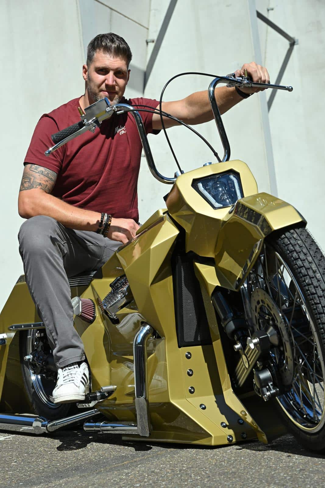 In de ontvangstruimte van RM Builds staan ondertussen vier zelfbouwmotoren demonstratief opgesteld. Een caféracer, een boardtracker, een racebanaan en een driewiel scooter, die allen een ander concept en kleur hebben. Hier kan toekomstig cliënteel ontdekken hoe extreem wensen en ideeën kunnen gaan. Voor Ruben is vooral de exclusiviteit belangrijk. “Ik bezondig me niet aan kopieergedrag”, verduidelijkt hij. “Net als Fred Krugger wil ik mij specialiseren in fenomenale, nooit eerder geziene creaties. One of a kind prototypes, liefst zo extreem mogelijk. Smaken verschillen en niemand hoeft de CX mooi te vinden. De appreciatie voor mijn lef en creativiteit is belangrijker. Kenners weten hoeveel tijd in minuscule details of een stom beugeltje sluipt. De bouwtijd nam ongeveer een jaar in beslag, inclusief de tijd dat ik op het spuitwerk moest wachten. Mijn vrouw, die me ondertussen al een beetje kent, kwam tussendoor weleens naar de vooruitgang polsen. Meestal rolt ze dan eens met de ogen om vervolgens hoofdschuddend weg te stappen. Gelukkig laat ze me ongestoord verder morrelen en mezelf zijn in de garage. Als ik iets in mijn hoofd heb, dan heb ik het niet in mijn kont zitten. Het moet en zal gerealiseerd worden. Wie motoren bouwt voor normaal gebruik moet zich aan oneindig veel regeltjes houden. Daarenboven moeten ze nog comfortabel rijden ook. Daar moest ik geen rekening mee te houden. Mijn zelfbouwmotoren hoeven niet te rijden, ze dienen enkel om mijn creativiteit in te verwerken. Showmotoren hebben geen limieten, alles kan en alles mag. What you see is what you get.”