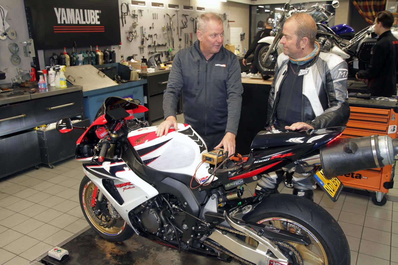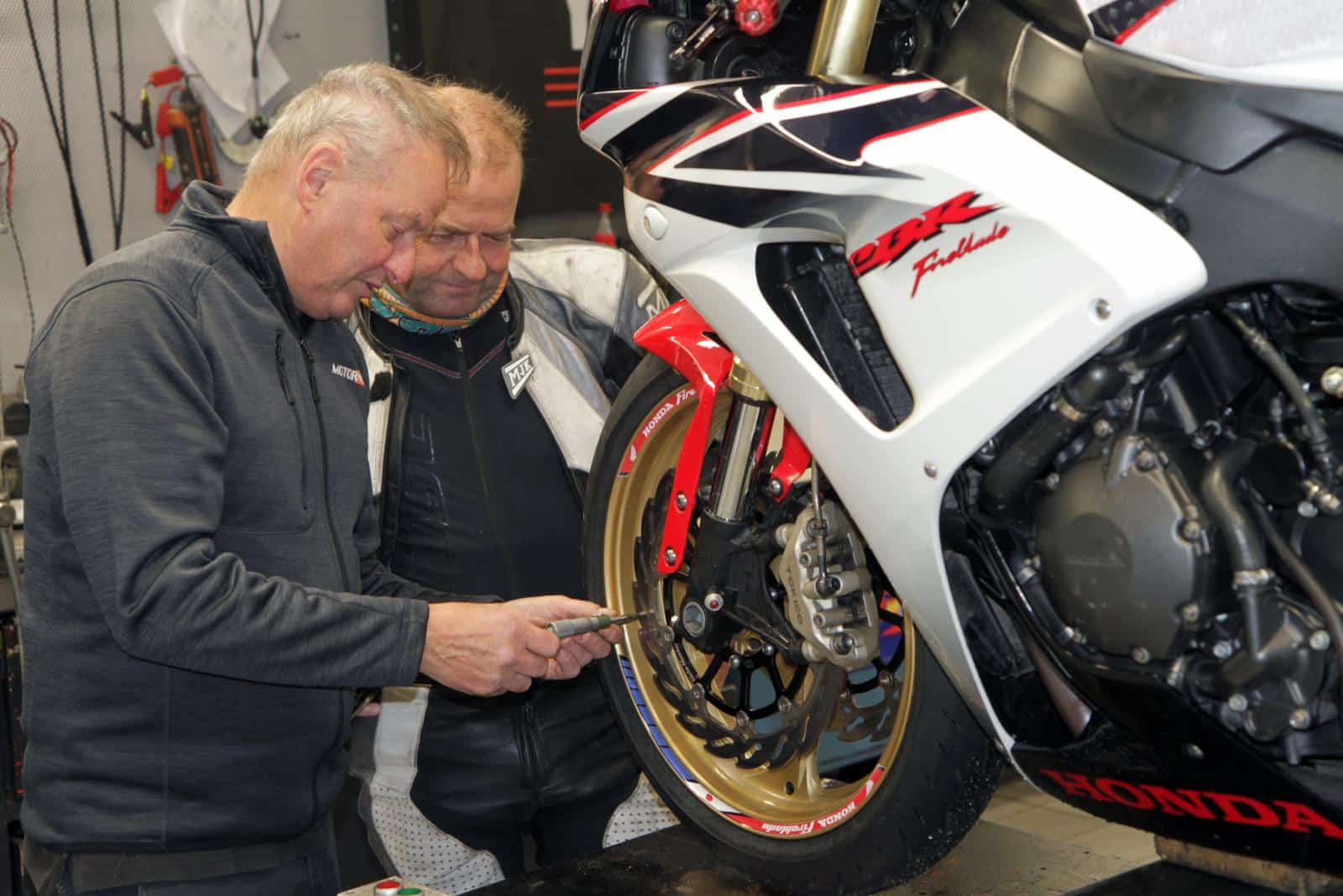 Het is een druilerige ochtend wanneer Ronny met zijn fraaie Honda CBR1000RR Fireblade bij MOTO73-expert Gerard van Sleeuwen in Volkel arriveert. Van Sleeuwen start met een proefritje. ‘Ziet eruit als nieuw, rijdt ook nog als nieuw’, is zijn eerste conclusie. Maar hij had ook niet anders verwacht. Eenmaal op de brug en met het voorwiel los toch nog enige verbazing. Het balhoofdlager heeft zijn beste tijd gehad. Gerard: ‘Normaal gesproken voel ik het direct wanneer het balhoofdlager versleten is, dit keer heb ik niks gevoeld. Ook niet vreemd dat de eigenaar er niets van heeft gemerkt. Is verder geen ramp, de motor stuurt immers prima. Alleen met nieuwe lagers nóg beter.’