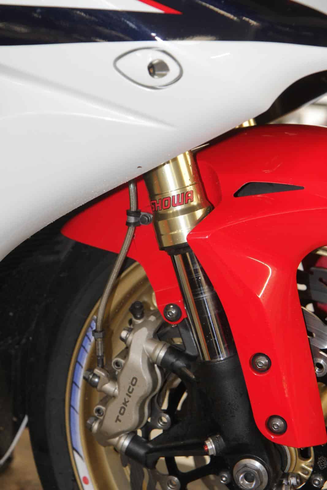 De remschijven voor zitten er nog niet zo lang op. De originele zijn vervangen door MotoMaster flame-remschijven. Ze remmen niet alleen goed, maar ogen ook zoals je mag verwachten op een Fireblade. De vering heeft nog nooit om extra aandacht gevraagd. Ronny: ‘Maar dat zit er wel aan te komen. Bij de laatste grote beurt stond als extra vermelding op de nota dat de voorvorkpoten een klein beetje beginnen te zweten. Dat kan een voorbode zijn van een lekke keerring.’