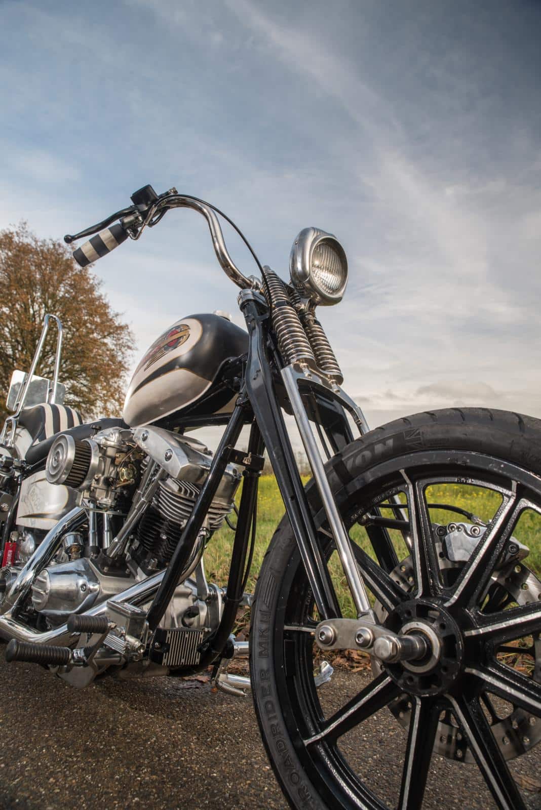 De Queen Shovel is exact voor dat leven gebouwd, met onder andere een robuust Lowbrow-achterspatbord en custom sissybar voor een plunjebaal waar Martine tijdens lange ritten tegenaan kan leunen. Ze wist precies wat ze wilde. “Een springer vind ik schitterend, dus die moest erop: een I-beam van Kruyswater.” Om het nét anders te doen wilde Martine geen spaakwielen maar gegoten exemplaren. “Dat staat stoer en het scheelt poetswerk.”