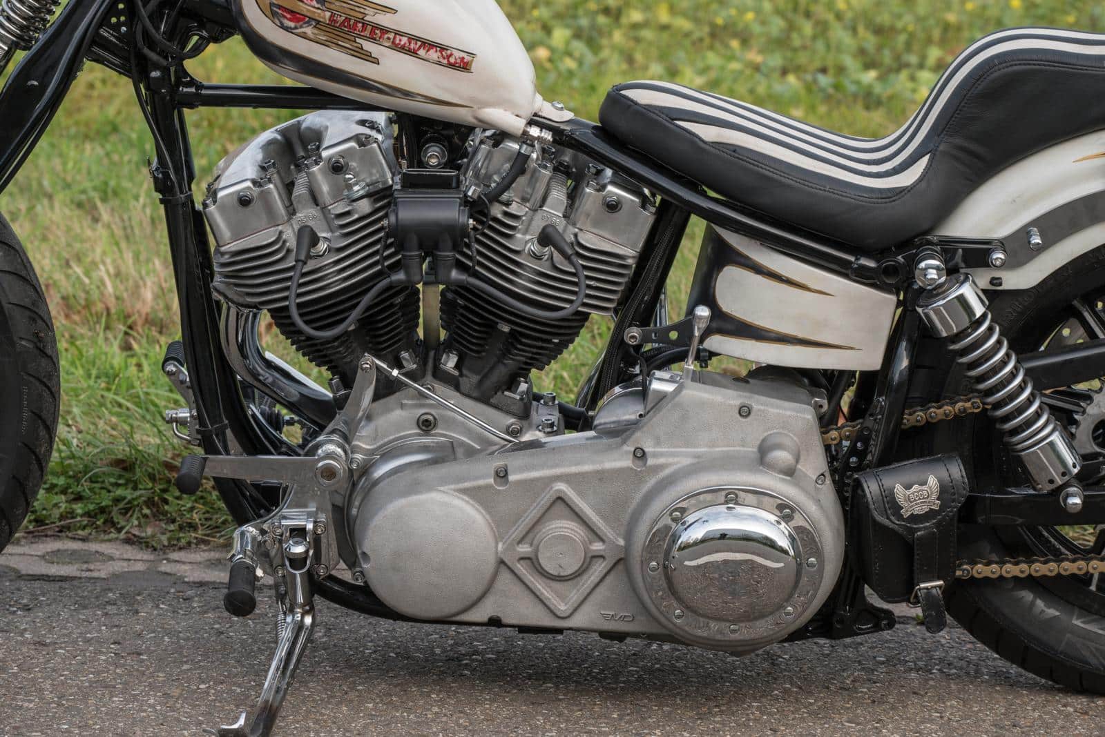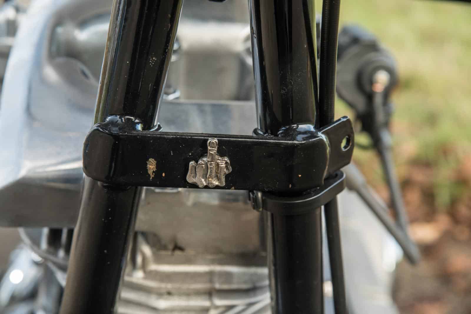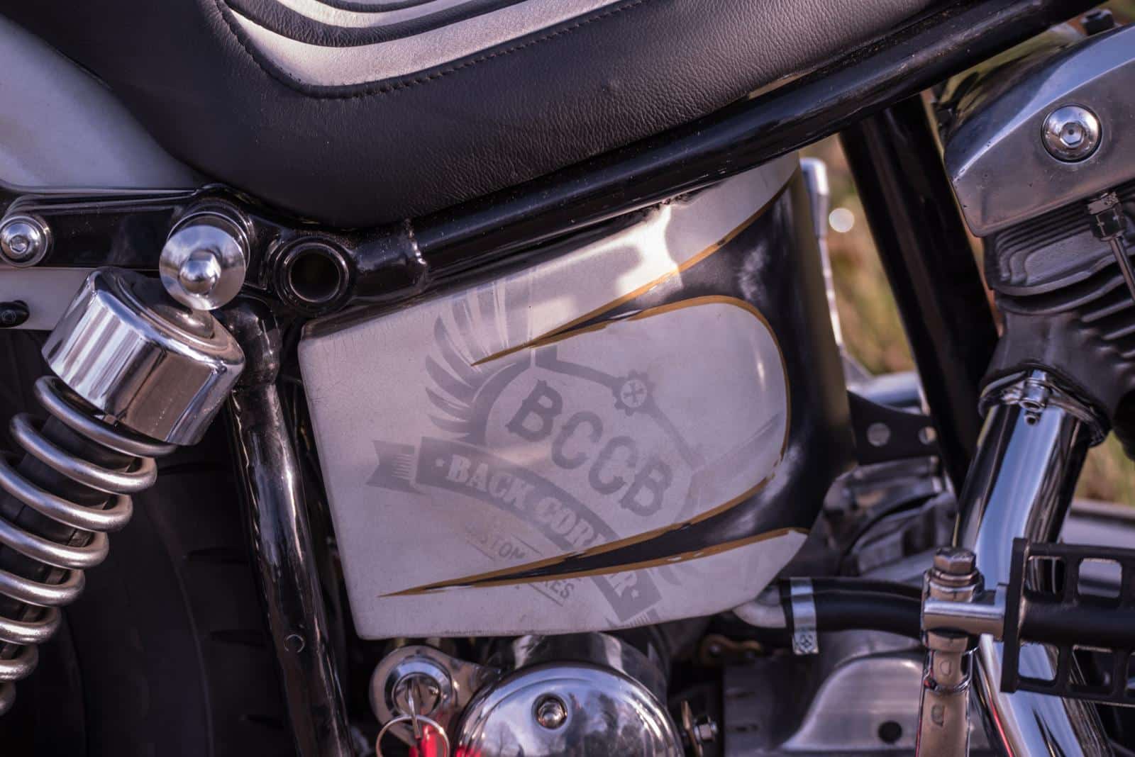 Huisspuiter Frank ‘Inca’ Stienen mocht ook deze keer weer zijn magie uitoefenen op een BCCB bike. Martine: “Frank stelde maagdelijk wit voor. Ik wilde het juist smerig, ruig en met patina. Het compromis werd ‘smoezelig wit’, met craquelé in de lak,” vertelt Martine. Volgens René heeft Frank z’n ochtendurine door de lak gemengd voor dat gelige tintje. Dus ja.. De motor kreeg handgeschilderde decals en pinstriping, bewust doorgeschuurd zodat het lijkt alsof de fiets al decennia meegaat. Op de olietank is subtiel het BCCB-logo verwerkt. “Dat is echt heel gaaf geworden.”