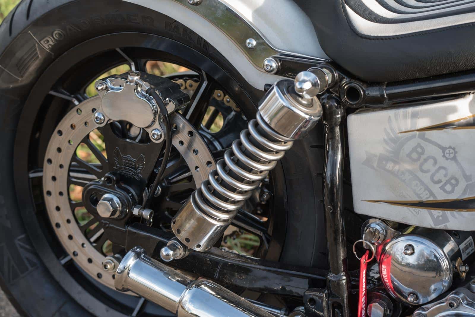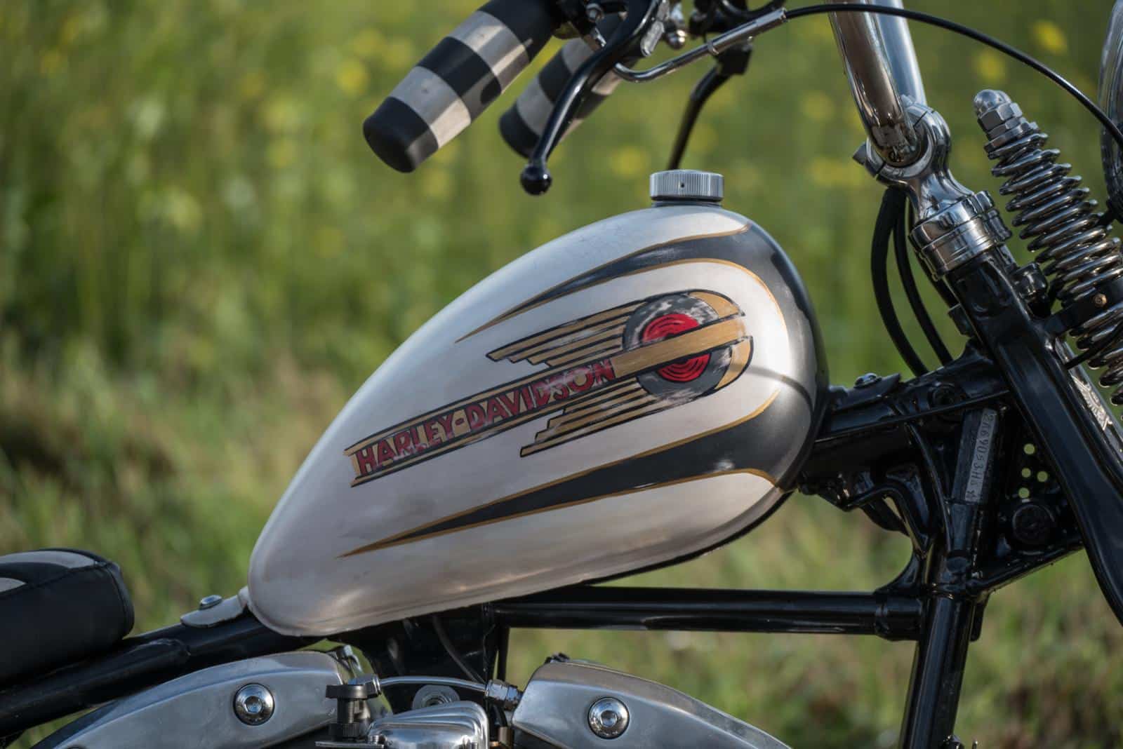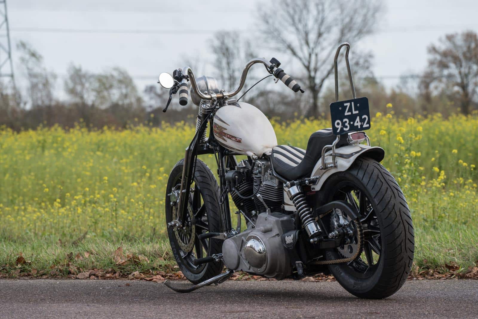 Huisspuiter Frank ‘Inca’ Stienen mocht ook deze keer weer zijn magie uitoefenen op een BCCB bike. Martine: “Frank stelde maagdelijk wit voor. Ik wilde het juist smerig, ruig en met patina. Het compromis werd ‘smoezelig wit’, met craquelé in de lak,” vertelt Martine. Volgens René heeft Frank z’n ochtendurine door de lak gemengd voor dat gelige tintje. Dus ja.. De motor kreeg handgeschilderde decals en pinstriping, bewust doorgeschuurd zodat het lijkt alsof de fiets al decennia meegaat. Op de olietank is subtiel het BCCB-logo verwerkt. “Dat is echt heel gaaf geworden.”