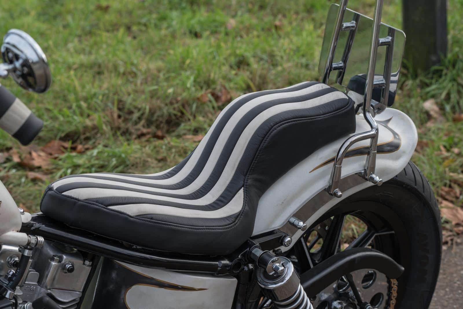 Ook het zadel wijkt af, Marcel Miller stikte het over de lengte met zwart en wit leer. “Dat idee kreeg ik door een zwart-wit gestreepte motorbroek die ik ooit had.” Het zwart-wit thema komt subtiel terug, onder andere in de handvatten. “Bij Roadside Repair Shop vond ik nog het laatste setje. Ze moeten alleen nog wat viezer worden.” De zithoogte is zo laag mogelijk gehouden. Het frame kreeg een BCCB dropseat en de achterbrug een verlagingsset. Het eigenbouw stuur staat op ‘standje relax’, maar oogt nog steeds stoer. Een jarenzestig-replica koplamp maakt het plaatje af. Verder is de motor opgebouwd met gewoon goed spul: K-tech controls, Ultima remmen, Kellermann knippers. Geen concessies, zodat het onderweg allemaal een beetje heel blijft.