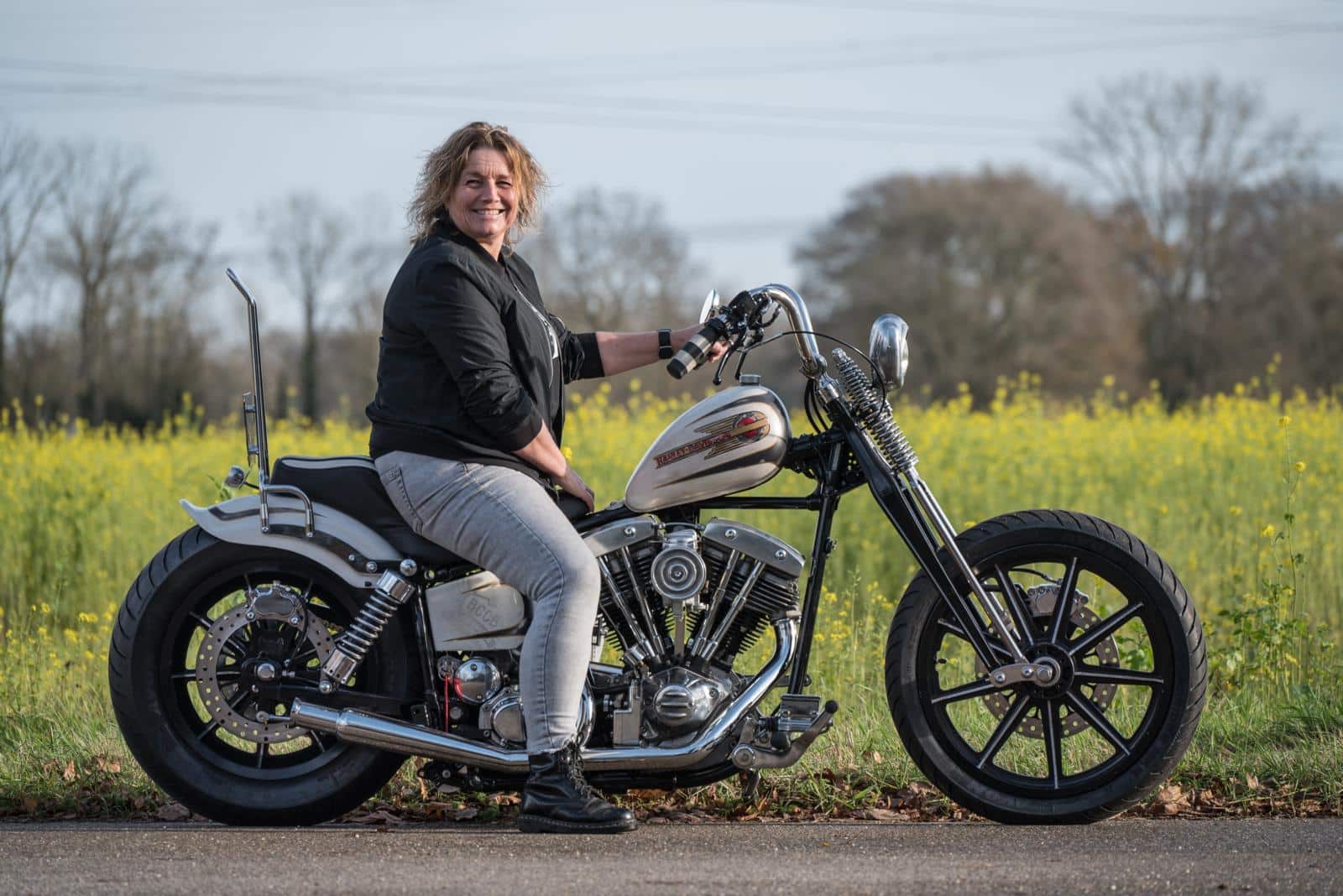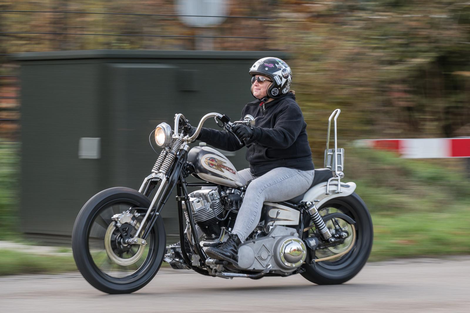 “Met mijn vorige Harley, de Bajou-bobber, heb ik écht veel gereden. Als ‘proefritje’ gingen we naar Normandië. Daarna heb ik er vijf seizoenen alles mee gedaan: Denemarken, Luxemburg, Frankrijk… noem maar op. Die Bajou-bobber had dikke banden en was behoorlijk zwaar. Op evenementen, vaak met veel blubber, is dat gewoon niet handig,” zegt Martine. Je moet tenslotte altijd een goed excuus hebben voor iets nieuws. “Ja, om de paar jaar wil ik weer wat anders. Dat vind ik leuk.” Dat treft, want haar man René runt Back Corner Custombikes.