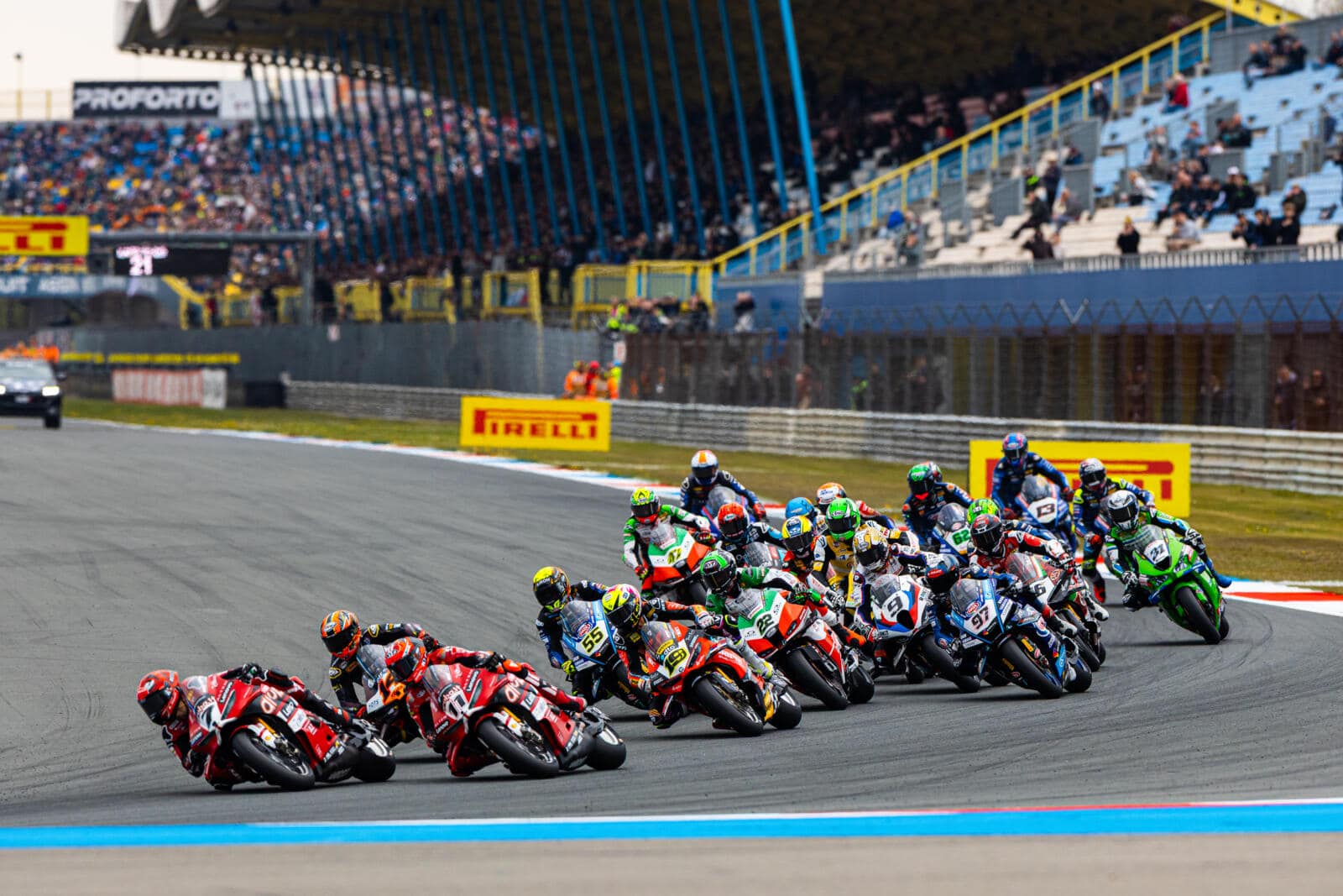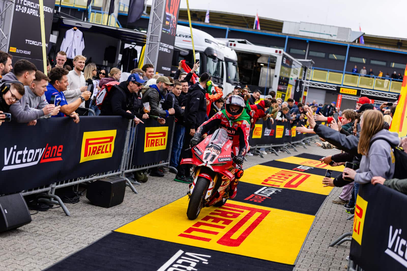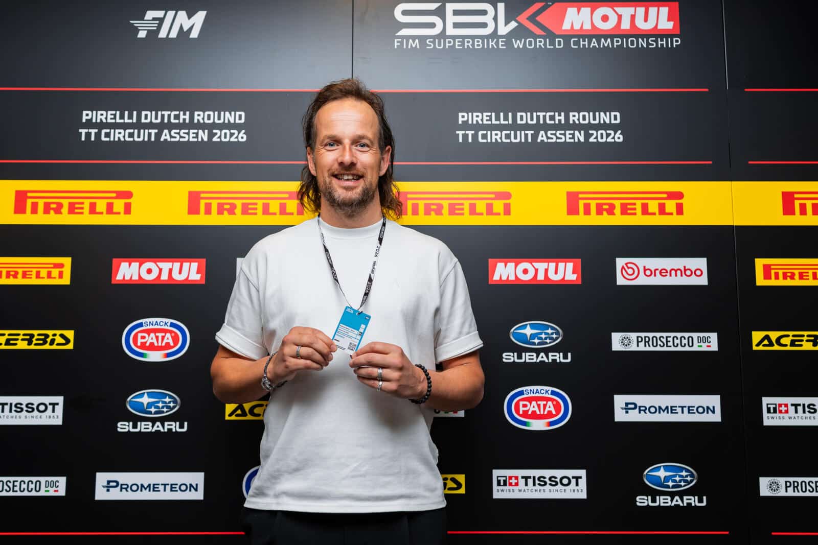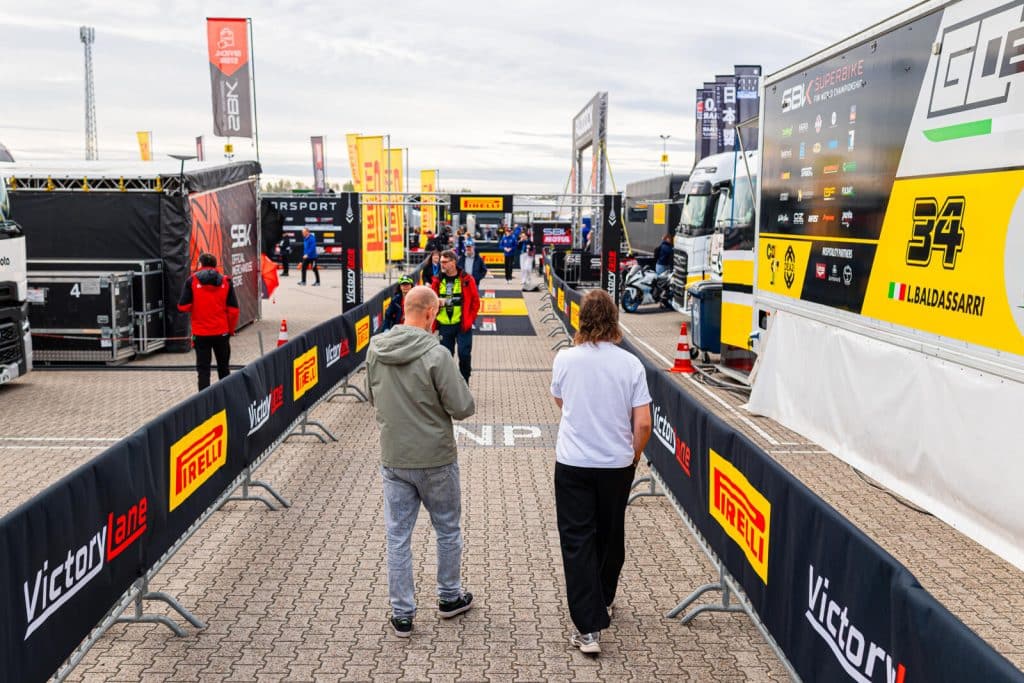 Terug in het mediacentrum hebben we een afspraak met Mischa van den Berg, woordvoerder van het TT Circuit Assen. ‘Wat mij opvalt, is dat jullie erg behulpzaam zijn richting de media. Ik zie jullie overal mensen helpen,’ begint Ramon. ‘Dat is ook onze taak. We zijn faciliterend richting de media en WorldSBK, zodat iedereen zijn werk goed kan doen. Maar ik heb ook begrepen dat dit in het buitenland niet overal zo is,’ reageert Mischa. Dat kan ik als ervaringsdeskundige bevestigen, want qua werkomstandigheden en catering staat het TT Circuit Assen hoog op mijn lijst van circuits die dit het beste voor elkaar hebben. Mischa vertelt vol trots over de professionele organisatie en zijn collega’s, maar blijft ondertussen de omgeving scherp in de gaten houden. Het valt hem meteen op wanneer er iemand met een Ducati-shirt rondloopt die die dag een klus uitvoert voor het TT Circuit. Geen passende werkkleding in zo’n functie. Wanneer hij even later navraag doet bij zijn collega Lisa, geeft zij direct aan: ‘Dat is al opgelost.’ Dat laat zien dat het team goed op elkaar is ingespeeld. ‘Je weet nooit hoe een dag in deze rol verloopt. Vanmorgen moest ik nog met spoed accreditaties regelen, omdat een Chinese mediapartij verslag wilde doen vanwege de groei van Chinese fabrikanten in de paddock. Dit moet eerst worden goedgekeurd door de WorldSBK. Eigenlijk kan dat niet meer op het laatste moment, maar als de belangen groot genoeg zijn, kan er veel geregeld worden.’