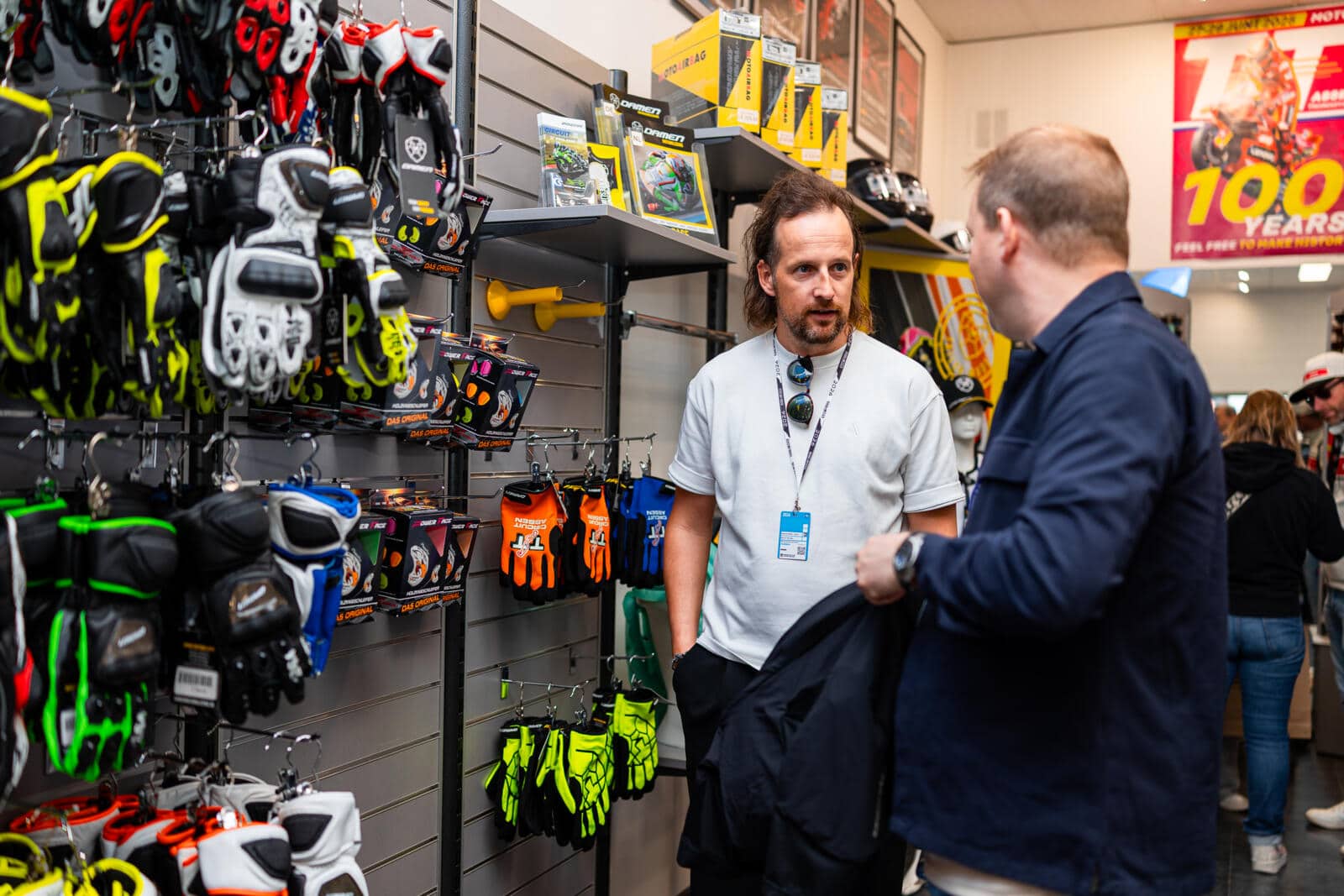 Na ons leuke gesprek met Mischa moeten Ramon en ik direct door naar de pitbox van Pata Yamaha Ten Kate Racing, waar we de warm-up-sessie vanuit de pitbox mogen bekijken. ‘Het evenement duurt maar een paar dagen, maar voor de mensen van het TT Circuit is het een project van wekenlange voorbereiding. Dat heb je in eerste instantie niet in de gaten. Ik denk dat veel toeschouwers daar ook geen weet van hebben,’ koppelt Ramon terug. In de pitbox van Ten Kate Racing zien we de Yamaha-motoren in hun speciale kleurstelling, ter ere van 25 jaar racen op WK-niveau, voor het eerst naar buiten gaan en na afloop van een bandenwisseloefening weer naar binnen keren. In de garage zijn we stil om niet te storen. Eenmaal buiten vertelt Ramon: ‘Eerst is er ontspanning wanneer het team nog naar een andere sessie kijkt. Langzaam zie je die opbouw naar focus wanneer ze zelf moeten rijden. Je voelt dat er een bepaalde vibe ontstaat. Niet in drukke bewegingen van teamleden, want iedereen weet exact wat hij moet doen en er wordt heel duidelijk en stapsgewijs gewerkt. Tijdens de warm-up merk je dat er scherper gekeken wordt en de spanning toeneemt. Zodra de rijders terugkomen, gaat iedereen direct in actiemodus en wordt het serieuzer. En dit is al voelbaar tijdens de warm-up, laat staan hoe dat bij een kwalificatie of race moet zijn. Wanneer je gewoon door de paddock loopt, voel je die spanning en focus niet.’ Onze volgende stop is bij Damen Motorkleding, waar directeur Maarten Alewijn ons uitleg geeft over de ontwikkeling van een racepak. Ook de airbagtechnologie komt daarbij ter sprake, die tegenwoordig in bijna alle racecompetities verplicht is. ‘Bizar hoe deze techniek werkt,’ zegt Ramon. Maarten neemt uitgebreid de tijd om toe te lichten hoe een racepak een samenspel is van comfort, gewicht en bovenal veiligheid.