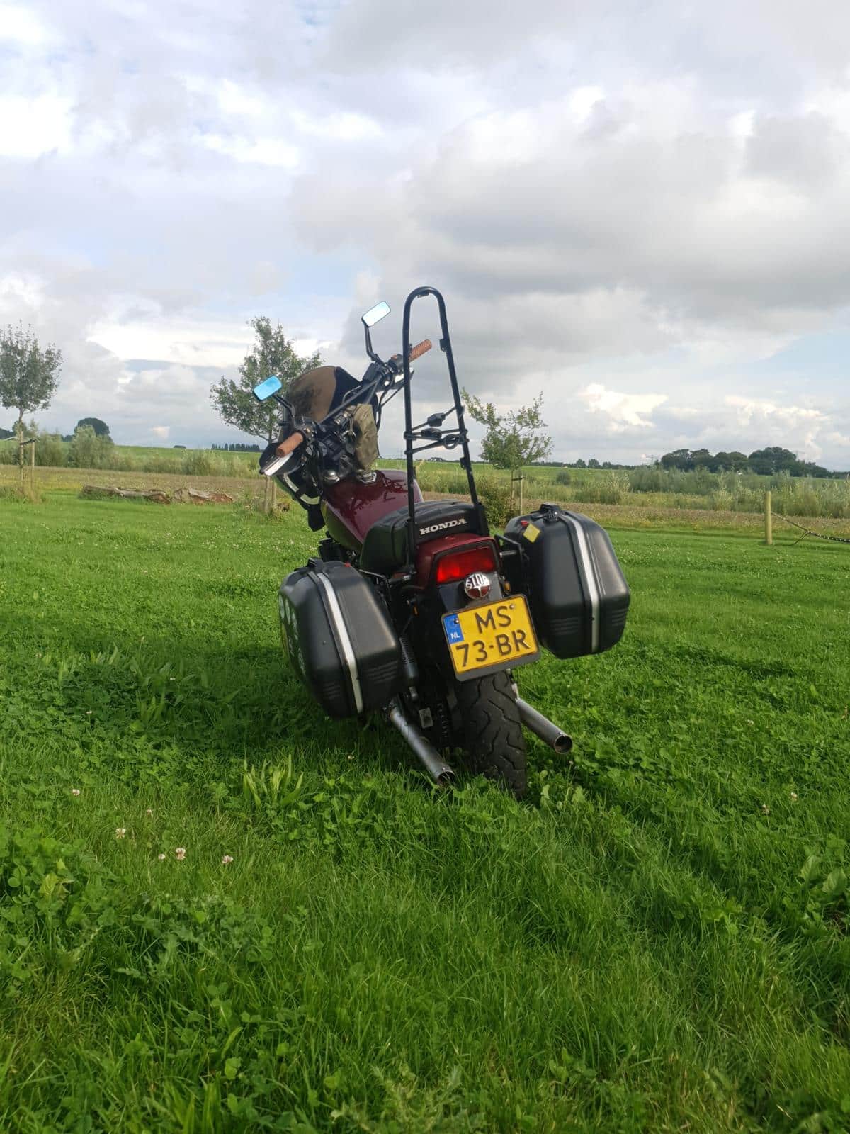 De standaard voetsteuntjes zijn vervangen door veel comfortabeler floorboards en schakelen doe ik met een zelf gemaakt hak-teen pedaal. Ook het montageframe voor de Givi koffers is eigenbouw en hetzelfde geldt voor de sissybar. Het is gewoon erg leuk om zulke onderdelen zelf te bedenken en op te bouwen. Ook het spuitwerk is eigenhandig uitgevoerd, gewoon met een spuitbusje. (Motip 51487 rood.) Natuurlijk ben ik blij met het resultaat en tenslotte ook nog een groot woord van dank aan mede-bouwer Bas van den Berg.