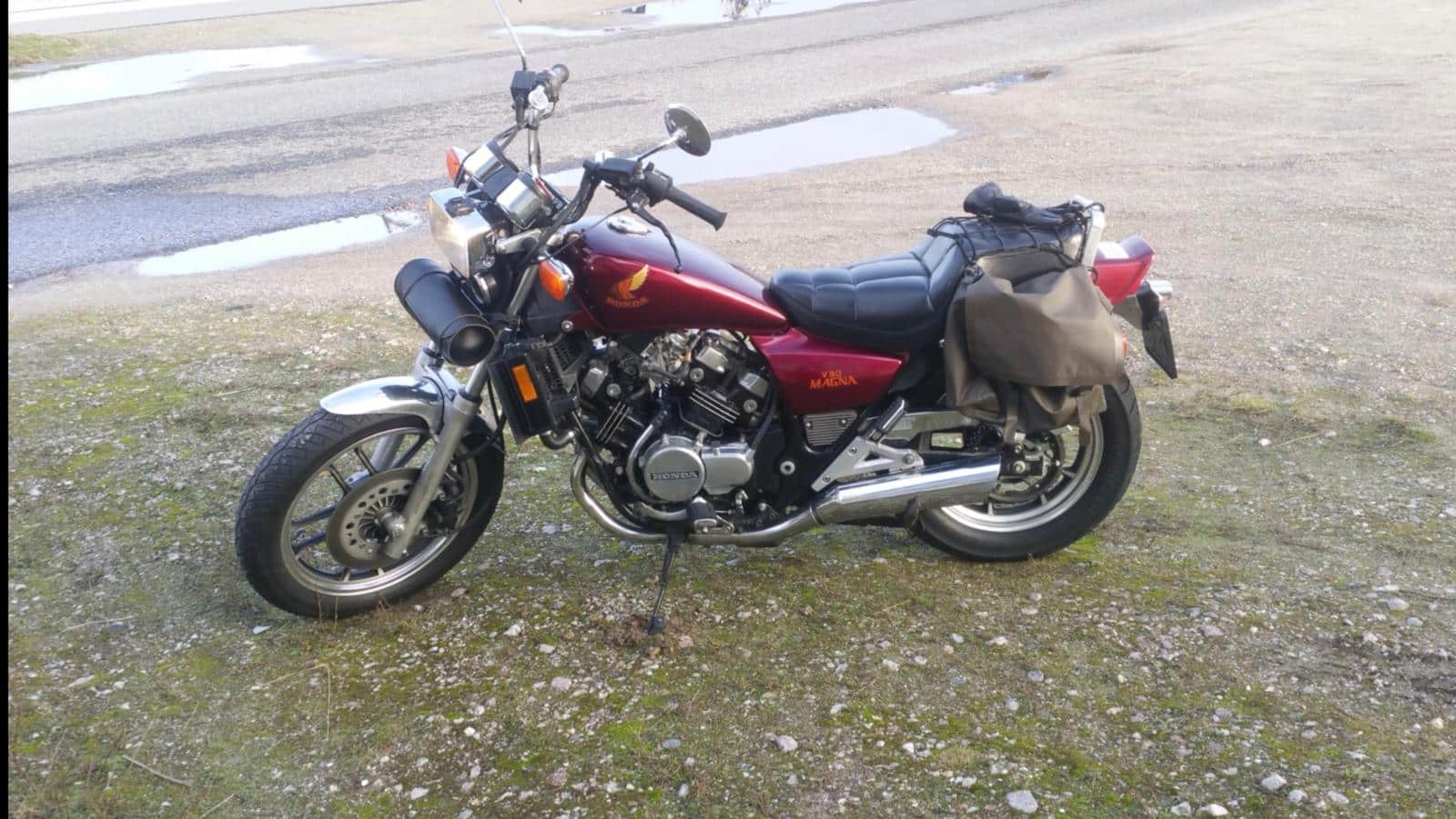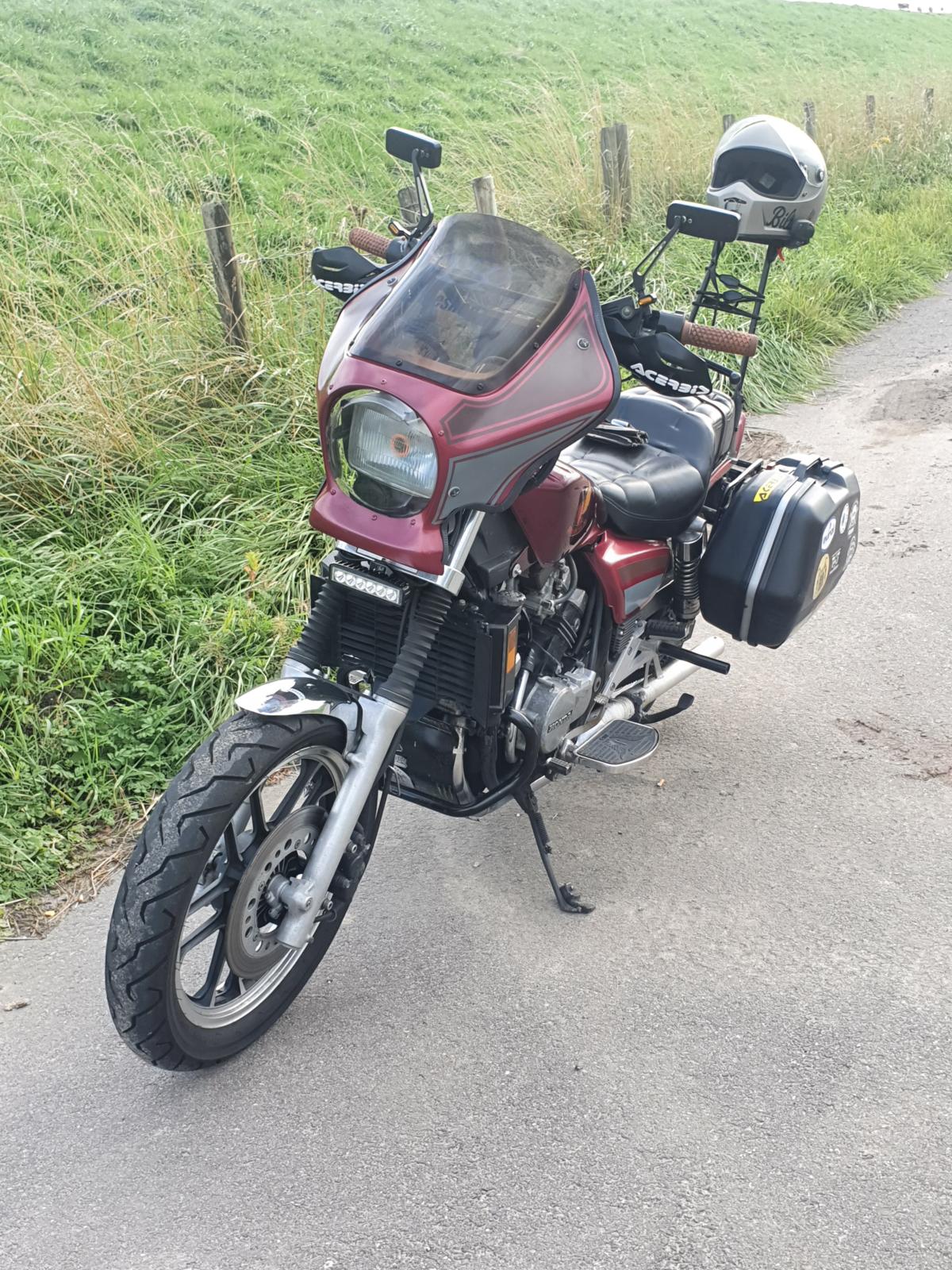 Het is oorspronkelijk een uit Amerika geïmporteerde motor met nog de Amerikaanse specs. Een 500 cc V4 met een goed schakelende zesbak eronder. Het uitlaatsysteem is nog deels origineel, maar de dempers zijn zelfbouw en ze laten een lekker donkerbruin geluid horen. De standaard achterschokbrekers heb ik vervangen door een wat zwaarder geveerde en beter dempende set van een Honda VF 750. Het stuur is van Moose Racing en de risers waarmee het bevestigd is zijn eigenbouw. De handvatten zijn Vans Cult en wat de oorsprong van de kuip is heeft tot nu toe nog niemand me kunnen vertellen. De echte kenners zullen misschien in de knipperlichten aftermarket H-D exemplaren herkennen.