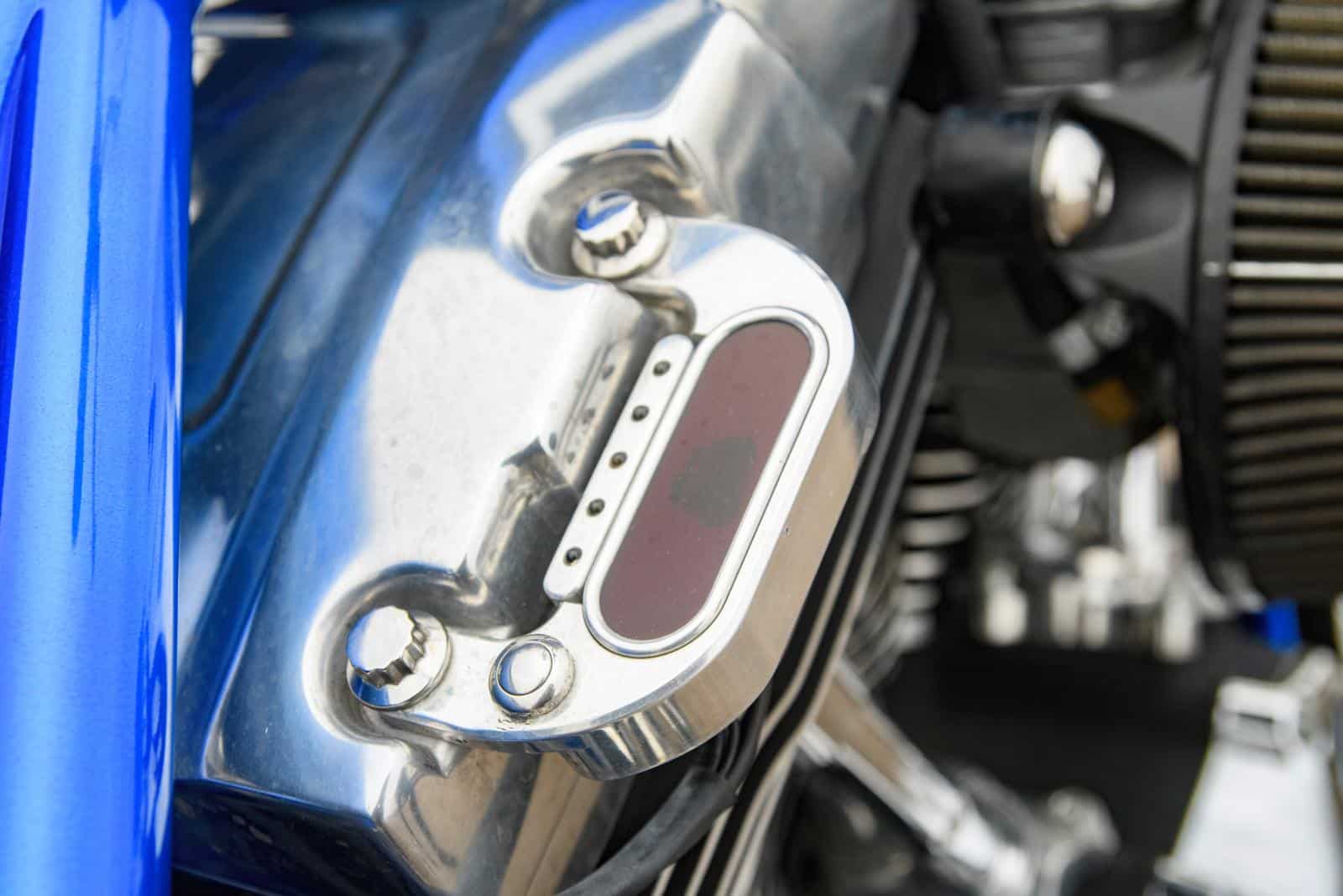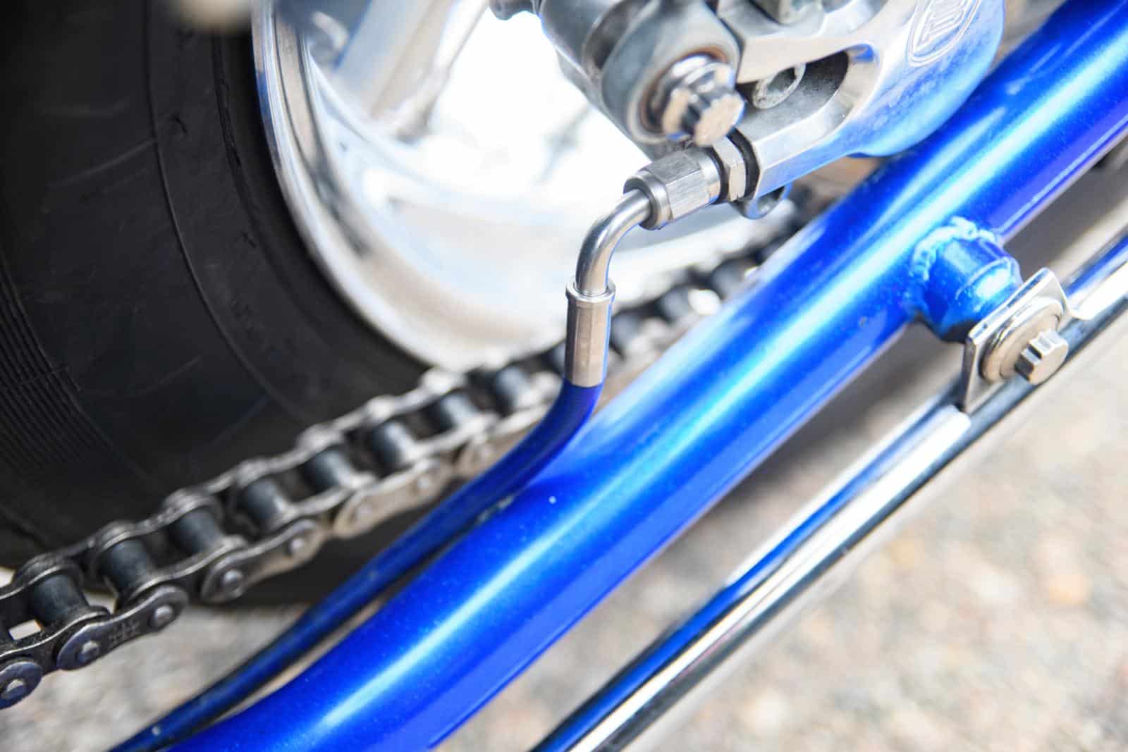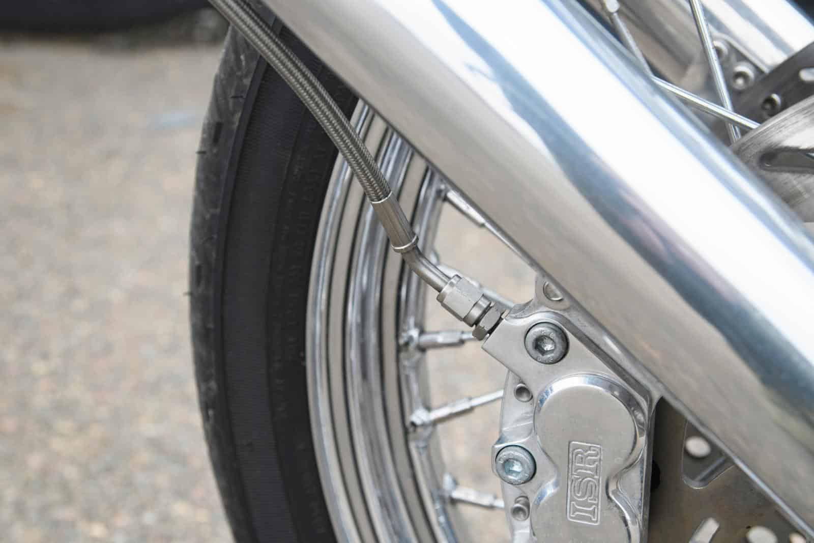 De echt kenners onder ons zullen bij het zien van de combinatie van coffin tank en lange Zweedse voorvork de link leggen met de Eagles in het Zweedse Jämtland. Die bouwstijl domineert bij de leden van die club, maar dan wel rondom een Panhead of Knucklehead. Als je Ronny’s bike beter bekijkt zul je zien dat het spuitwerk goed, maar niet echt helemaal perfect is. Maar let op de kwaliteit van bouw en je kan niet anders dan concluderen dat hier een professionele bouwer aan het werk geweest is. Details zoals de ophangpunten voor het spatbord, de knipperlichten, leidingen en elektra zijn een lust voor het oog. Als je ziet hoe de remleiding aan de voorzijde bevestigd zit, weet je meteen dat er met liefde en vakmanschap gewerkt is.