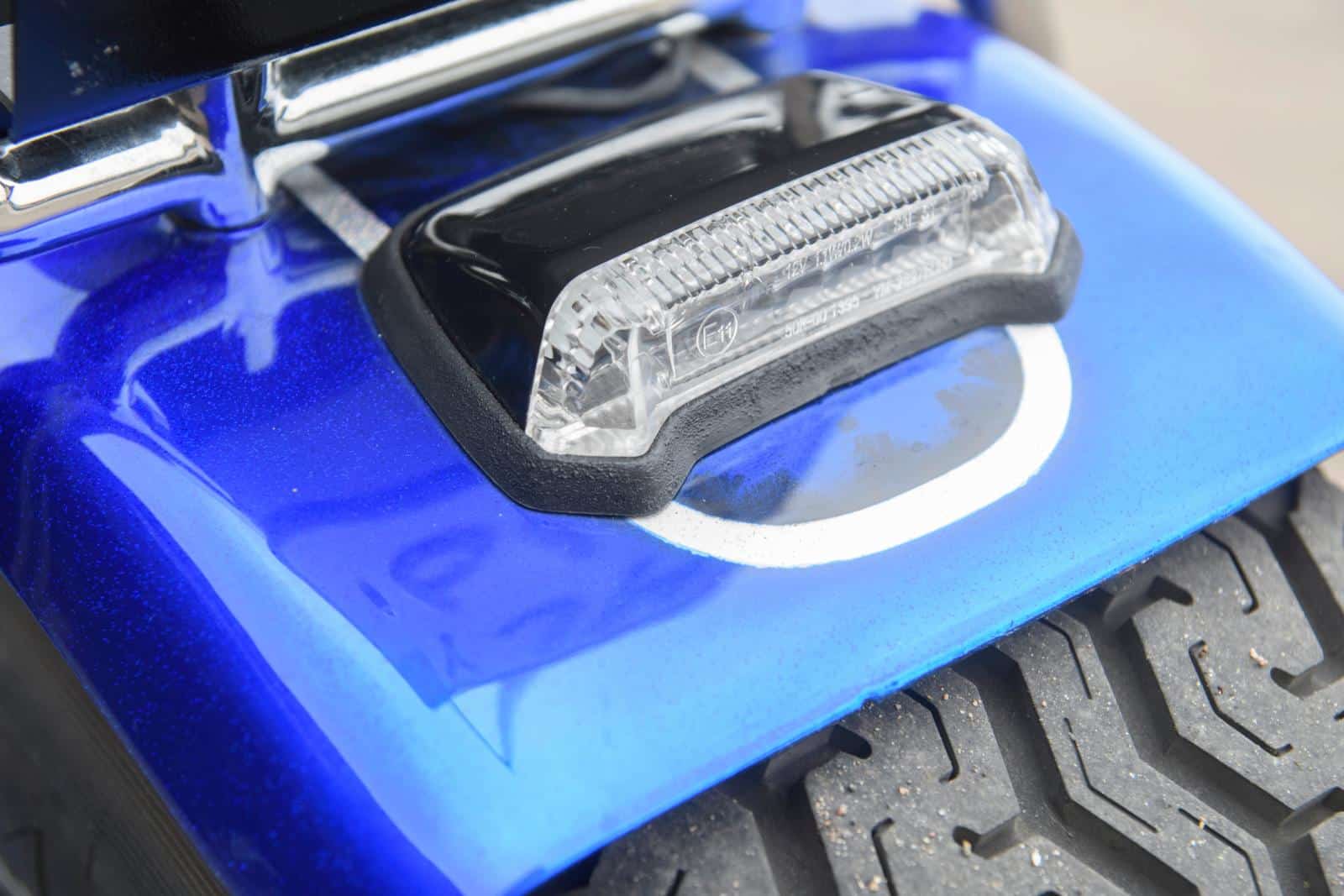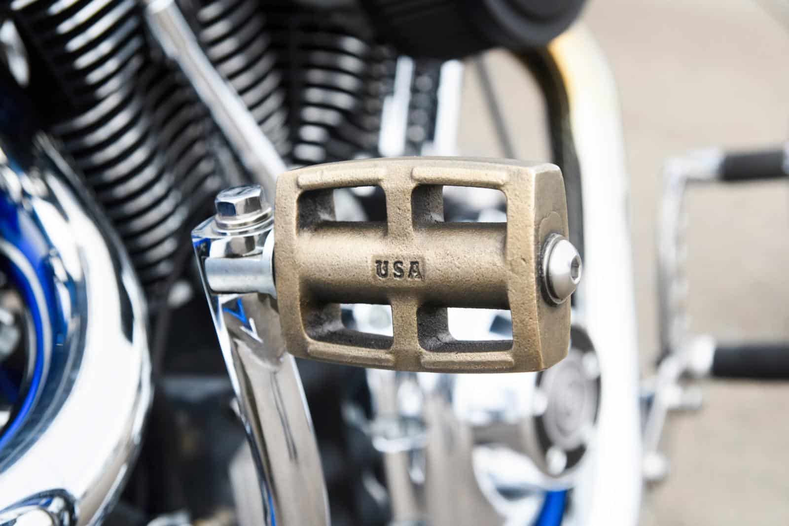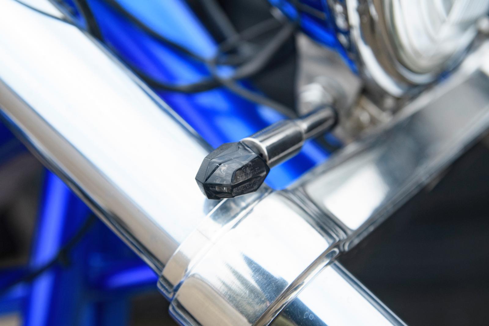 De echt kenners onder ons zullen bij het zien van de combinatie van coffin tank en lange Zweedse voorvork de link leggen met de Eagles in het Zweedse Jämtland. Die bouwstijl domineert bij de leden van die club, maar dan wel rondom een Panhead of Knucklehead. Als je Ronny’s bike beter bekijkt zul je zien dat het spuitwerk goed, maar niet echt helemaal perfect is. Maar let op de kwaliteit van bouw en je kan niet anders dan concluderen dat hier een professionele bouwer aan het werk geweest is. Details zoals de ophangpunten voor het spatbord, de knipperlichten, leidingen en elektra zijn een lust voor het oog. Als je ziet hoe de remleiding aan de voorzijde bevestigd zit, weet je meteen dat er met liefde en vakmanschap gewerkt is.
