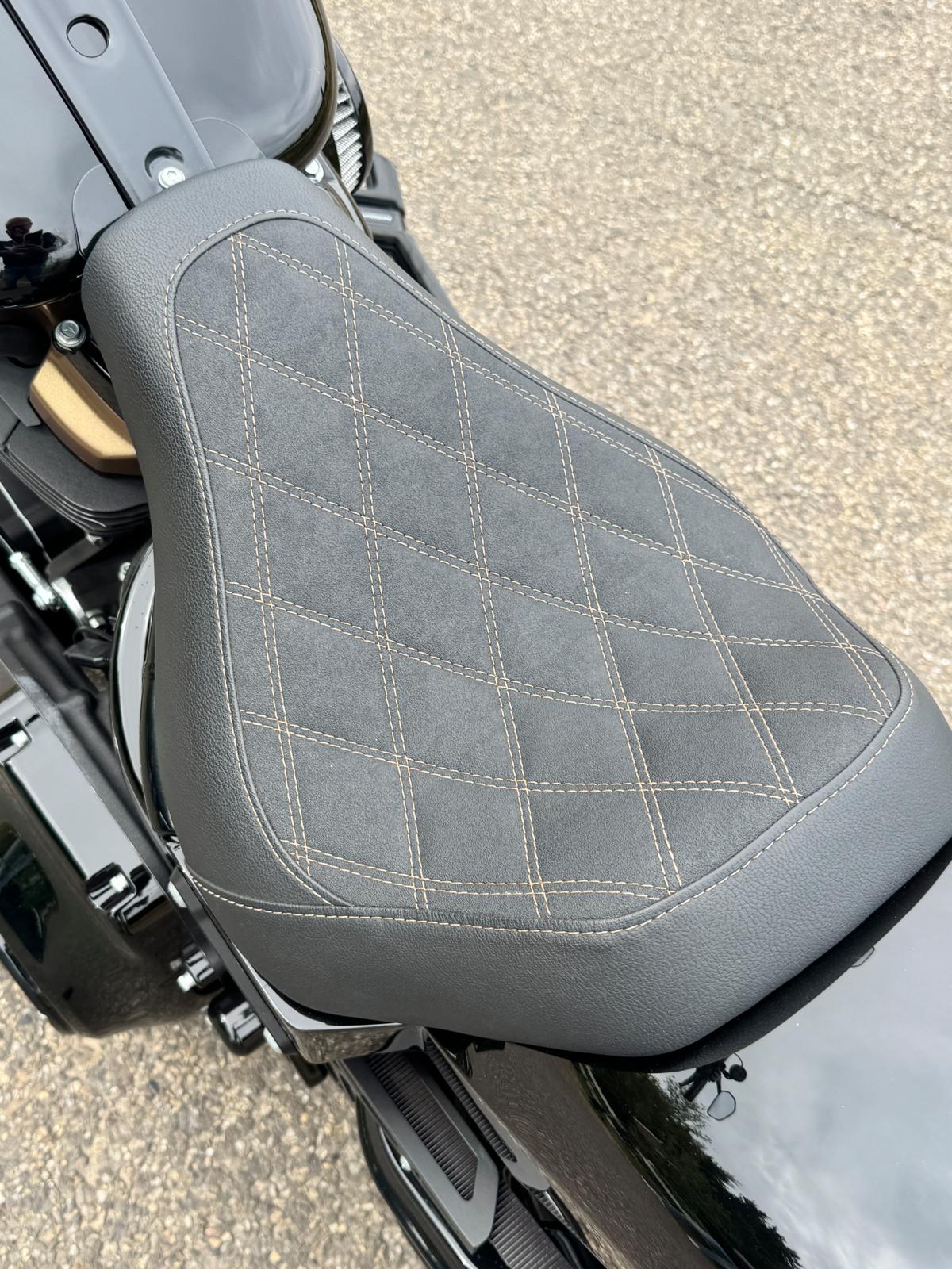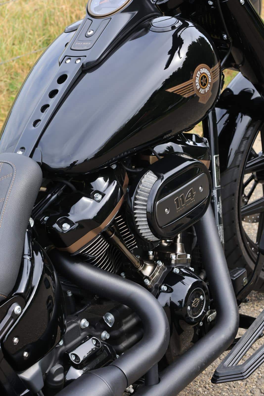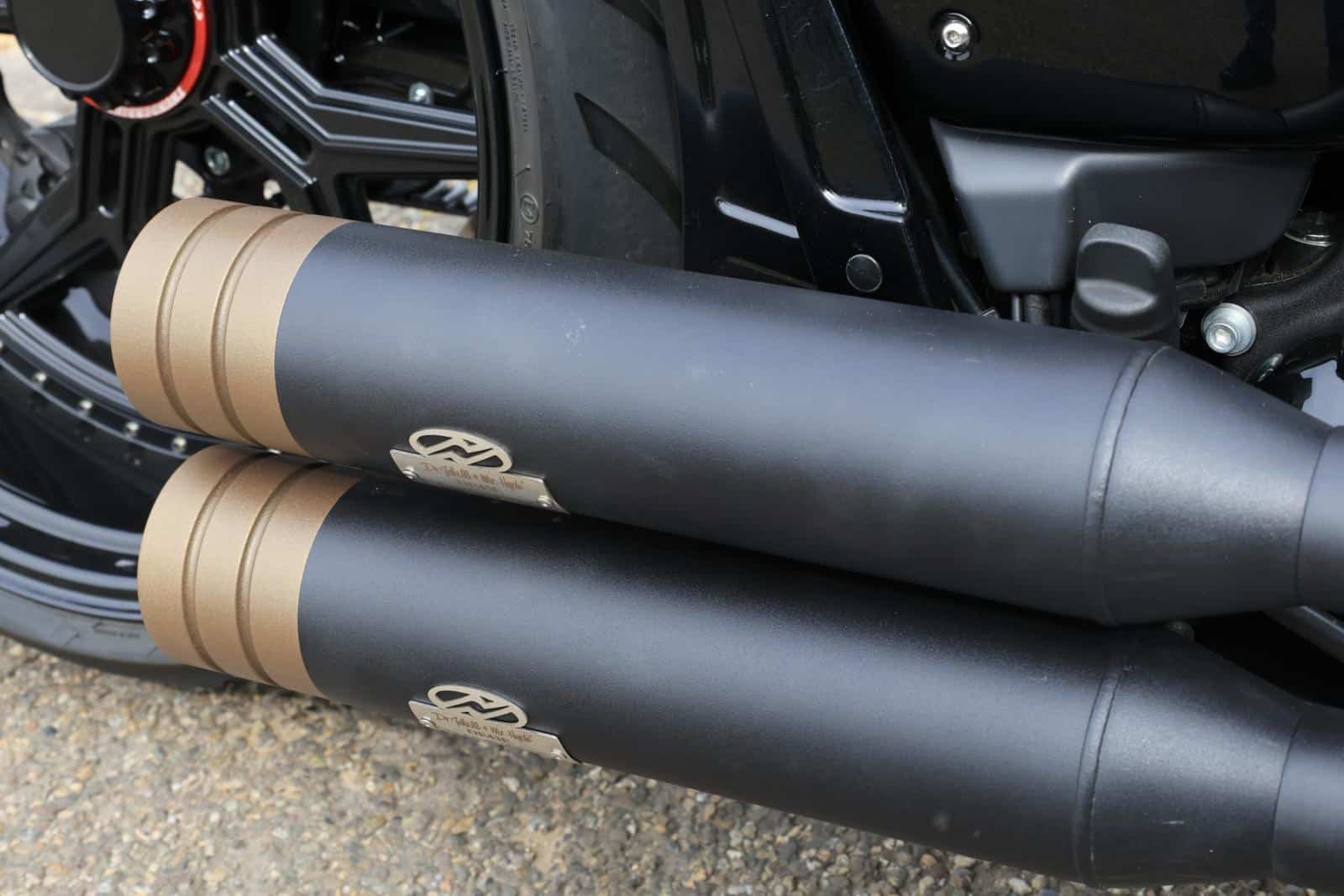 Hij vervolgt: “Bij het customizen van zo’n motor loop je uiteraard altijd tegen dingen aan waarvan je dacht, ‘dat gaat makkelijk passen’, maar waarvoor toch enige extra creativiteit nodig is om het echt te laten werken. Monteur Mark wist het allemaal op te lossen en hij maakte ook de handgemaakte basis voor het zadel tot een prachtig customzadel met bronskleurige diamant stiksels. De kleur brons is in deze motor overal subtiel zichtbaar. Er is een aantal extra details aangebracht, zoals het tanklogo dat ook op het custom achterspatbord, de klepdeksels en de bronskleurige end caps van het uitlaatsysteem gespoten is. Verder vonden wij dat de rand van de snelheidsmeter, in origineel chroom, niet goed paste bij de motor, dus die hebben wij ook in de kleur brons laten spuiten.” Daarbij zijn er veel accessoires op de motor gemonteerd, zoals de H-D Empire Series Footboards en de handvatten. Bas wilde bovendien graag de voorkant van de motor aan laten passen. Gekozen werd om de voorvork iets te laten zakken, zodat de motor een nog stoerdere look krijgt. “We hebben een mooi 1 inch apehanger stuur gemonteerd op deze ‘Dikke Jongen’”, vult Reinder aan. Door de subtiele belly pan spoiler lijkt de motor nòg lager.