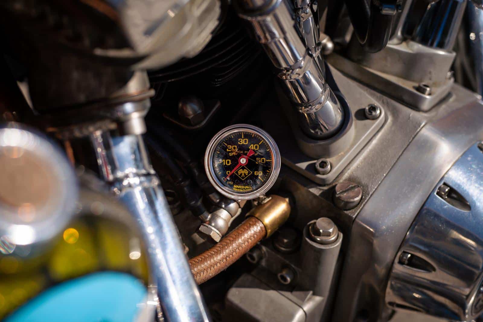 Het lettertype handgeschilderd met een penseel en vaste hand ademt de gloriedagen van de jaren zeventig. Choppers met lef, olie op de vloer en attitude in elk detail. Die gouden signatuur geeft de motor een rauwe old-school look. Onder het glanzende oppervlak ligt klassieke, maar puntgave techniek. Het Shovelhead-blok is volledig gereviseerd met nieuwe lagers, aangepaste klepzittingen, een S&S-carburateur en een one-off uitlaatsysteem dat Xiko zelf bouwde van roestvast staal. De motor ademt via een old-school luchtfilter en dat past samen met de smalle open belt helemaal bij de Rusty Wrench stijl. Het Electra Glide frame kreeg een kortere wielbasis wat de Shovel een compacte, gespierde houding geeft. De 16-inch voorvelg met een Panhead trommelrem en 16-inch achtervelg zijn opnieuw (gedraaid) gespaakt en hoogglans gepolijst. De velgen zijn voorzien van Shinko’s die eruitzien als klassiek rubber, maar rijden met moderne grip. De handgemaakte zitting van zwart leer sluit naadloos aan op de tanklijn en maakt het geheel visueel één vloeiende lijn staal en stijl. Elk detail ademt Xiko’s aandacht; van de koperen accenten in de bouten, tot de discrete kabelgeleiding. Zelfs de hendels zijn bewerkt met fijne slijpsporen zodat ze niet te netjes ogen. Het is alsof de machine zo uit een stoffige Californische garage is komen rijden. De afwerking is strak, maar met net genoeg patina om geloofwaardig te blijven. Alsof de fiets al heel wat kilometers, avonturen en nachten in de werkplaats heeft meegemaakt en precies dat maakt hem authentiek.