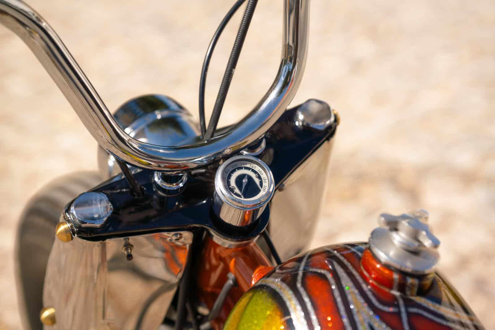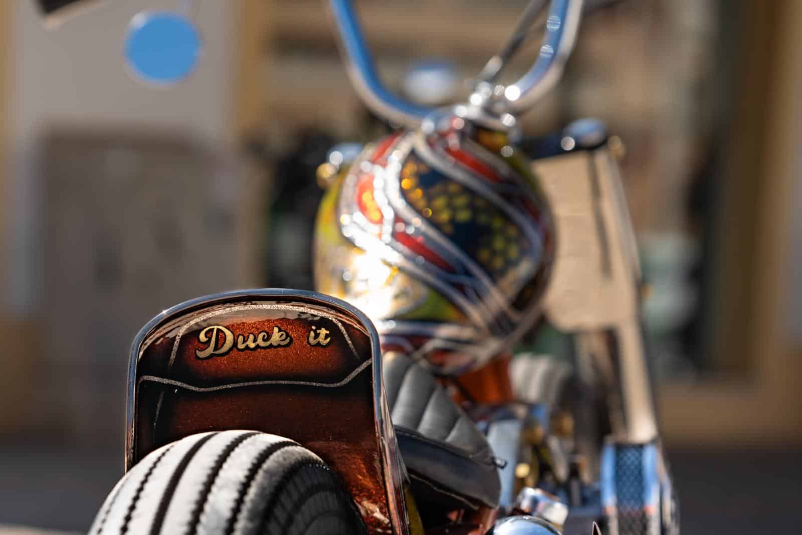 De blikvanger? Zonder twijfel de oliefiltercover, waarop een handgeschilderde Donald Duck te zien is met een bom in zijn hand en een vuist in de lucht. Dit is een directe verwijzing naar de WO II bommenwerpers waarop piloten hun toestellen een persoonlijke touch gaven. “Ik wilde iets met humor, maar ook geschiedenis”, verklaart Xiko. “Donald Duck was altijd al een symbool van lef, brutaliteit en vooral eigenwijsheid, wat perfect past bij deze fiets.” De tank is een kunstwerk op zich. Handgevormd uit staal, tot op de honderdste millimeter gladgeslepen en vervolgens voorzien van meerdere lagen candy-lak in koper, rood en goud. Letterlijk en figuurlijk schitterende kleuren die in het zonlicht extra tot leven lijken te komen. Geen standaard spuitwerk maar puur old-school ambacht; laag over laag en gepolijst tot het glanst als vloeibaar metaal. “We wilden dat de lak zou leven”, zegt Xiko. “Dat hij in elke hoek iets anders laat zien. Als je hem in de schaduw zet, is hij donker en dreigend. In de zon gloeit hij als een vlam.”