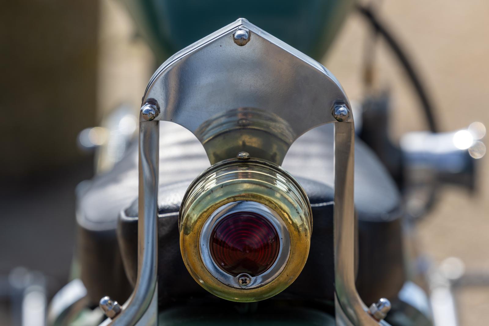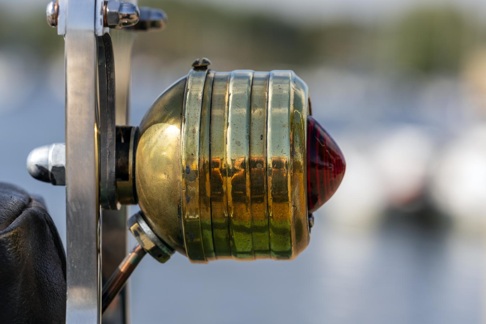 Ik had nog niet bedacht hoe ik dat andere achterspatbord zou gaan bevestigen, maar realiseerde me toen dat ik een sissybar kon maken die het spatbord ondersteunt. Wat het materiaal van de sissybar betreft twijfelde ik tussen gewoon staal en dat laten verchromen en rvs en dat polijsten. Het werd rvs dat ik bestelde in 12 mm vierkant. Vervolgens moest ik nog gaan uitvinden hoe ik dat mooi zou kunnen gaan buigen. Het werd uiteindelijk een soort van mal die ik uit twee stalen platen maakte met behulp van mijn goeie-ouwe Atlas draaibank uit 1948. Ik maakte eerst een aantal verschillende sissybars uit hout voordat ik precies wist hoe ik het wilde hebben. Nadat ik de sissybar klaar had was het tijd voor het achterlicht. Daarvoor wilde ik een oude bronzen brandblusser gebruiken, waarin ik een Sparto achterlicht plaatste. Vroeg wel weer een beetje geknutsel op de draaibank, maar het lukte! De elektra vernieuwen en zelf aanleggen was een nachtmerrie. Dat was iets waar ik echt geen enkele ervaring mee had, dus onnodig om te zeggen dat dit allemaal niet vanzelf ging. Informatie opzoeken en lezen is niet echt mijn sterkste punt, vrees ik…