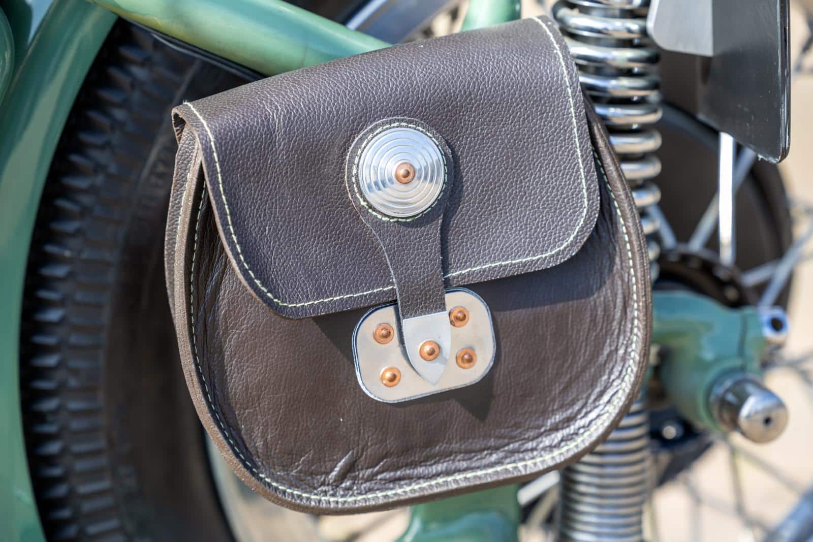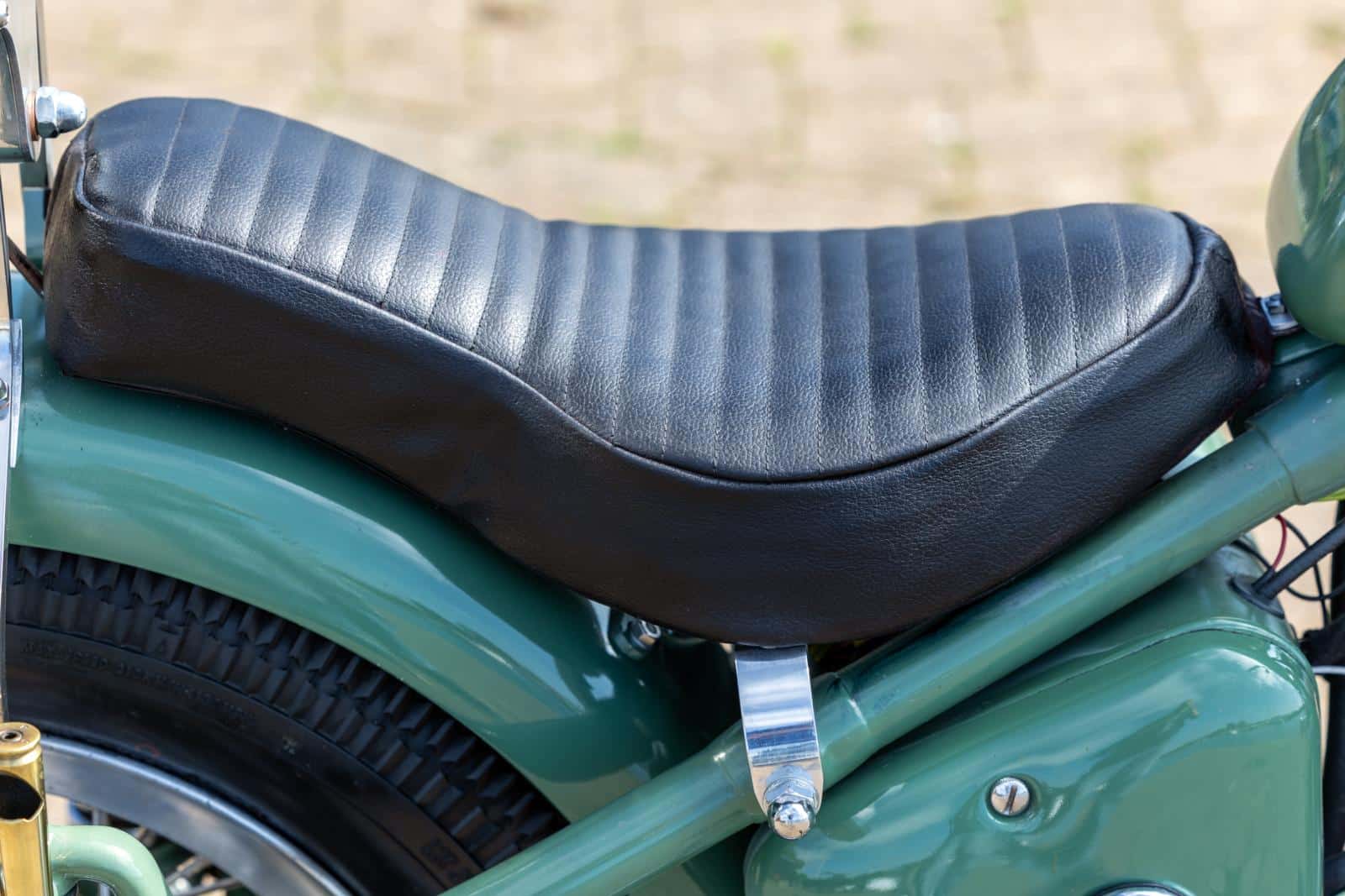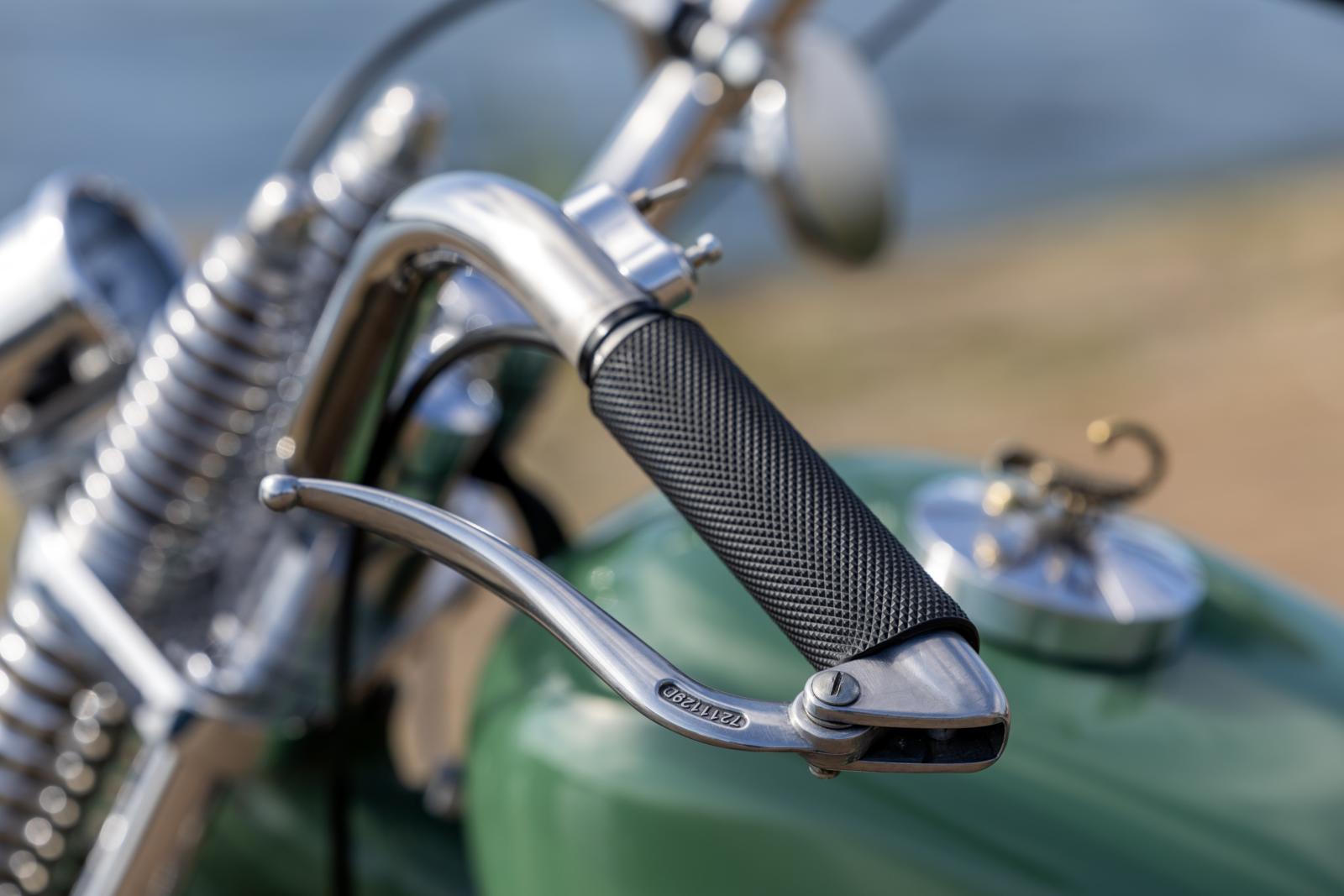 Het volgende onderdeel was de tank. De originele tank was gigantisch groot en ik denk dat ik op één tank benzine naar Schotland en terug had kunnen rijden. Met wat kleine modificaties bleek de tank van een Harley Sportster 883 perfect te passen. De tankdop maakte ik ook zelf. Voor het zadel kocht ik een stalen plaat waaruit ik de zadelbodem vormde. Duurde wel even voordat ik door had hoe ik dat het beste kon doen, maar okee… Vervolgens de vulling van schuim en de bekleding uit leer. Het naaiwerk deed ik deels met de hand en deels met mijn oude Singer naaimachine. Daarna pakte ik de voorvork beet, waarvoor ik zelf nieuwe bussen draaide op de draaibank. Ook de koplamp kwam aan de beurt; ik verwijderde de laklaag en polijstte het metaal van de body. Het roostertje voor het glas werd iets aangepast en met een ijzerzaag en mijn draaibank werd de rand van de koplamp veel gladder gemaakt. De dynamo werd door mij gereviseerd, want ik denk niet dat er ooit iets aan gedaan was. Als finishing touch maakte ik er een covertje voor, zodat het er wat beter uit ziet. Heb wel extra plezier beleefd aan het spuitwerk, aangezien ik dat twee keer moest doen… De primer die ik in eerste instantie gebruikte bleek een bijzonder rimpel-effect op de verf te hebben. Niet echt wat ik voor ogen had, dus -na advies van mijn schoonzoon- nog eens proberen, maar dan wel met de juiste primer.
