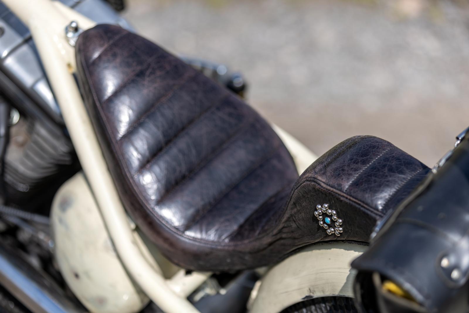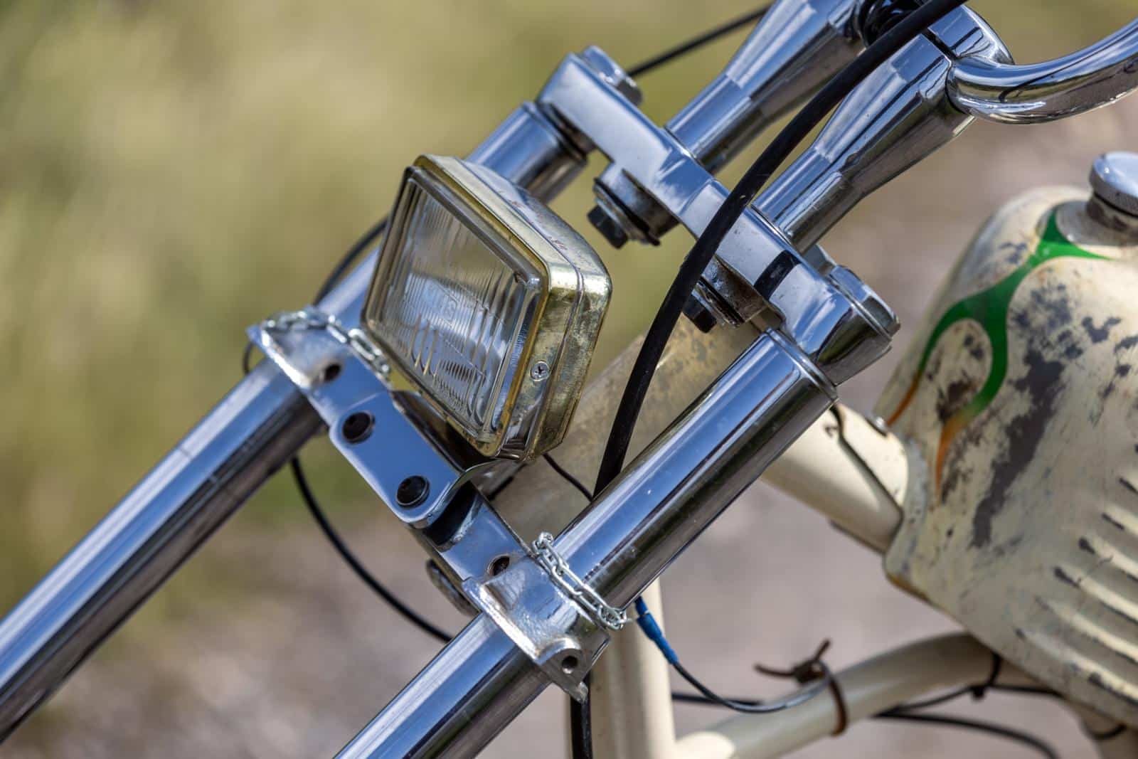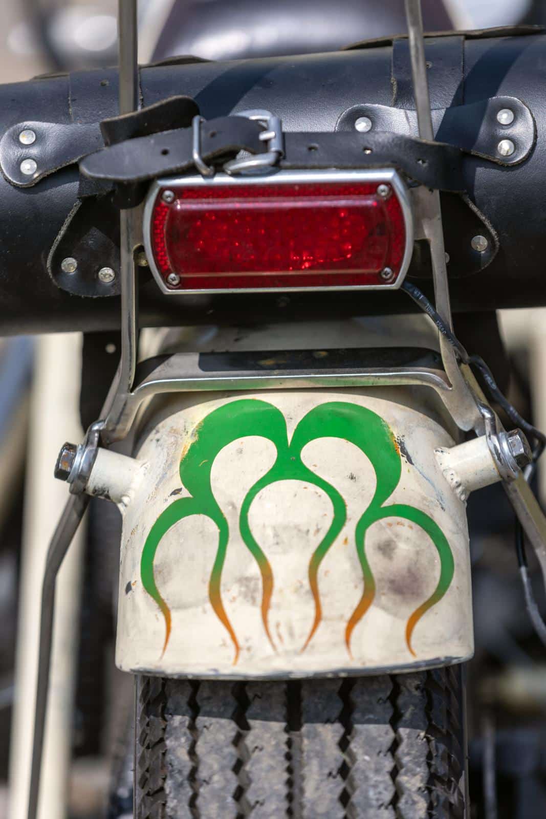 Op het moment dat ik de motor spotte op eBay had ik een soort van droom rond een bike met een lange vork en een zeldzame tank in een crèmekleurige paintjob. En kijk: hier is-ie dan in al zijn glorie: ‘The Cream Dream Machine’! De tank is een aluminium custom tank uit de jaren 80 en een van mijn meest favoriete onderdelen op de bike. Ik wilde ook altijd al eens groen en oranje flames op een van mijn motoren en nu het ervan gekomen is, ben ik toch nog verbaasd dat het zo goed werkt.