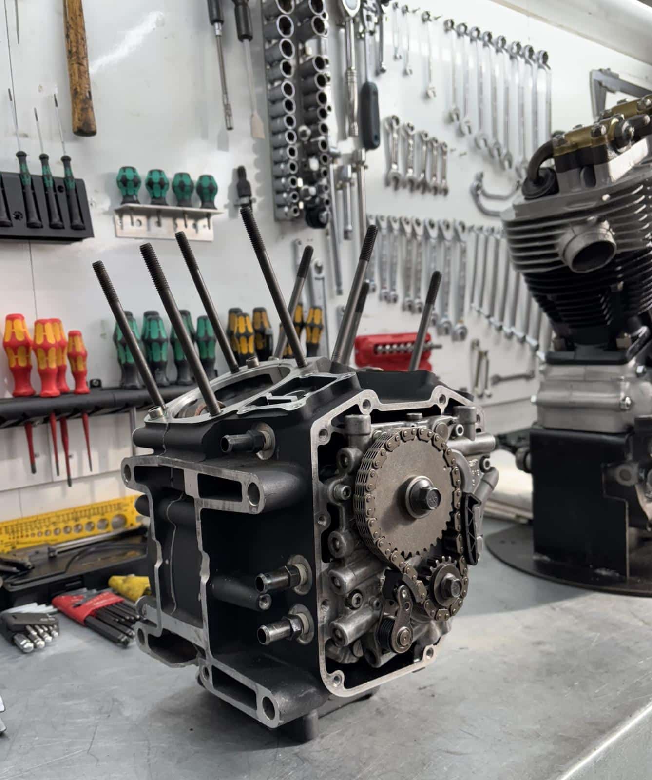 Dit keer geen spaakwielen, maar voor de looks en stijl van de chopper gaan wij de TwinPan voorzien van gave alu one-piece Rick’s Zodiac ‘Seven Sins’ wielen in 21×2.15 voor en 18×5.50 achter. In overleg met de mannen van Zodiac worden die wielen ten tijde van dit artikel al gefreesd zodat ze op de Bigtwin Bikeshow al gemonteerd kunnen zijn. Omdat ik altijd benieuwd ben hoe het er uit gaat zien, zet ik de bike alvast op wielen en een tijdelijke voorvork. Zo kan ik zien of het plaatje in mijn hoofd klopt met de werkelijkheid. En zo kun je ook goed bekijken welke lengte vork je wil gebruiken. Deze standaard vork is duidelijk te kort. Dit kan natuurlijk ook met allerlei computerprogramma’s, maar zo kan dit ook makkelijk in je eigen schuurtje. Voor de voorvork gaan wij een Zodiac Slim Bubba gebruiken, maar daarover de volgende keer meer. Mijn maat Dennis Bakker is alvast begonnen met de opbouw van het TwinPan blok, dus gebruik ik als mock-up maar even mijn Panhead pasblokkie. Is bijna hetzelfde.