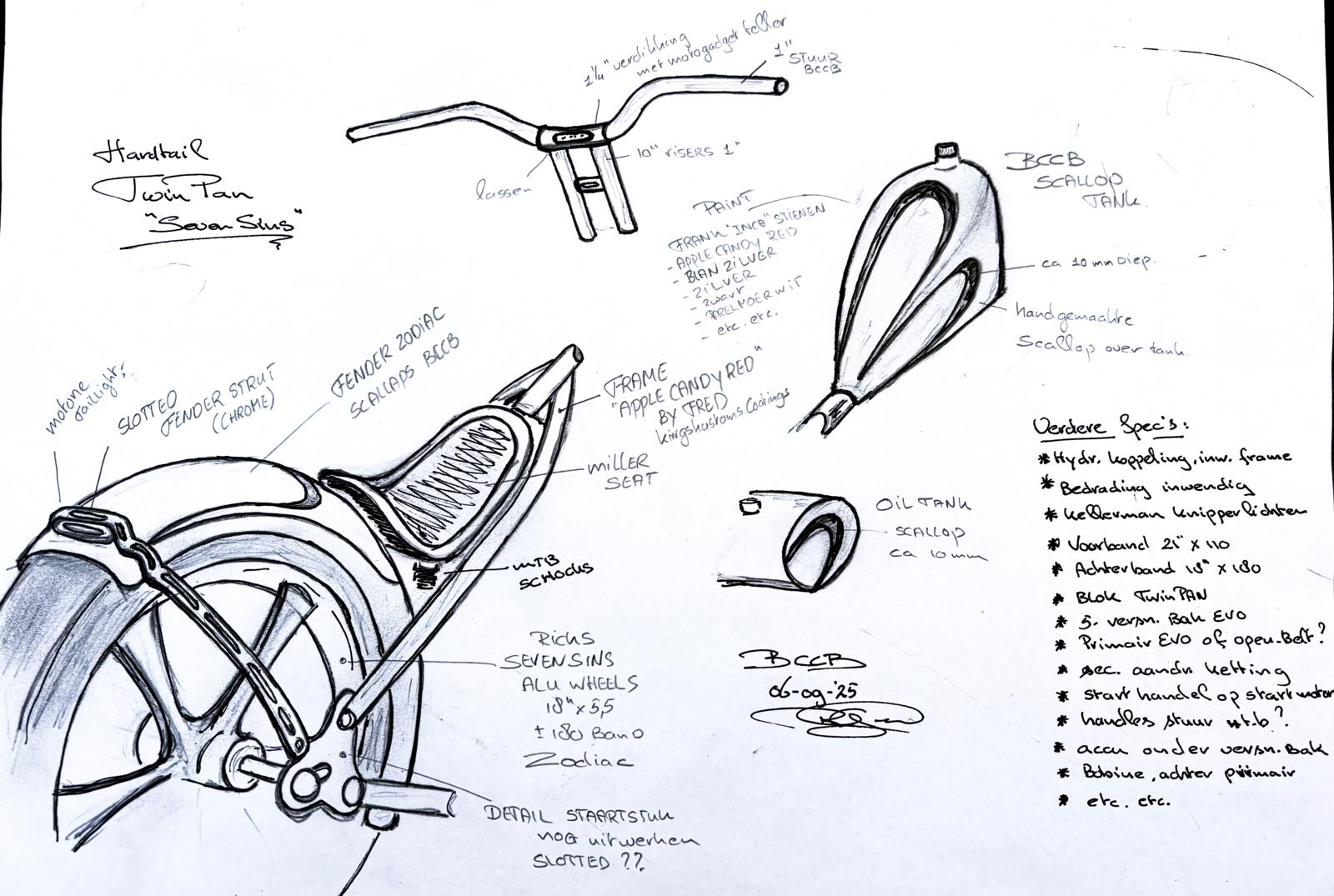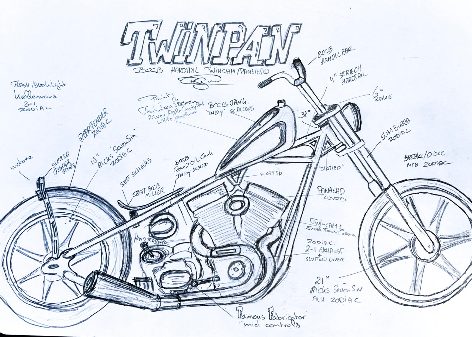 Hoewel ik veel van mijn ideeën kwijt kan in onze bouwsels loop ik al langer met de gedachten om iets te gaan doen met dat hardtail frame dat alweer een paar jaar in de hoek staat te verstoffen. Ondanks dat ik helemaal gecharmeerd ben van de oude H-D blokken Knuckle, Pan, Shovel en natuurlijk ook inmiddels de Evo (Evoisthenewoldskool) heb ik besloten om mijn grenzen te verleggen en dit gave hardtail frame van een Twincam powerbron te gaan voorzien. Dit mag natuurlijk geen standaard uitvoering worden, haha. Na overleg met mijn maat Dennis Bakker van Small Town Customs, heb ik besloten om er een TwinPan van te maken met een ‘traditionele Evo vijfbak. Met alle wilde ideeën in mijn hoofd moest ik toch eerst nog even op vakantie, moet tenslotte ook gebeuren. Maar tijdens ’n vakantie heb je ook tijd om na te denken over zo’n project. Bij gebrek aan een laptoppie op de camping, gewoon ouderwets met mijn schetsboekje aan de slag om de ideeën op papier te zetten met wat eenvoudige schetsjes. Als ik zelf maar weet wat ik bedoel, haha.