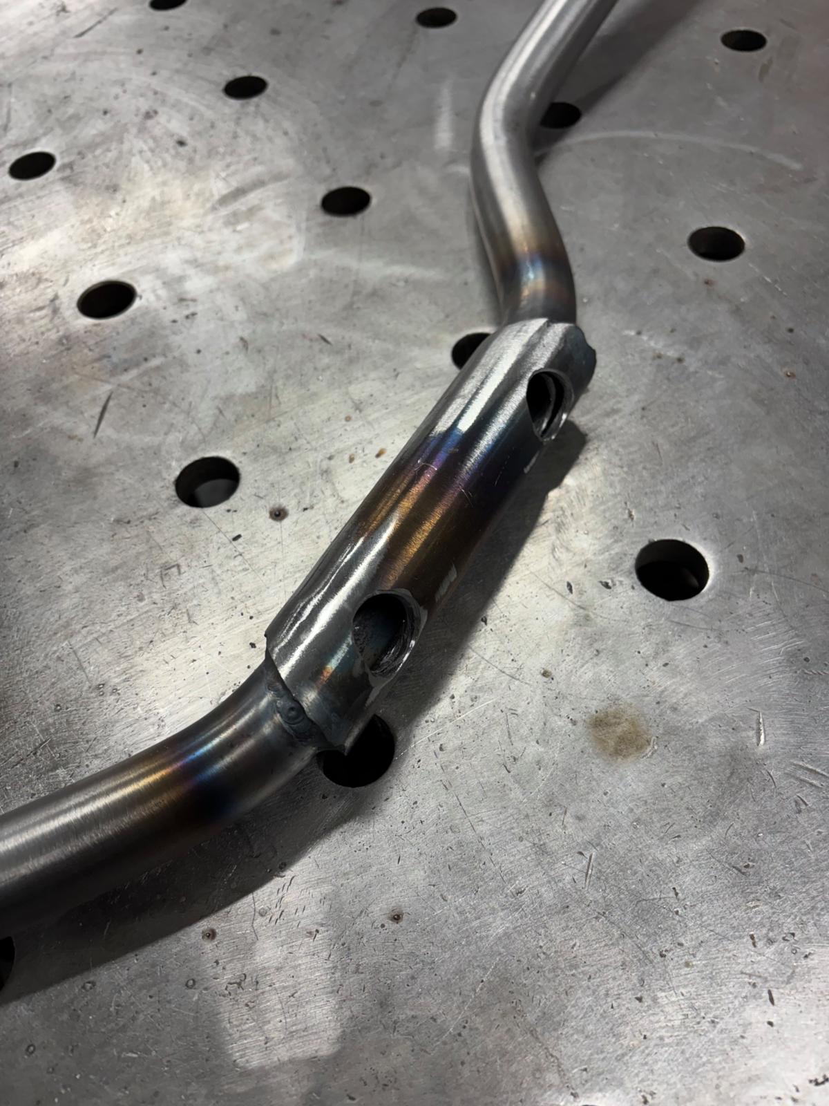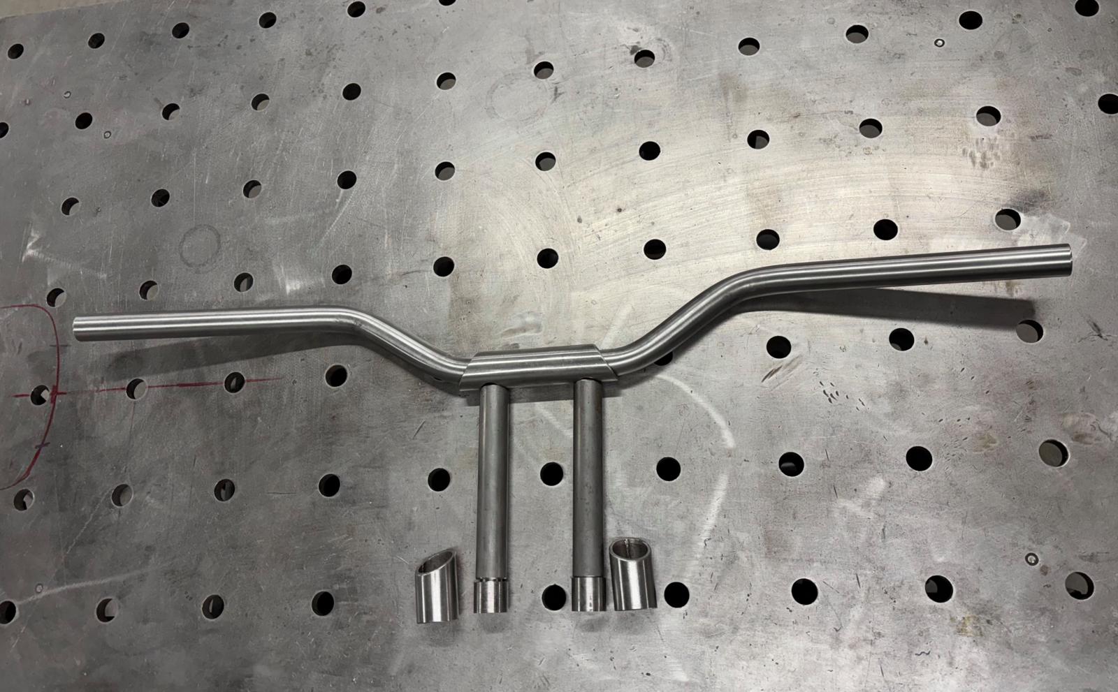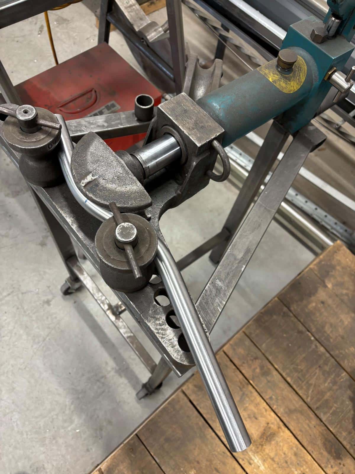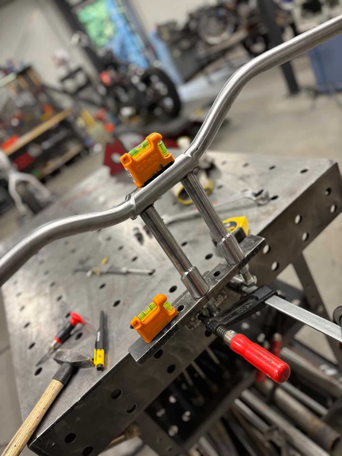 Omdat ik de bike een eigen BCCB stijl wil meegeven, ga ik het stuur zelf maken. Ik gebruik hiervoor 1” dikwandige buis die ik in de gewenste vorm buig met de pers. Ik wil vast gelaste 8” risers gaan gebruiken en omdat ik in het midden van het stuur een digitale teller wil plaatsen gebruik ik hiervoor 35 mm buis die ik schuin afzaag en rondom met tig aflas en glad slijp. Waarom ik deze buis schuin afzaag? Gewoon omdat er gaaf uitziet, haha. Hetzelfde doe ik met de proppen aan de onderzijde van de risers. Ik voorzie tevens alles van gaten zodat ik straks de bedrading/rem- en koppelings leidingen door het stuur en risers kan laten lopen voor de cleane looks. In het midden van de risers maak ik nog een ‘slotted’ strip. Niet echt nodig, maar het smoelt wel goed!