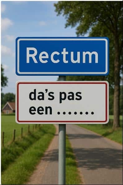 Natuurlijk hadden we het ook over Rectum zelf. We toerden wat rond, en ik vertelde hem over mijn plan om het plaatsnaambord aan te vullen met een onderbord: ‘da’s pas een gat’. Dat plan is er nooit van gekomen, maar ik vind het nog steeds een leuke grap. Dus vroeg ik onlangs aan ChatGPT om zo’n bord te ontwerpen. Helaas — de kunstmatige intelligentie bleek roomser dan de paus: