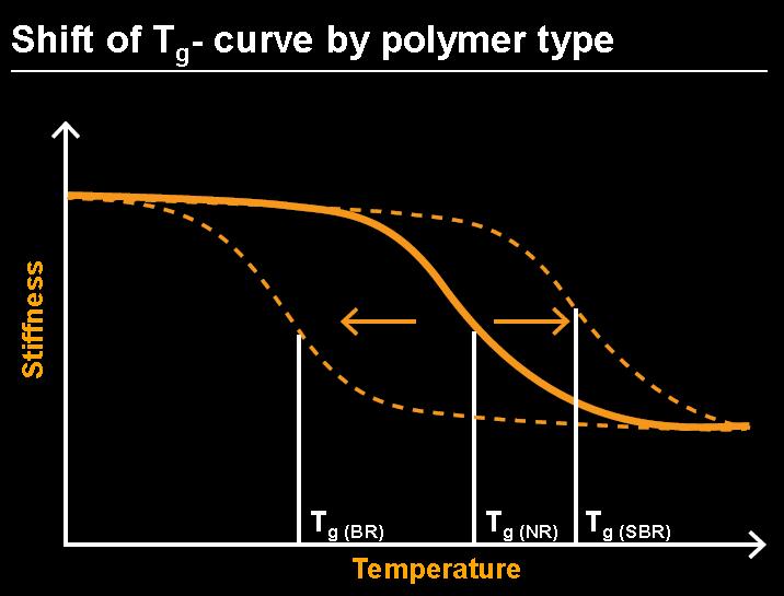 Grof gezien zijn er daarbij vier belangrijke hoofdgroepen. De eerste daarvan zijn de rubberpolymeren. Wanneer styreen-butadieenrubber aan natuurrubber wordt toegevoegd, stijgt de temperatuur waarbij rubber soepel wordt. Het moet dus warmer zijn voordat het rubber ‘werkt’. De verhouding tussen styreen en de hoeveelheid vinylgroepen in dit rubber – dus het soort styreen-butadieenrubber – maakt ook nog uit. Maar voor winterbanden kun je beter butadieenrubber gebruiken. Dat verlaagt het omslagtraject van soepel naar stug, zodat het rubber bij kou beter soepel blijft. Waarbij het ook nog belangrijk is hoe de rubbersoorten aan elkaar zijn gehecht, want ook dat verandert de structuur.