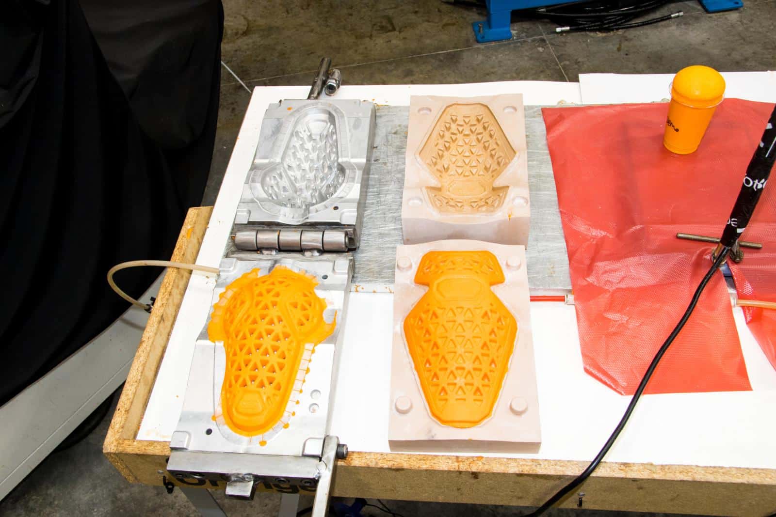 Het produceren van een prototype gebeurt ook in Croydon. Er worden mallen gevreesd uit aluminium of kunststof of ze worden ge-3D-print. Dat is allemaal afhankelijk van hoe de protector uiteindelijk zal worden geproduceerd. Daarvoor heeft D3O twee productiemethoden. De eerste is een spuitgietmachine. Daarin wordt een kunststofgranulaat gesmolten en in een mal gespoten. Na het afkoelen kunnen de twee helften van de mal uit elkaar worden geschoven en kan de protector worden uitgenomen. De tweede methode is om een tweecomponentenmateriaal op PU-basis te mengen, in een mal te gieten en deze te laten expanderen en te laten uitharden. ‘Het duurt op deze manier acht minuten om een schuimprotector te maken, terwijl een spuitgietprotector dertig seconden vergt. De spuitgietprotector kan dunner worden gemaakt en is minder stijf. Dat zie je onder andere in onze nieuwe “Diablo”-protectoren. Die zijn dunner, soepeler, hebben een betere temperatuurstabiliteit en ze halen toch alle testen,’ aldus Sian.