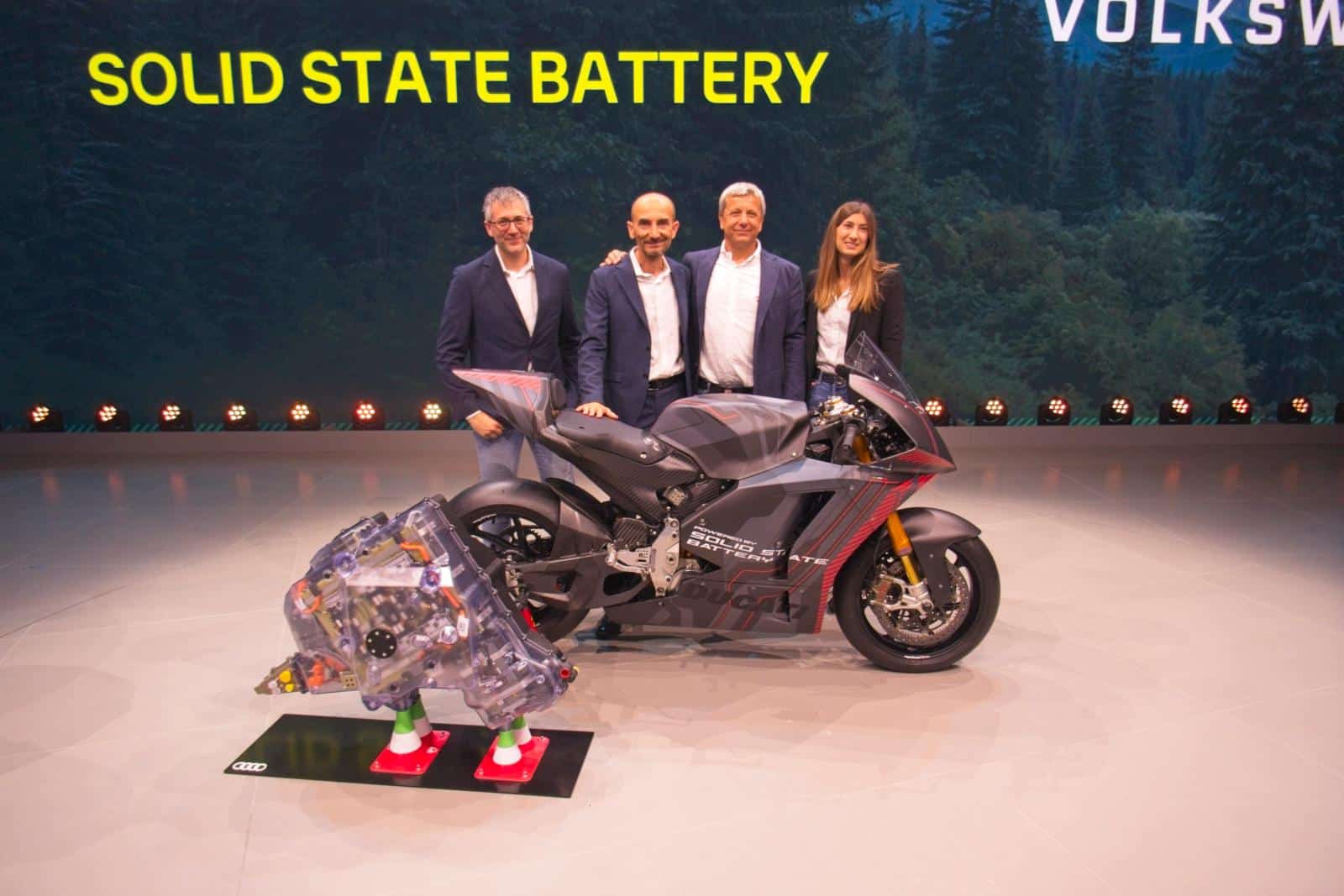 Actieradius en laadtijd zijn qua acceptatie onlosmakelijk met elkaar verbonden. Elke honderd kilometer moeten laden is niet prettig, maar als dat laden dan ook nog uren duurt, dan is dat voor allesbehalve stadsverkeer een vette no-no. Als je de batterij in vijf minuten kunt snelladen, dan wordt het al een ander verhaal. En als je 400 km op een lading kunt halen en dan twee uur moet laden, dan gaat het ook. Koffie en lunch en je kunt weer. Het vergt een relaxte state of mind, maar à la. Het wordt pas echt mooi als je na 400 km in vijf minuten kunt laden. Helaas was dat laatste tot nu toe een utopie. Dat zou veranderen met de solid state-batterij, maar dat leek lange tijd een soort onbereikbare Heilige Graal. De laatste tien jaar zou hij over drie jaar klaar zijn voor productie. En dat is tien jaar zo gebleven. Tot nu, want op de IAA Mobility stond Ducati op de Volkswagen-stand met hun e-racer, voorzien van solid state-batterij. Ook het Finse Verge zegt over deze batterij te beschikken, gemaakt door Donut Lab.