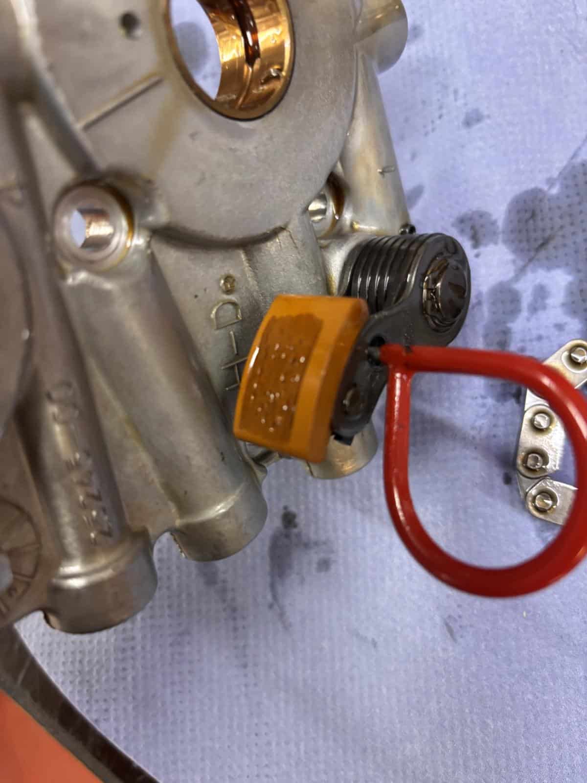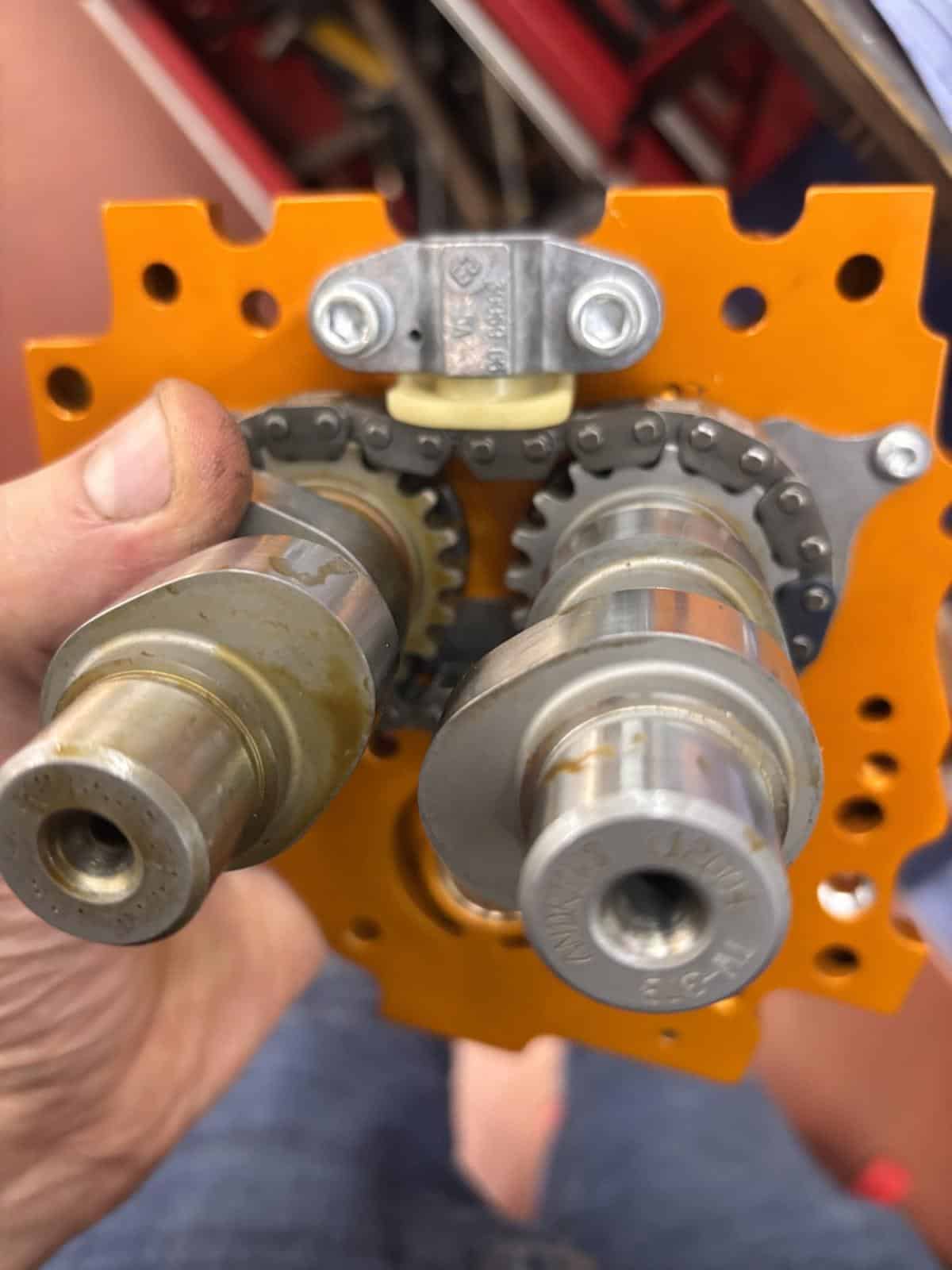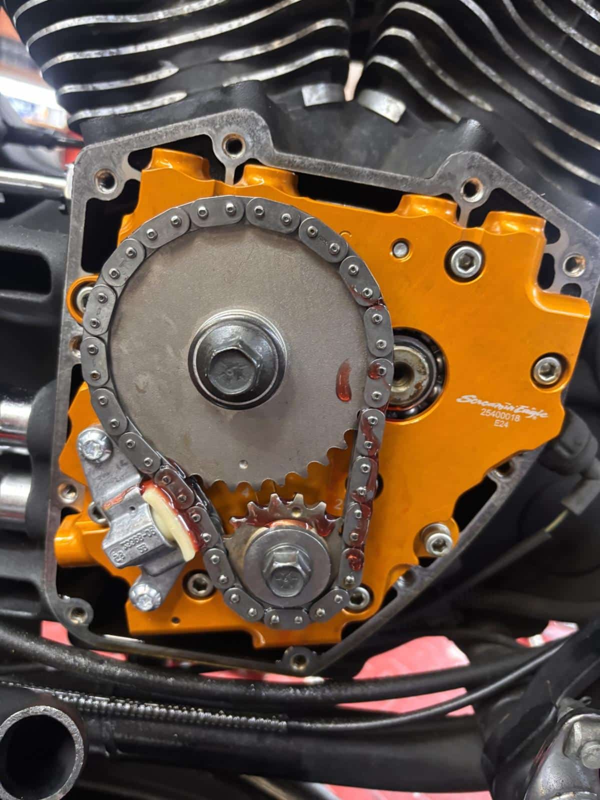 Met een km. stand van 55.000 kun je er zeker van uitgaan dat de spanners eruit moeten en waarschijnlijk is dat zelfs al de tweede keer. Dan heb je wel de keuze om er wat mee te doen. Je kunt ze uiteraard gewoon vervangen, wat de goedkoopste optie is. Twee spanners erin, middagje sleutelen en klaar. Je kan ook denken aan tandwielen i.p.v. kettingen maar het gevaar daarvan is dat de meeste krukassen van Harley nogal wat slingeren aan het uiteinde en daar zit nou net het tandwiel. Een tandwiel kan maar weinig slingering hebben zeg maar, een ketting kan dit wel en daarom zit die er ook in. Screamin’ Eagle maakt een mooie kit, een hybride set zeg maar. Je krijgt een nieuwe cam support plate, van billet aluminium waar geen glijlagers in gaan, maar waar wel de nieuwe pomp van Harley op past. Die zit er ook bij in de kit. Ook het tandwiel van de krukas en nokkenas zit erbij met ketting en twee hydraulische spanners. Je kunt met deze kit dus zo’n beetje 2/3 van de voordelen pakken van het nieuwe type. Je kunt gewoon de oude nokkenassen weer terugplaatsen als je dat zou willen, maar dat gaan wij niet doen. We pakken een setje nokken met wat meer ‘bite’; Andrews TW37B. Mooie cam die in het midden presteert, perfect voor een Dyna of een Softail. De cams zijn recht toe recht aan te monteren en ik vervang alle vier de lagers door een set van S&S. Ook vervang ik, vanwege de km. stand, de hydraulische lifters door een set van S&S. Om de boel makkelijk te monteren heb ik de stoterstangen doorgeknipt en monteer is de EZ instal stangen van S&S. De klant wilde graag dempers met een klep dus ik pak een setje dempers van Jekill and Hyde. Kolere deze shorties zijn wel echt gemeen hard! Maar goed… Dat komt ook door de cams natuurlijk. De 2006 modellen hebben erg kleine injectoren met een 8 graden spray en deze vervang ik ook door iets grotere. Het originele luchtfilterhuis gaat er ook af en ik plaats een backing plate van Ness met een K&N filter waar de originele buitenkap weer op past.